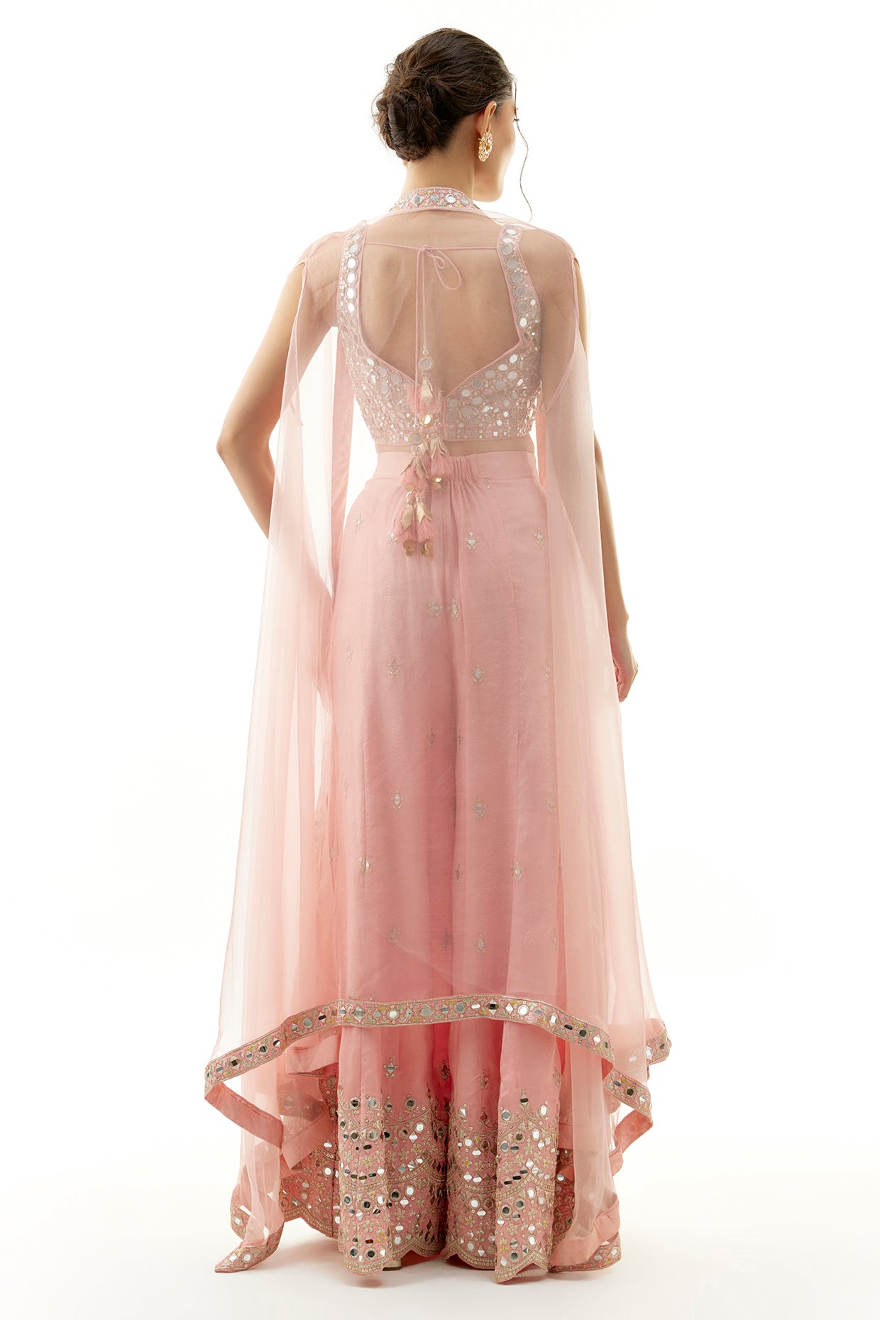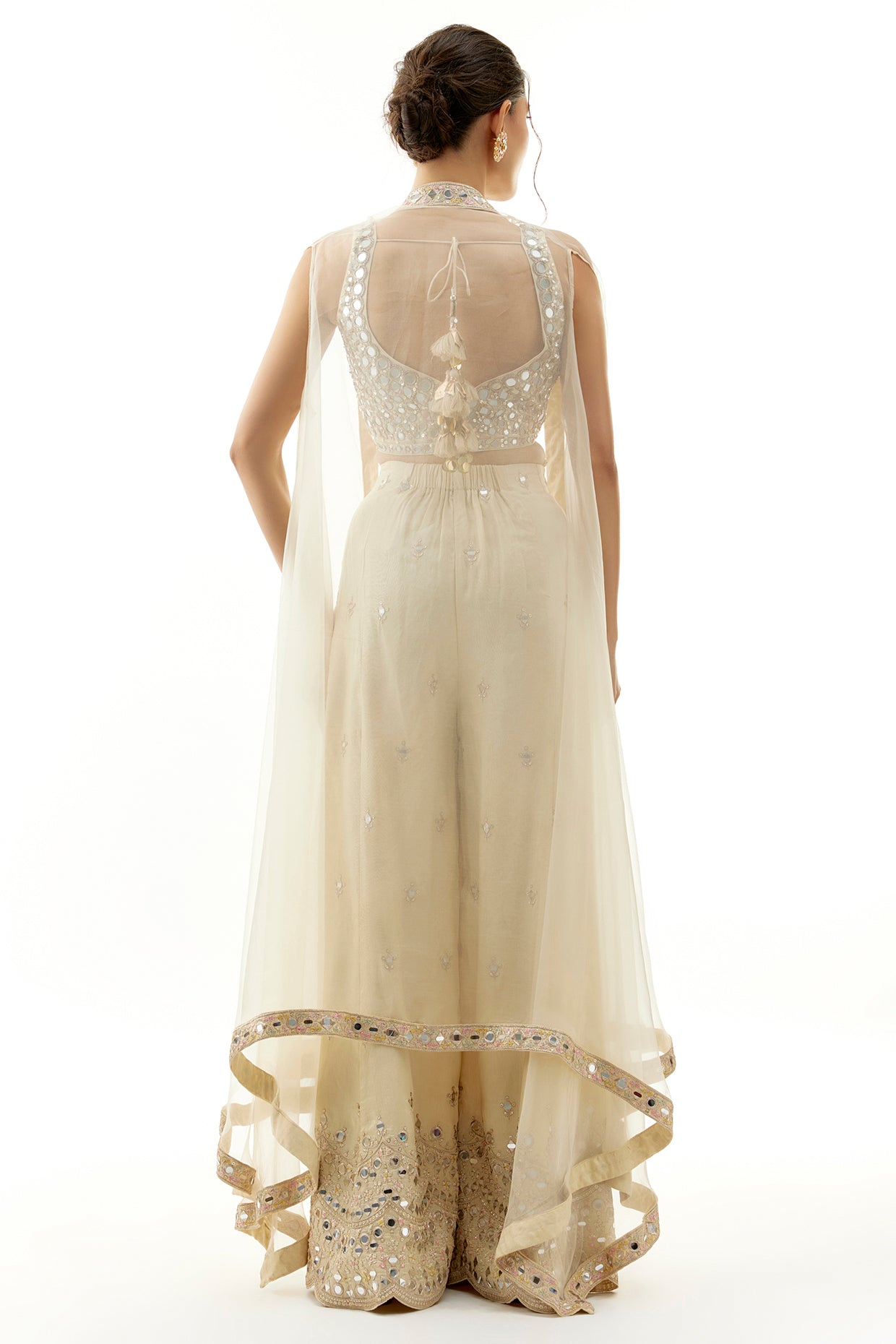 Featuring A Stunning Bralette With Intricate Hand Embroidery And Mirror Work. Paired With Flared Pants, The Ensemble Is Enriched With Scattered Embroidery And Heavily Embellished Hems. Completing The Look Is A Long Cape With Intricate Borders And Floral Motifs.