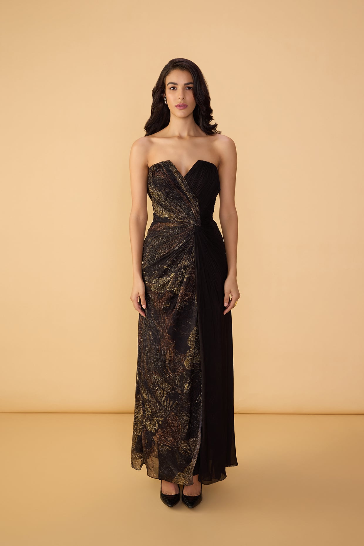 Part Floral Print Strapless Dress With Sweetheart Neck Line, Surplice Bodice, Knot Detailing And Customizable Slit.