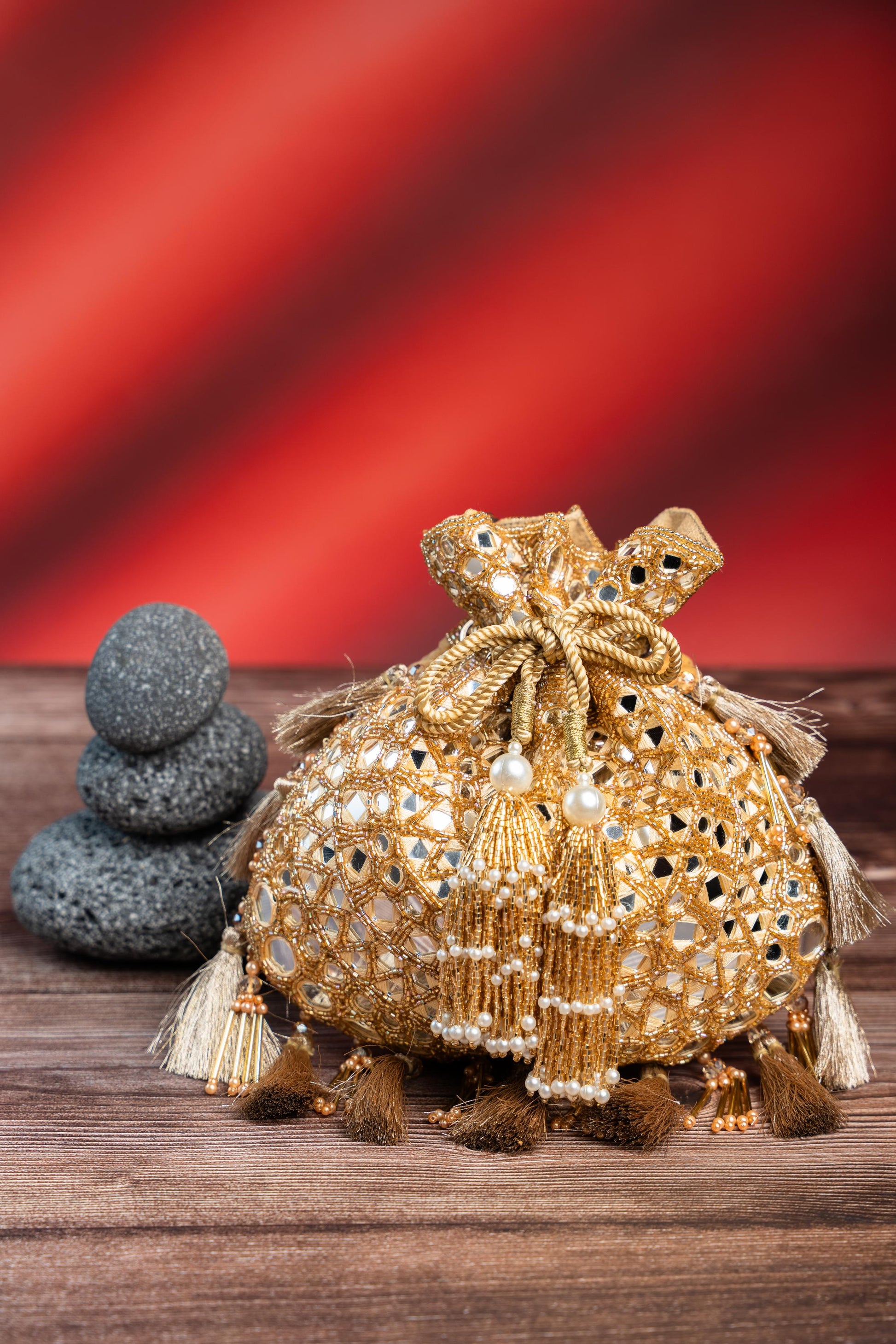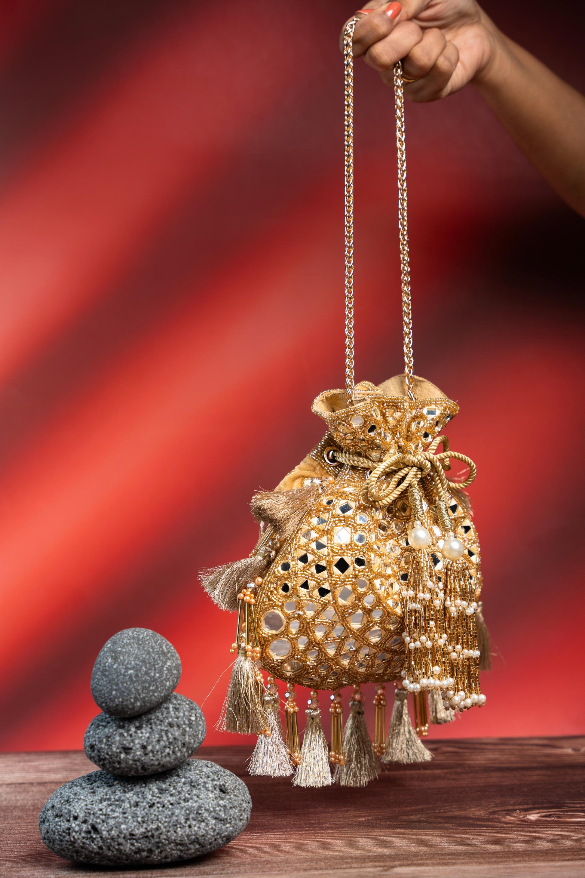 A Striking Accessory Featuring A Blend Of Mirror And Abla Work In Gold, Beautifully Accented With A Gold Finishing. The Potli Is Completed With Intricate Bead Work, Making It A Perfect Choice For Adding A Touch Of Sophistication To Any Special Occasion.