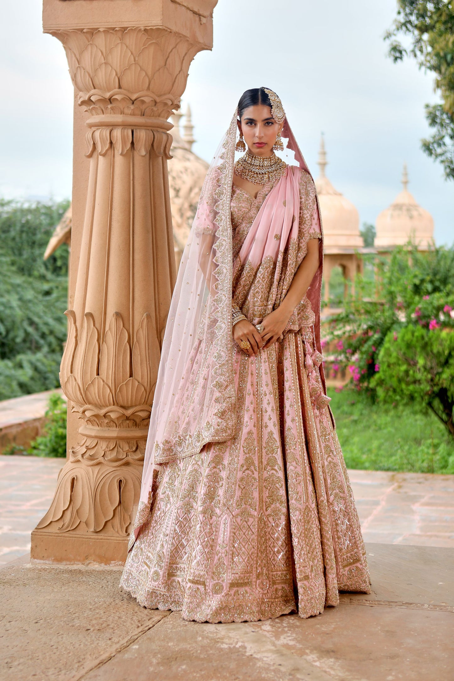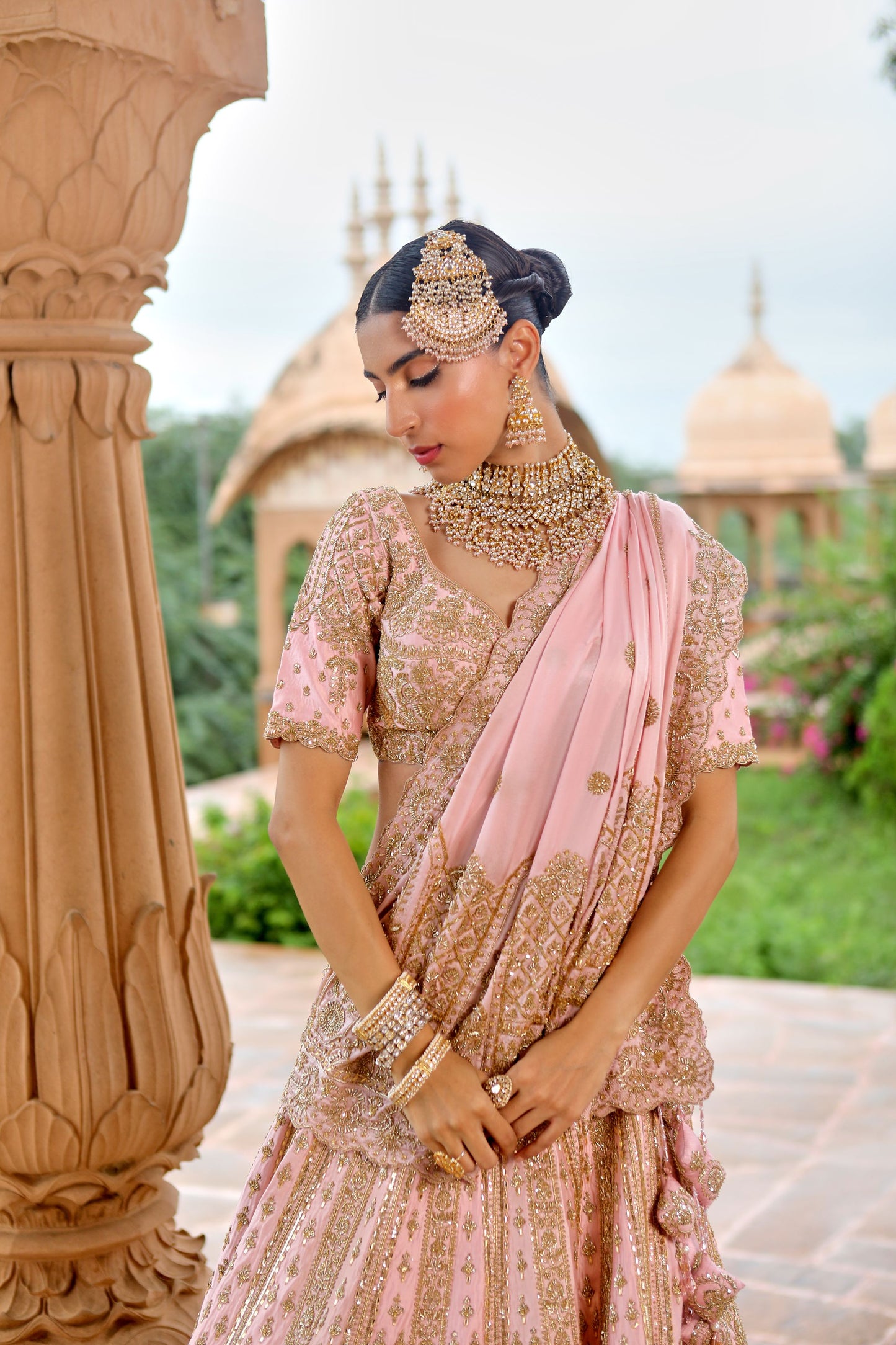 Embrace Your Special Day With This Captivating Baby Pink Dupian Silk Bridal Lehenga Set.