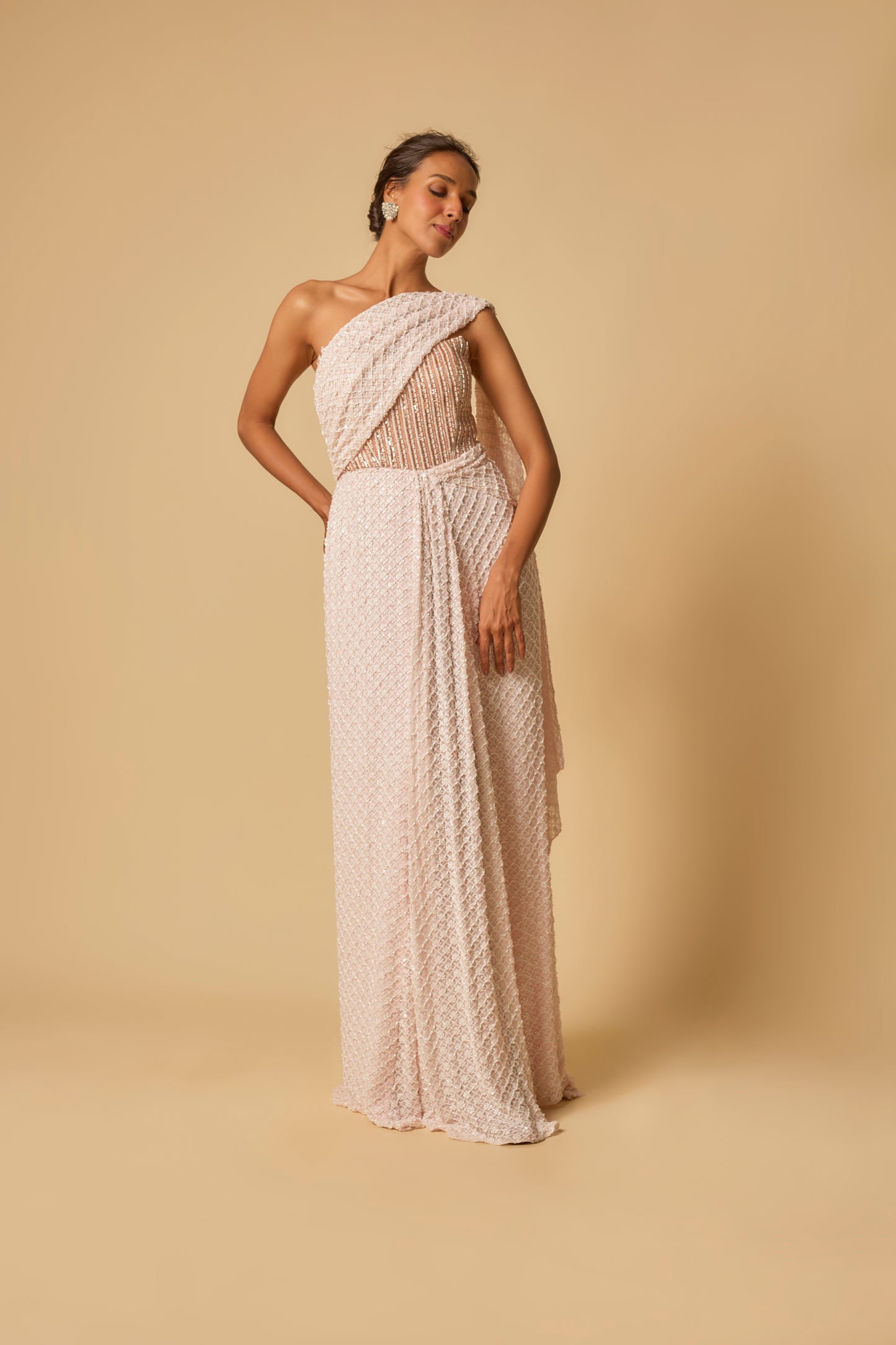 Featuring Baby Pink Heavy Embroidered Corset Gown Drape Saree In Mashroo And Georgette.