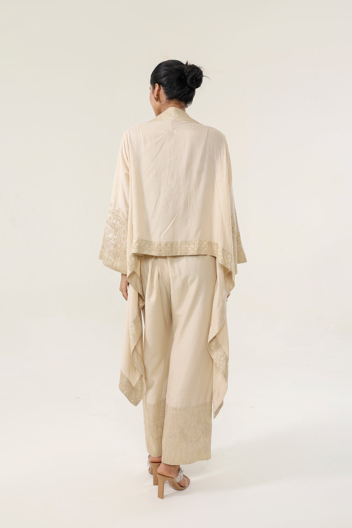 The Set Consists Of A Flowing Cape, A Bralette, And Elegant Pants, All Carefully Designed To Work Together In Perfect Harmony. The Base Of The Ensemble Is Made From Luxurious Kora Munga Fabric, That Drapes Beautifully On The Body And Regal Accents Of Banarsi Munga. This Stunning Ensemble Is Designed To Make A Statement, With Its Unique Blend Of Traditional Craftsmanship And Modern Sophistication.