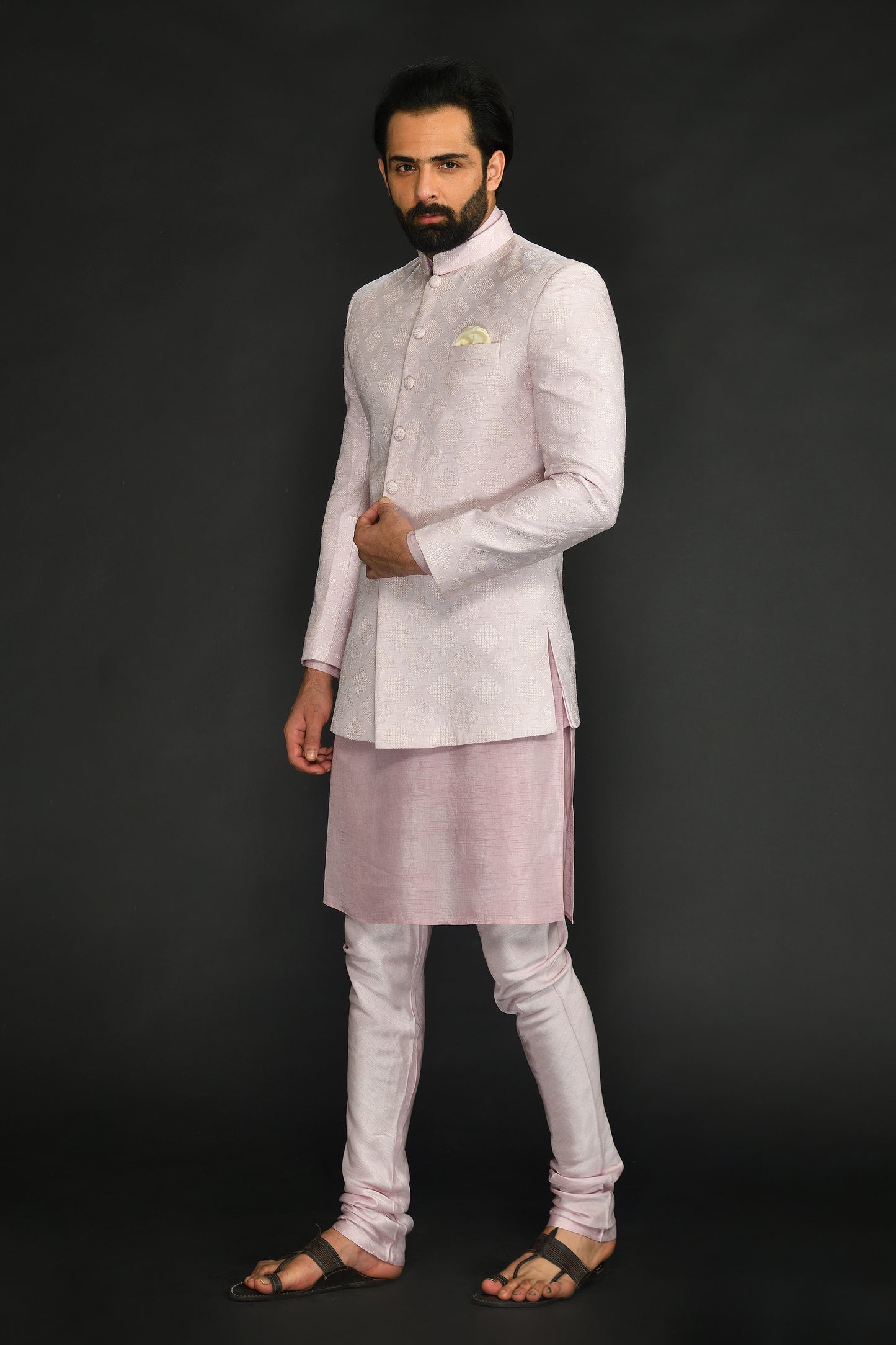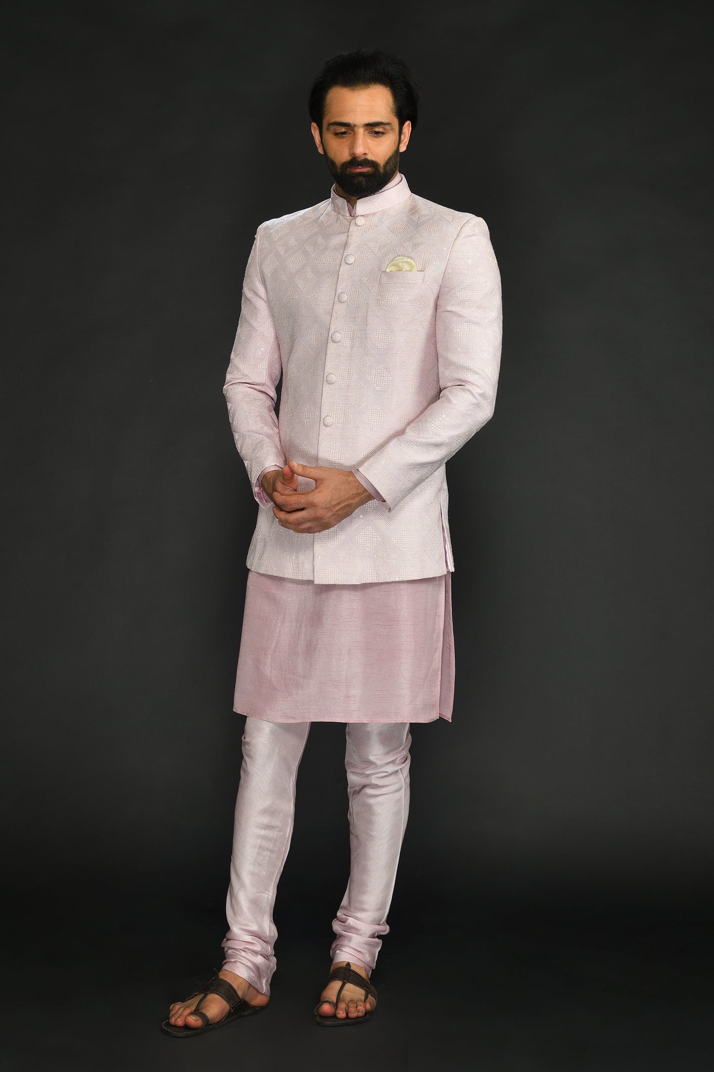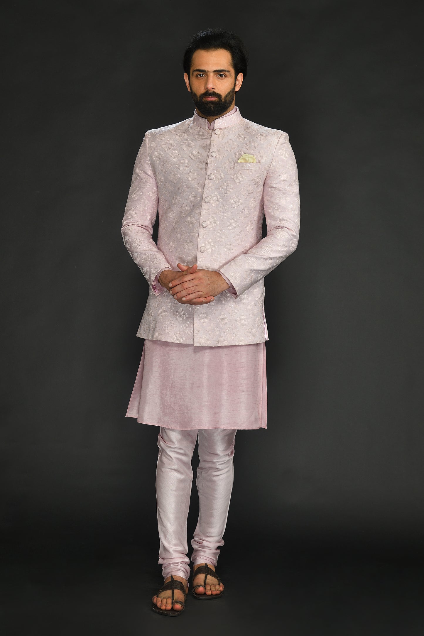 A Powder Pink Bandhgala Textured Jacket Based On Viscose Silk And Spun Cotton Features Mirror Embroidery. It Is Paired With A Matching Kurta And Slim Pants.