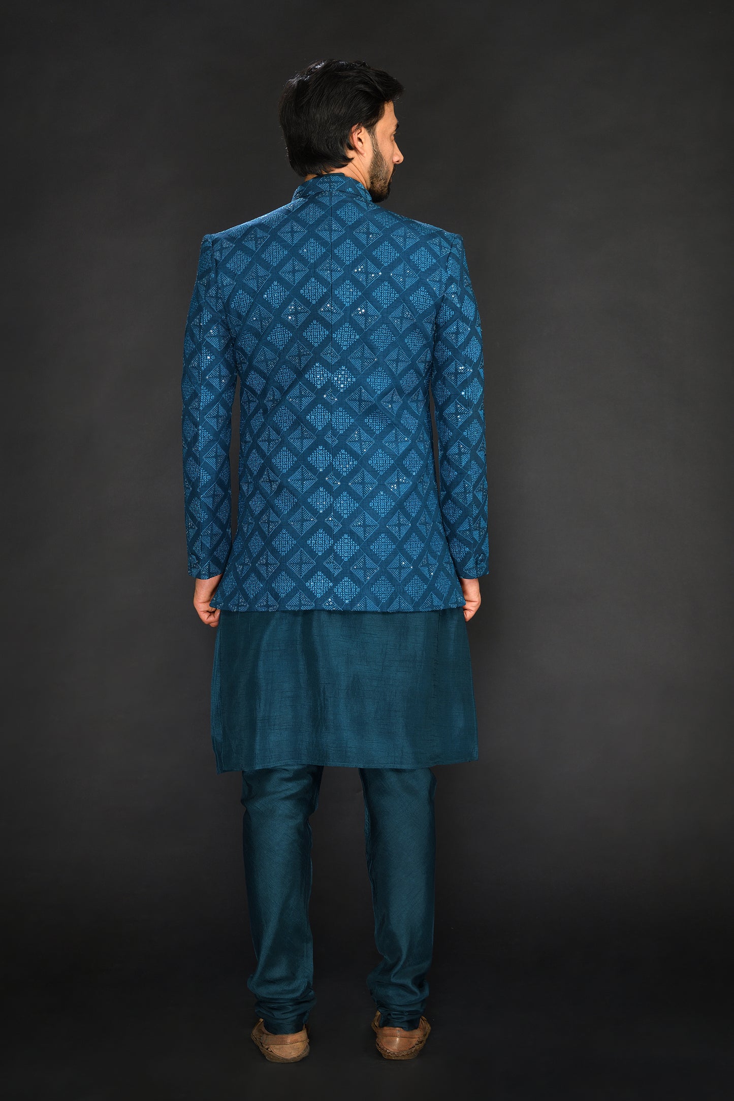 A Teal Green Bandhgala Jacket Based On Viscose Silk And Spun Cotton Features Textured Geometric Jaal. It Is Paired With A Matching Long Kurta And Slim Pants.