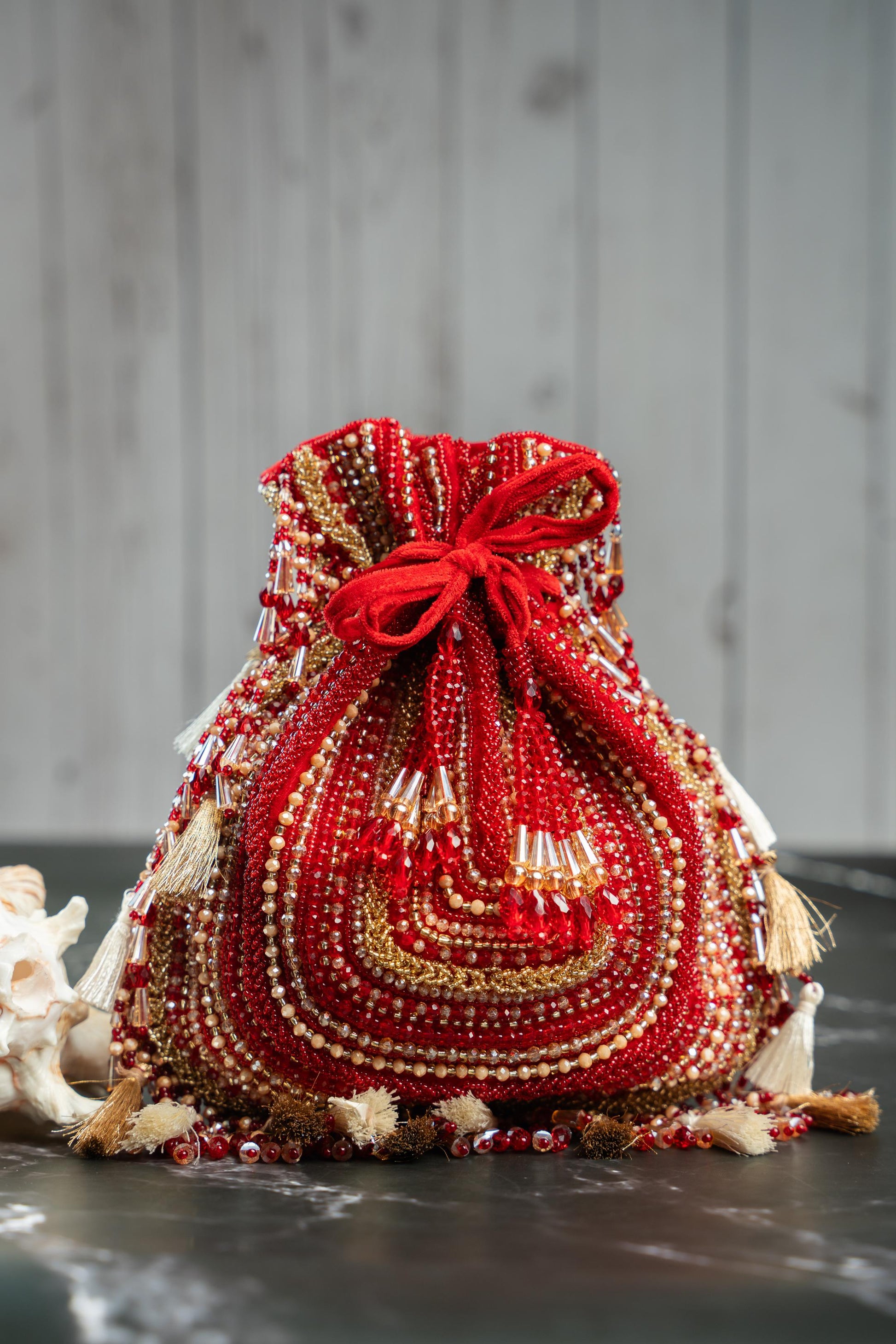 The Baraq Potli Is A Stunning Blend Of Elegance And Craftsmanship, Featuring Lustrous Beads And Intricate Work In A Maroon And Gold Palette. Finished With Delicate Tassels, It’S The Perfect Accessory For Weddings, Festive Events, Or Evening Soirées.