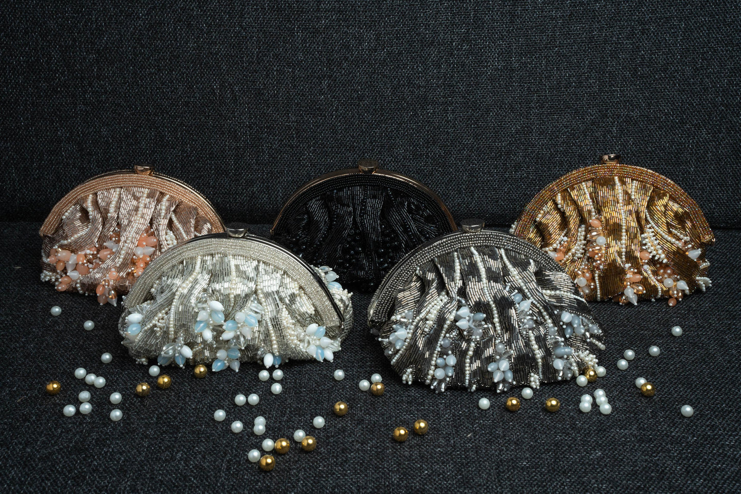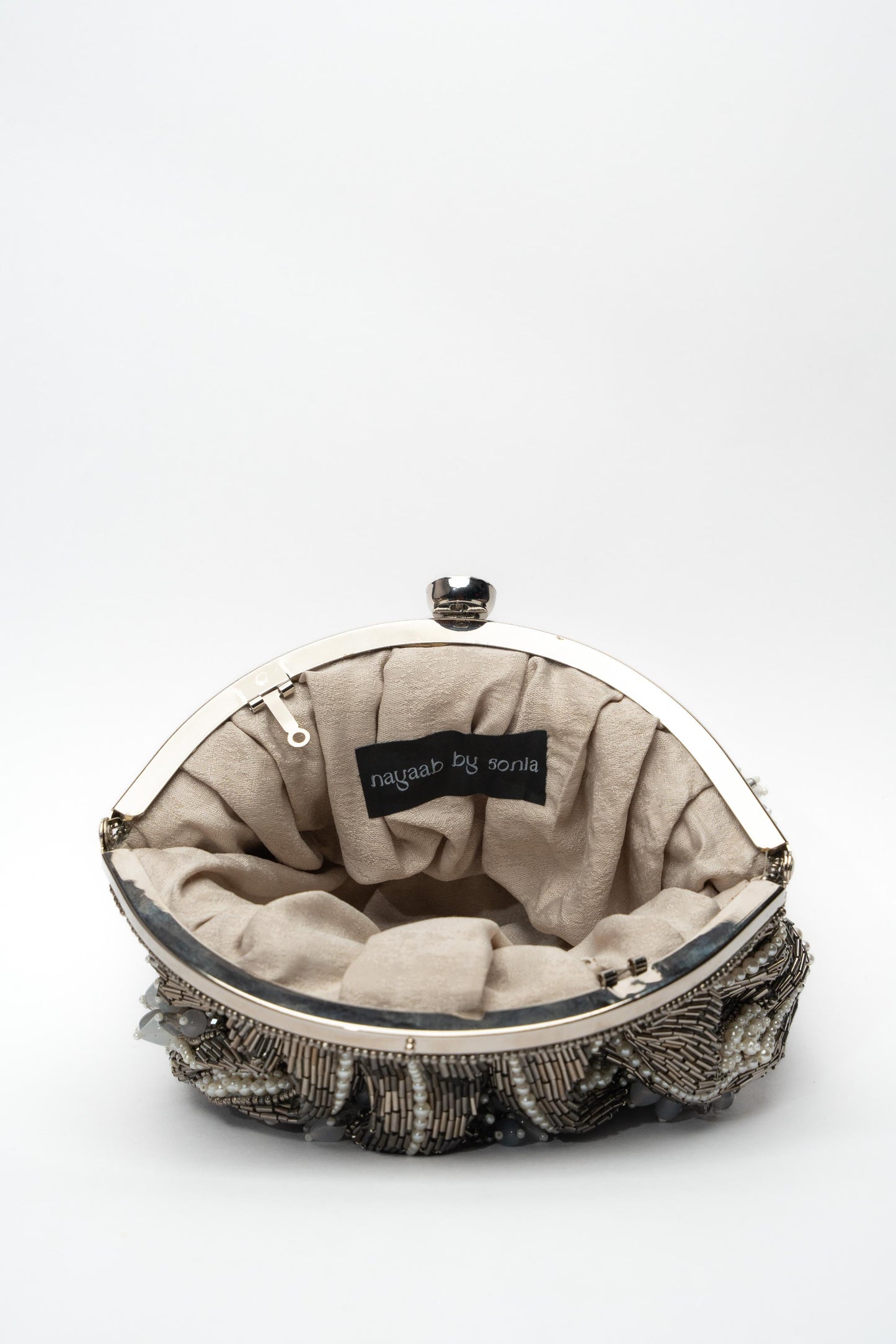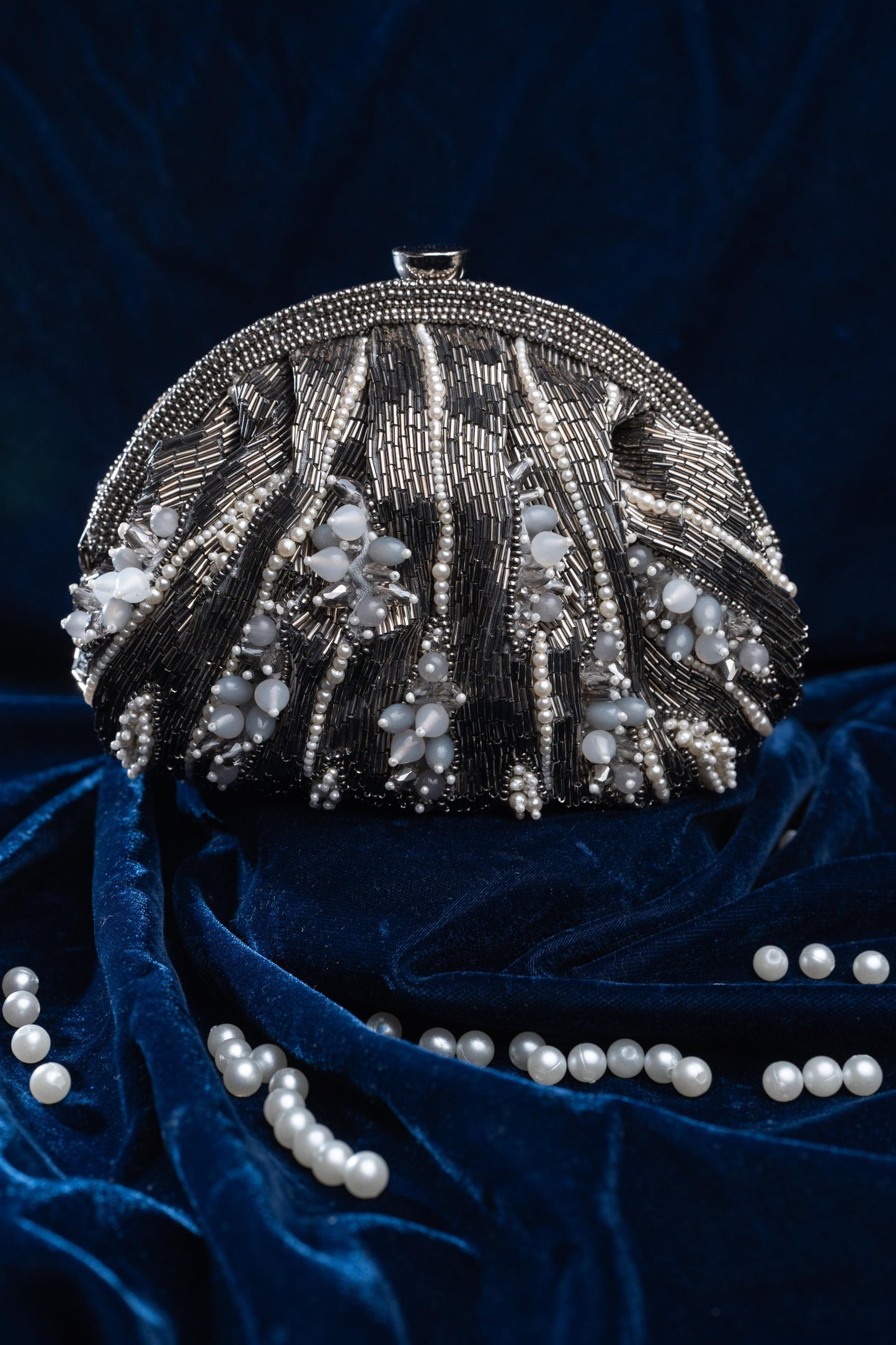 A Chic Yet Stand Out Piece Dressed With Beads In Shades Of Silver And Grey That Come Together With A Beaded Studded Frame Finish And A Beaded Tassel Handle.