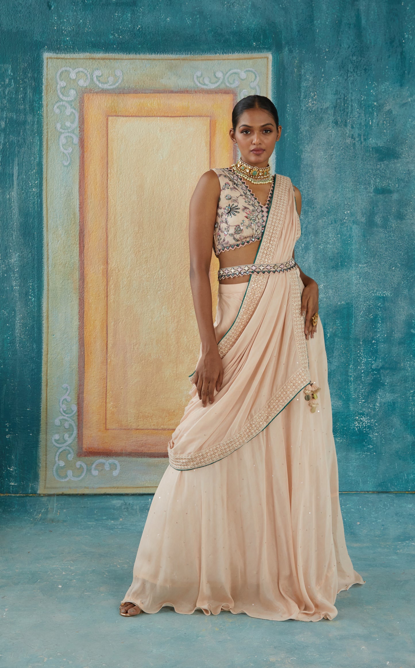 Beige Plain Draped Saree With Printed Hand Embroidery Blouse Along With Soft, Flowly Chiffon Saree And Embroidery Saree Belt.