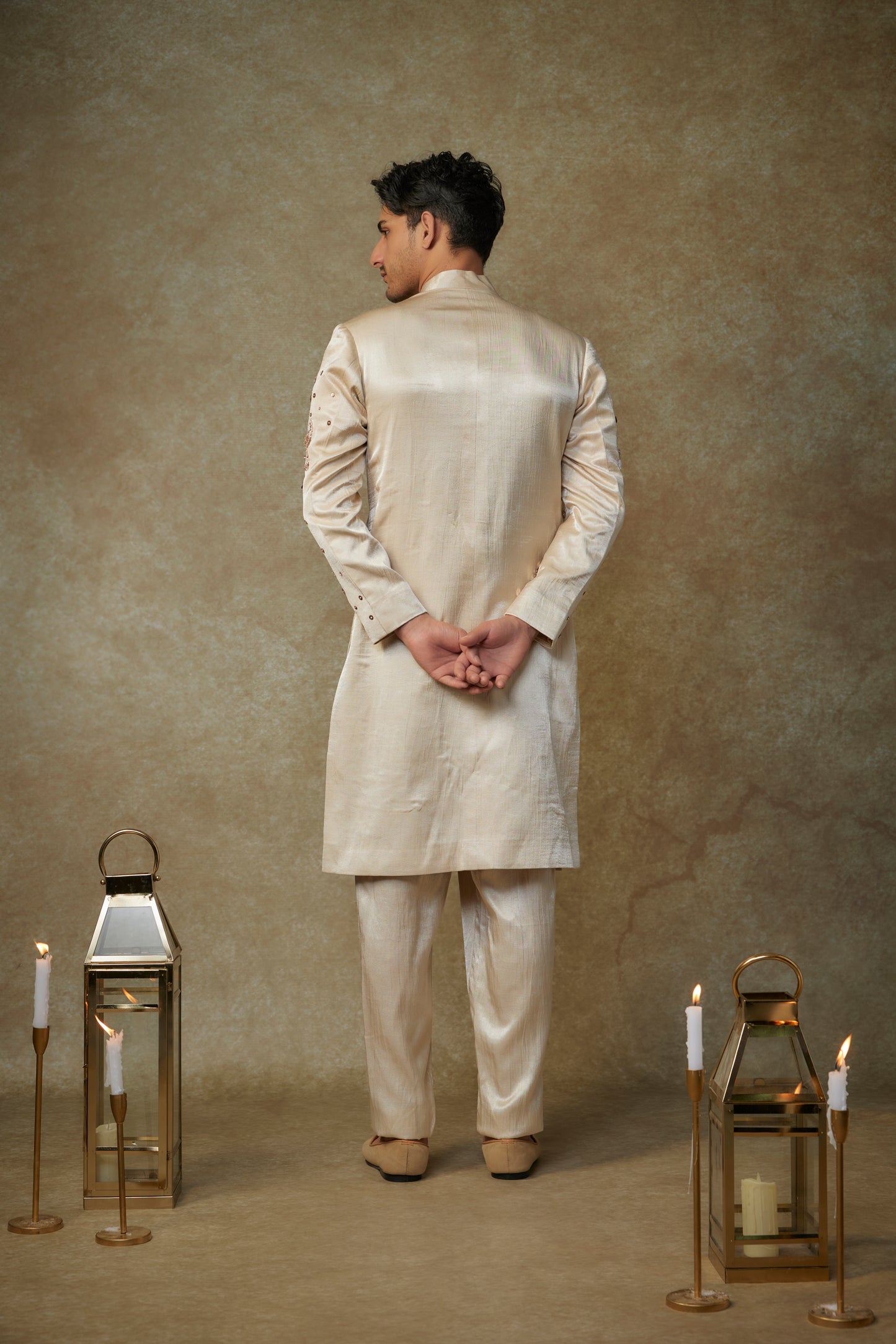 Featuring Beige Mashroo Embroidered Sherwani With Mashroo Pant.