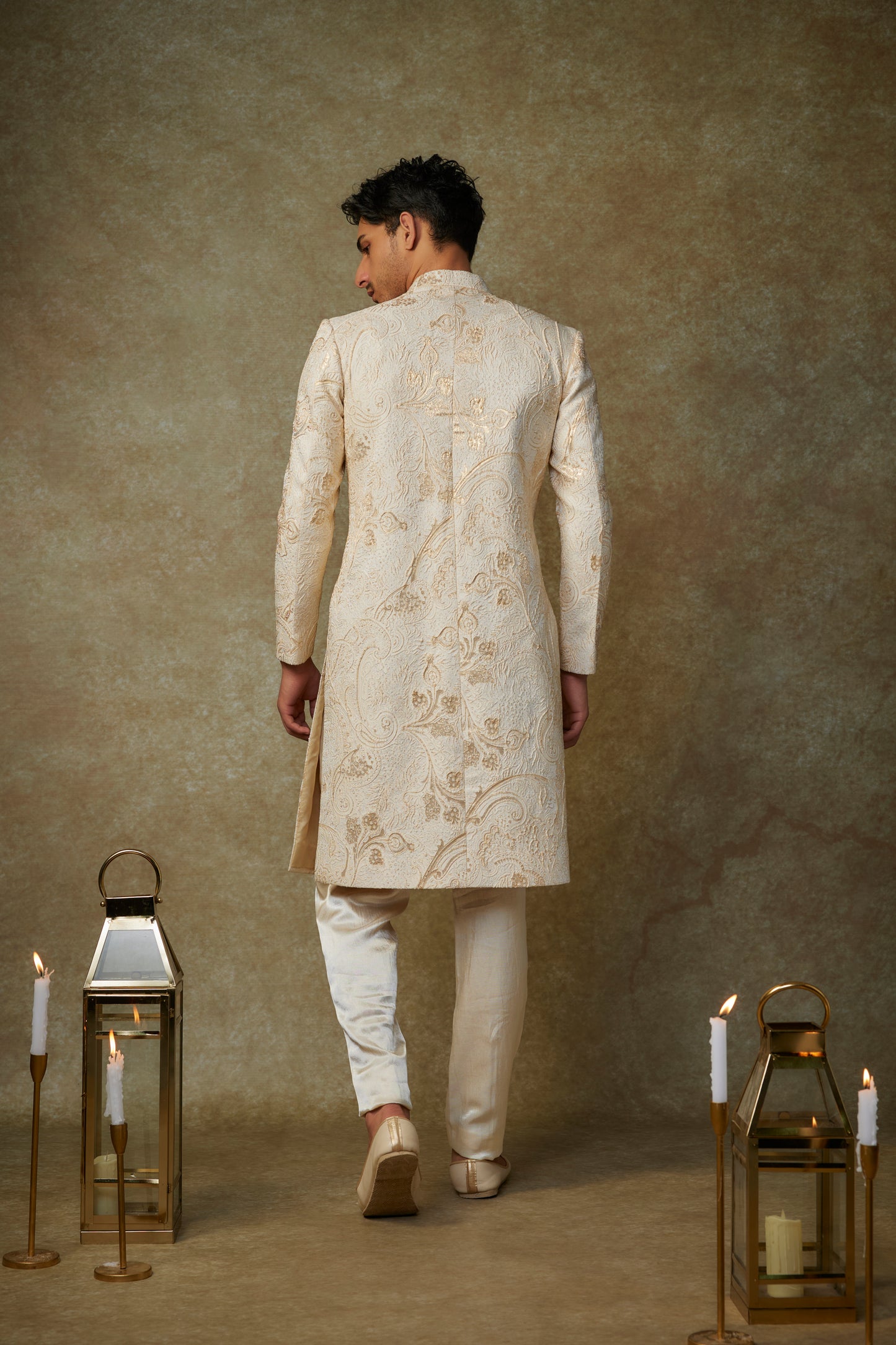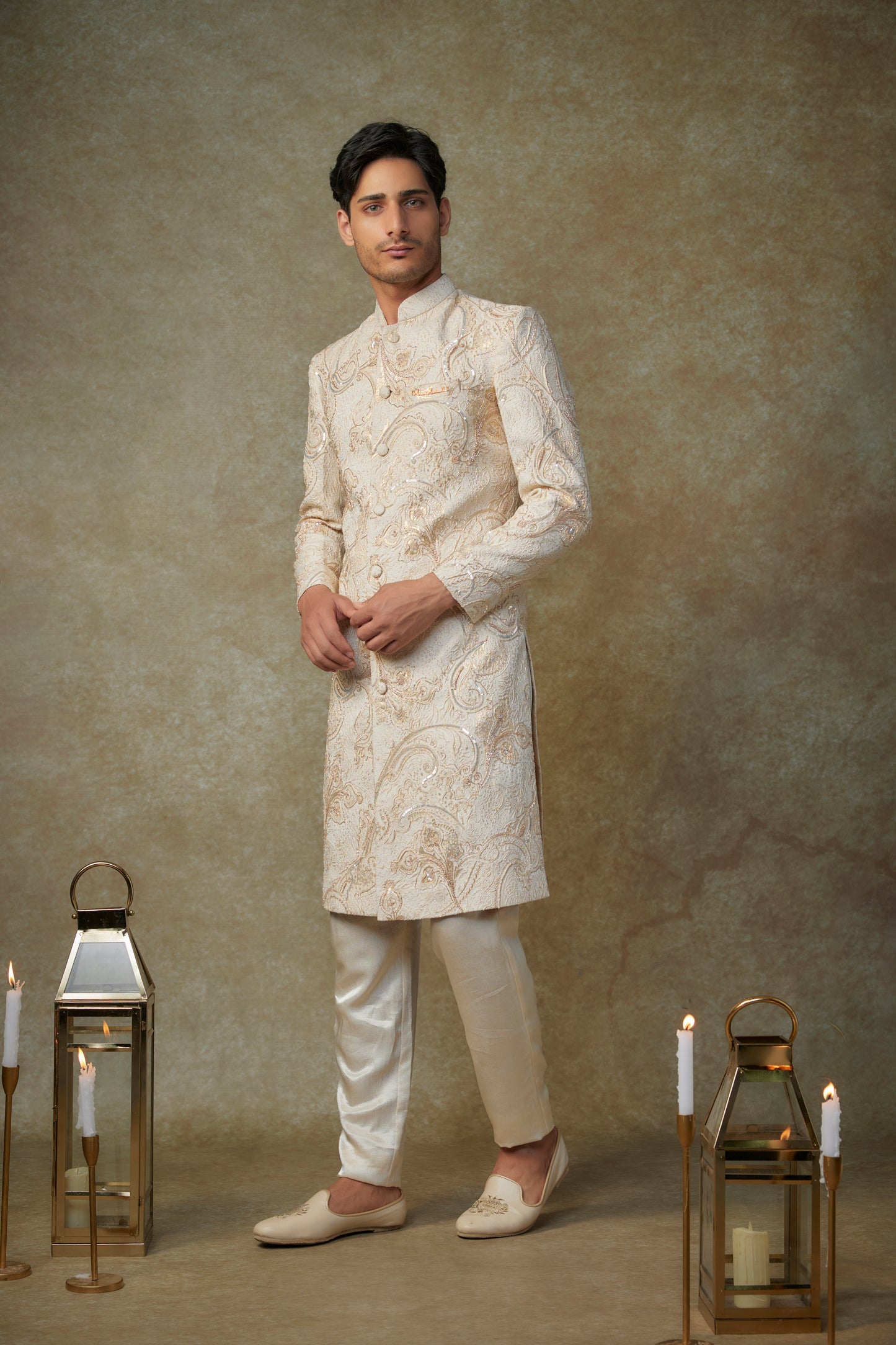 Featuring Beige Jacquared Embroidered Sherwani With Mashroo Pant.