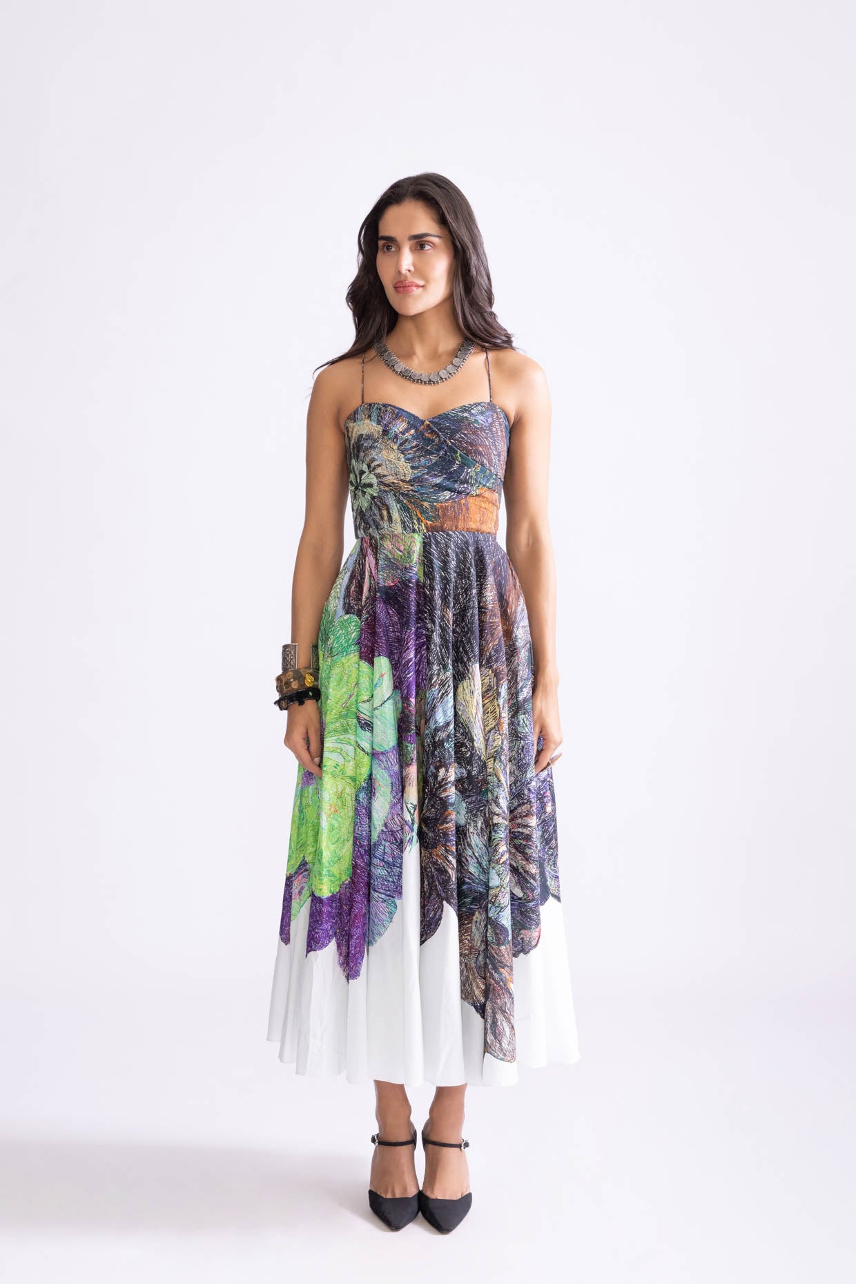 Daisy Print Surplice Bodice Midi Dress With Noodle Straps.