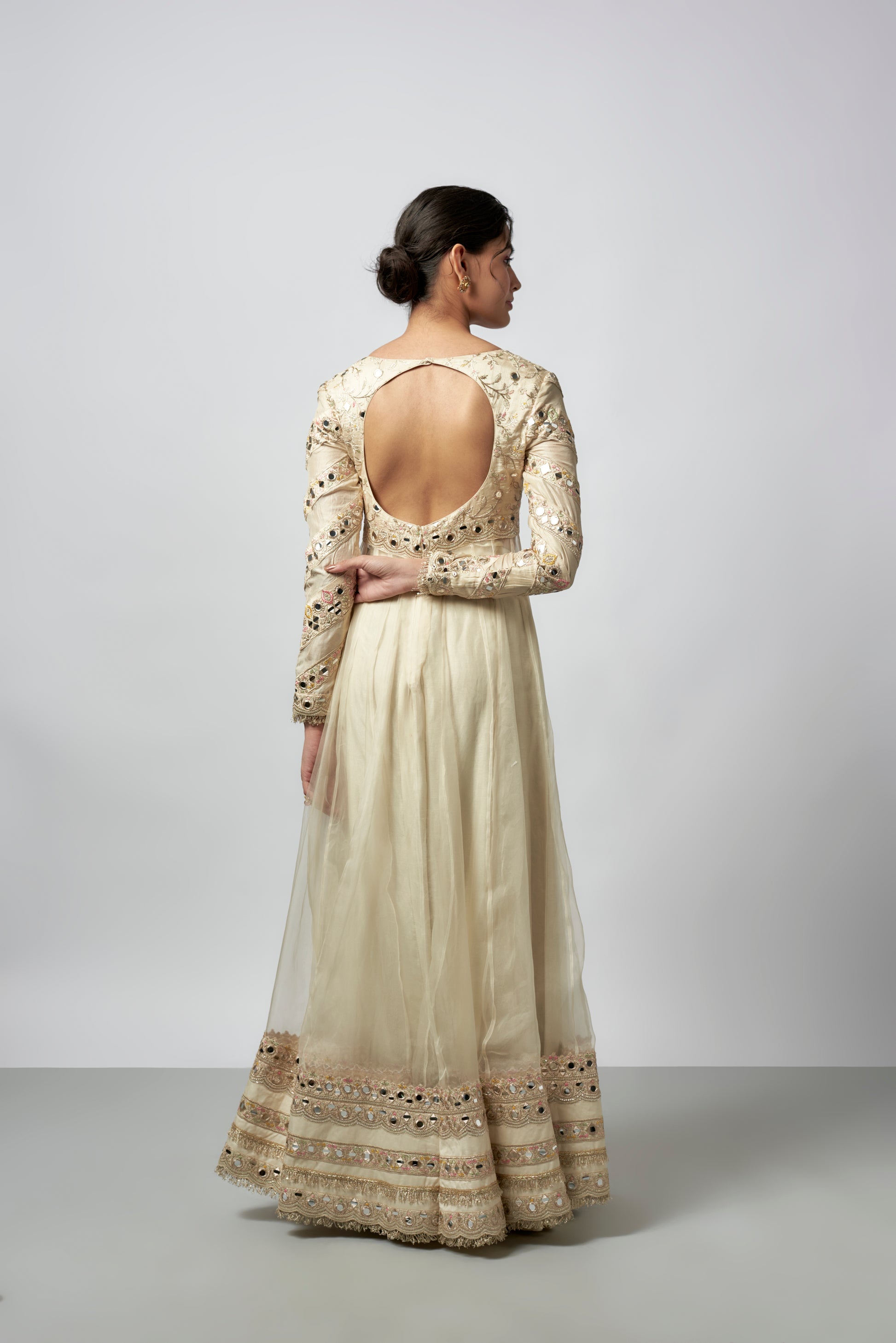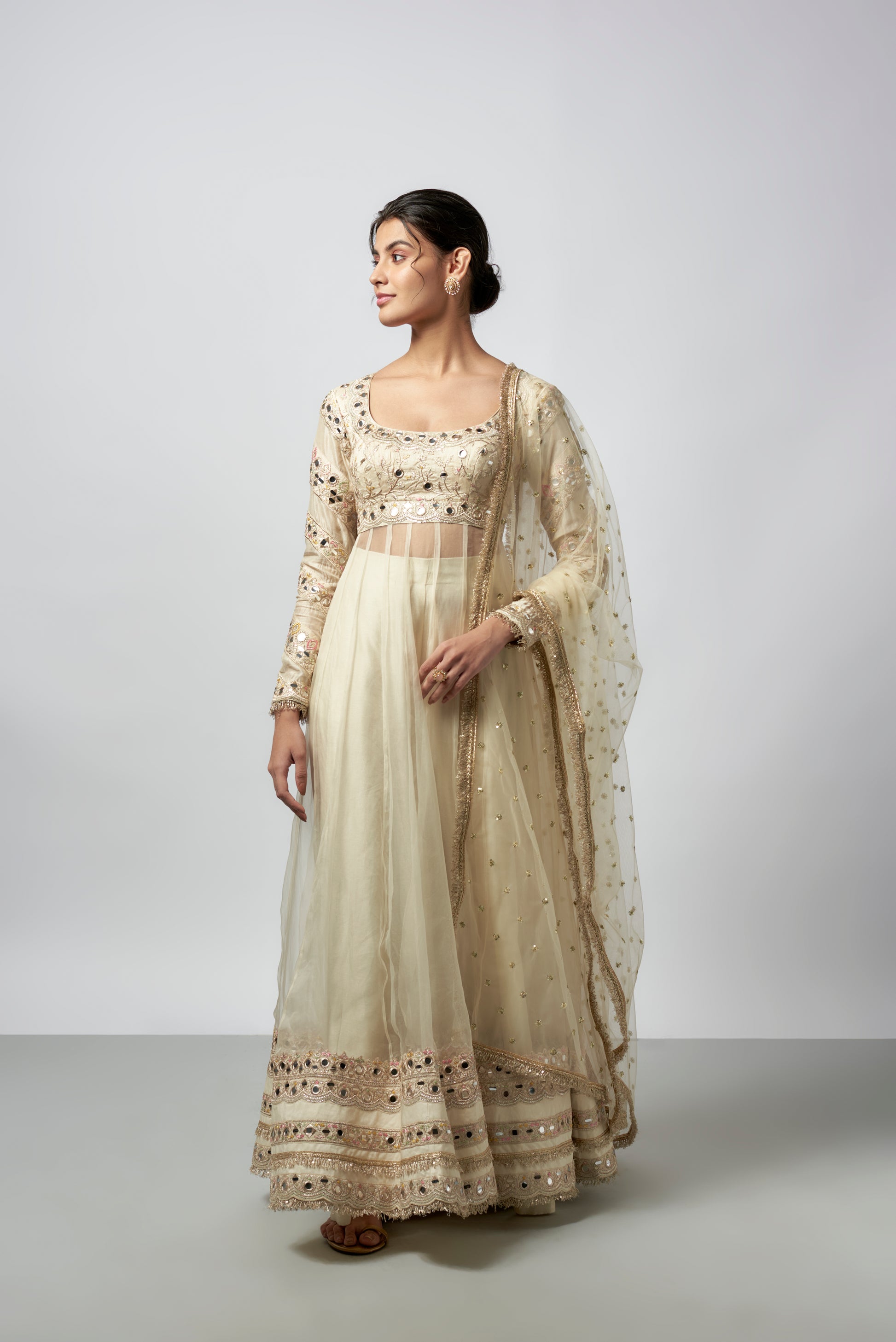 This Elegant Anarkali Features Intricate Embroidery With Mirror Detailing And Delicate Patterns. The Long Sleeves Mirror The Embroidery On The Bodice. A Matching Net Dupatta With Subtle Sequins Drapes Gracefully Over The Shoulder.