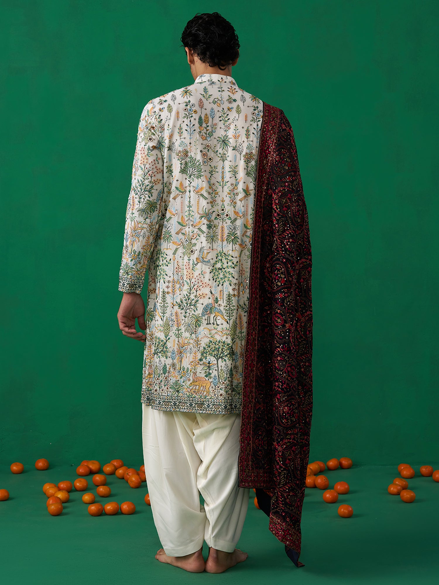 This Kurta Set Features A Long, Straight-Cut Kurta With Intricate All-Over Embroidery And Floral And Birds-Inspired Motifs, Paired With Patiyala-Style Bottoms That Add Volume And Comfort To The Silhouette. It Is Styled With A Contrasting Heavy Dupatta, Richly Adorned With Elaborate Embroidered Borders And Detailed Motifs, Bringing A Regal Touch To The Look. The Ensemble Combines Traditional Craftsmanship With A Statement-Making Presence, Perfect For Festive And Ceremonial Occasions.