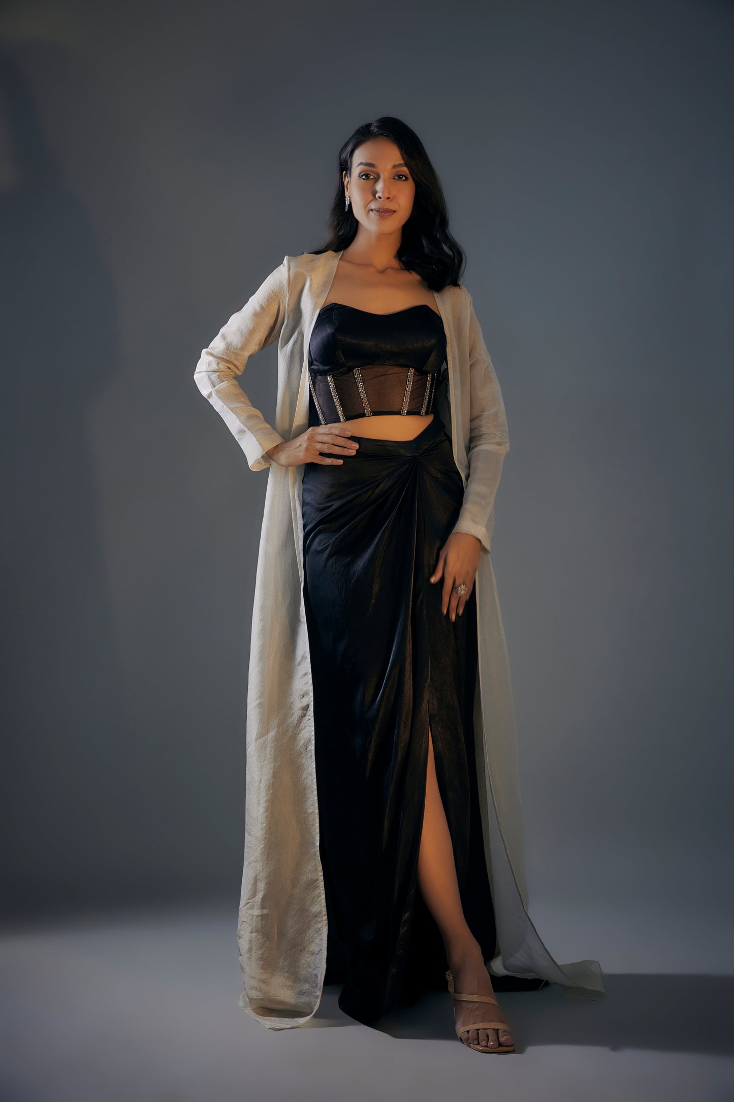 Featuring Black Embroidered Corset With Draped Skirt With Light Gold Block Jacket.