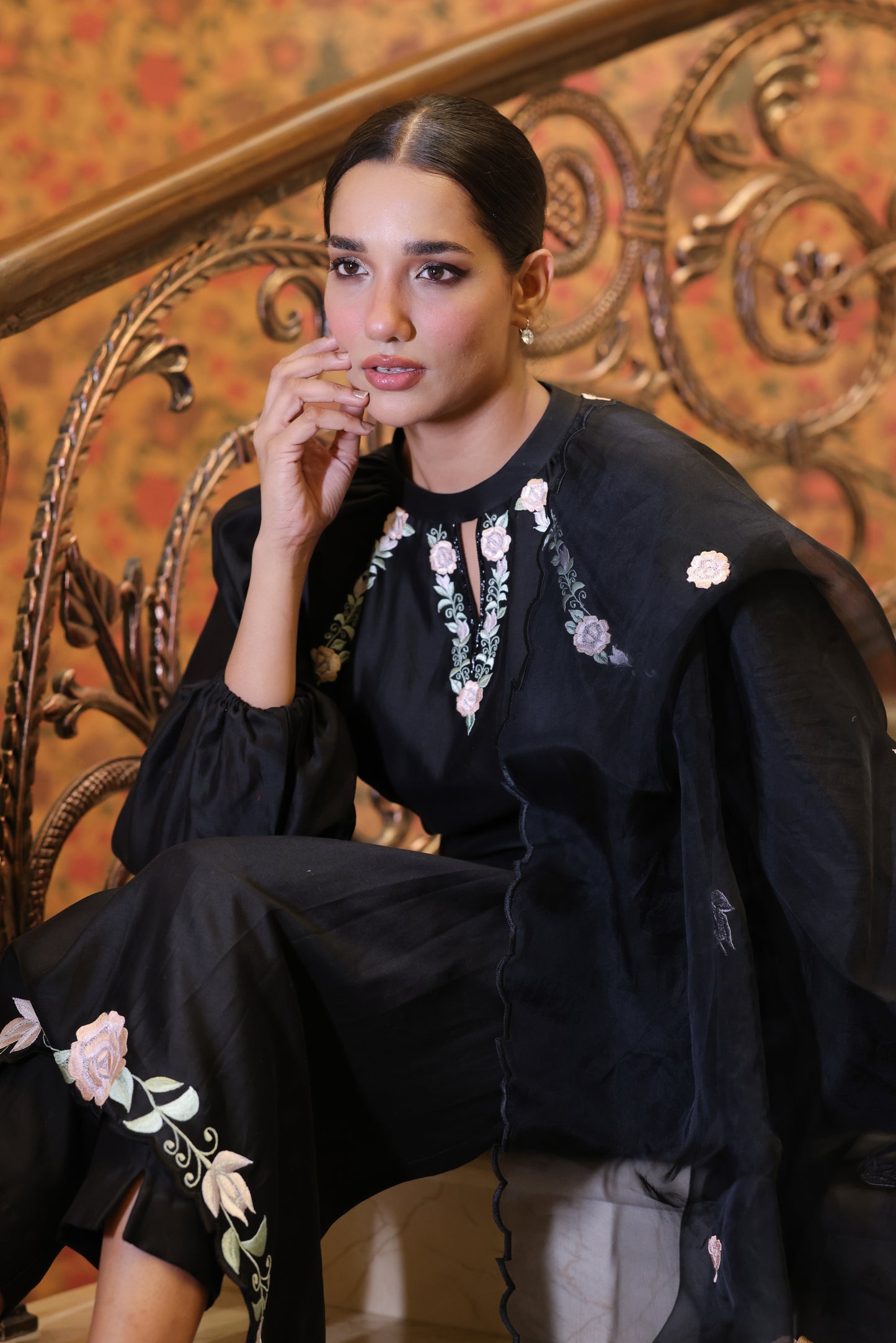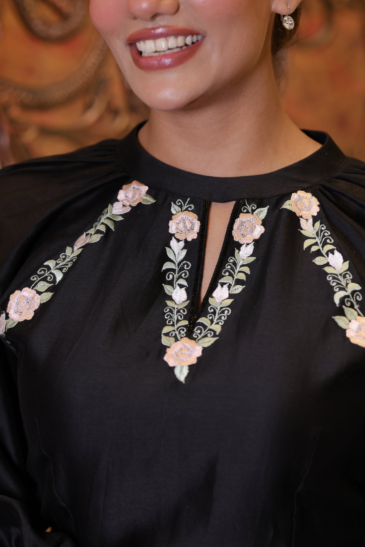 Black Halter Neck Kurta With Puff Sleeves Features Intricate Resham Embroidery Near The Neck And Damaan With Cut Dana Line Detailing.