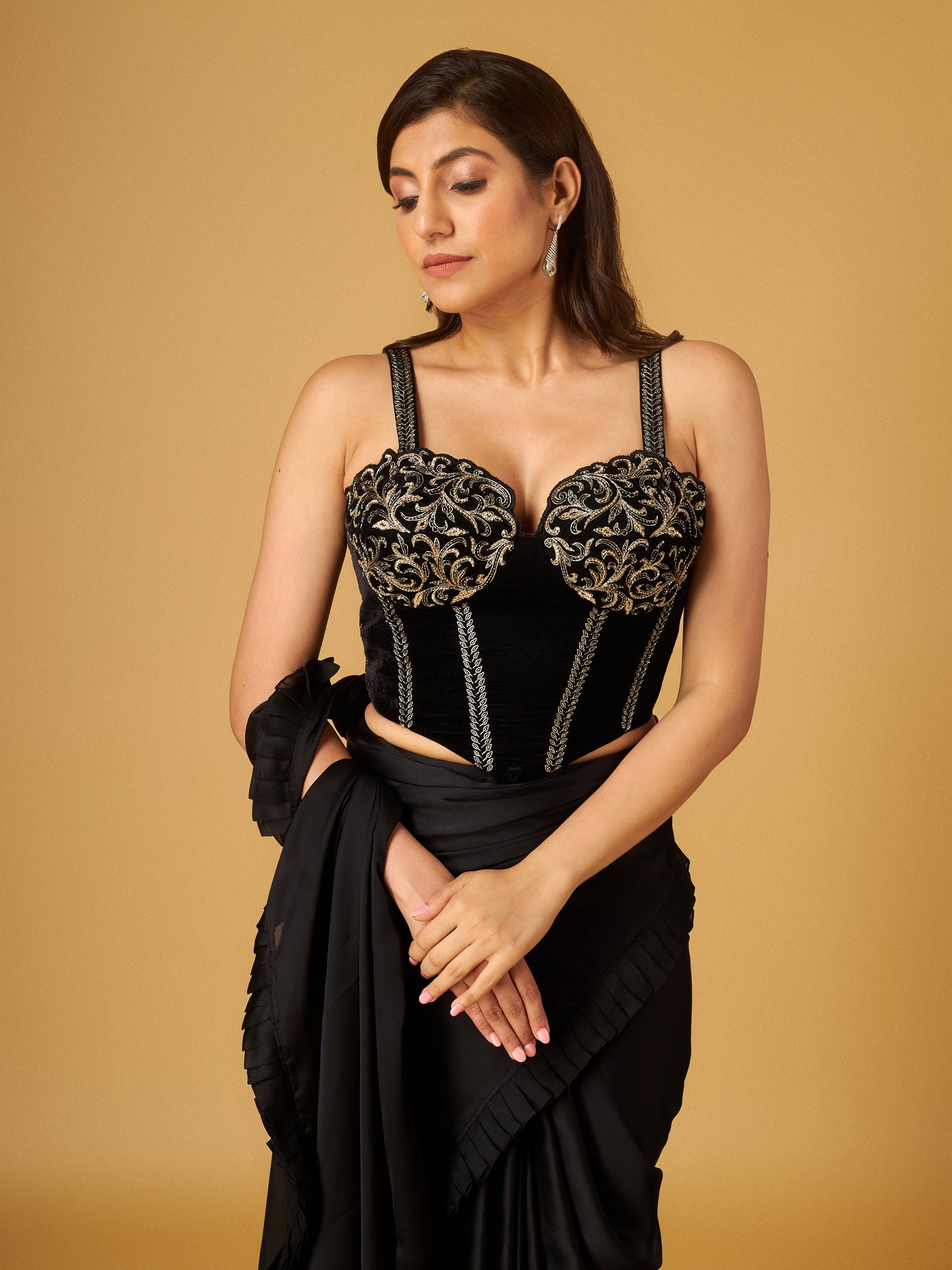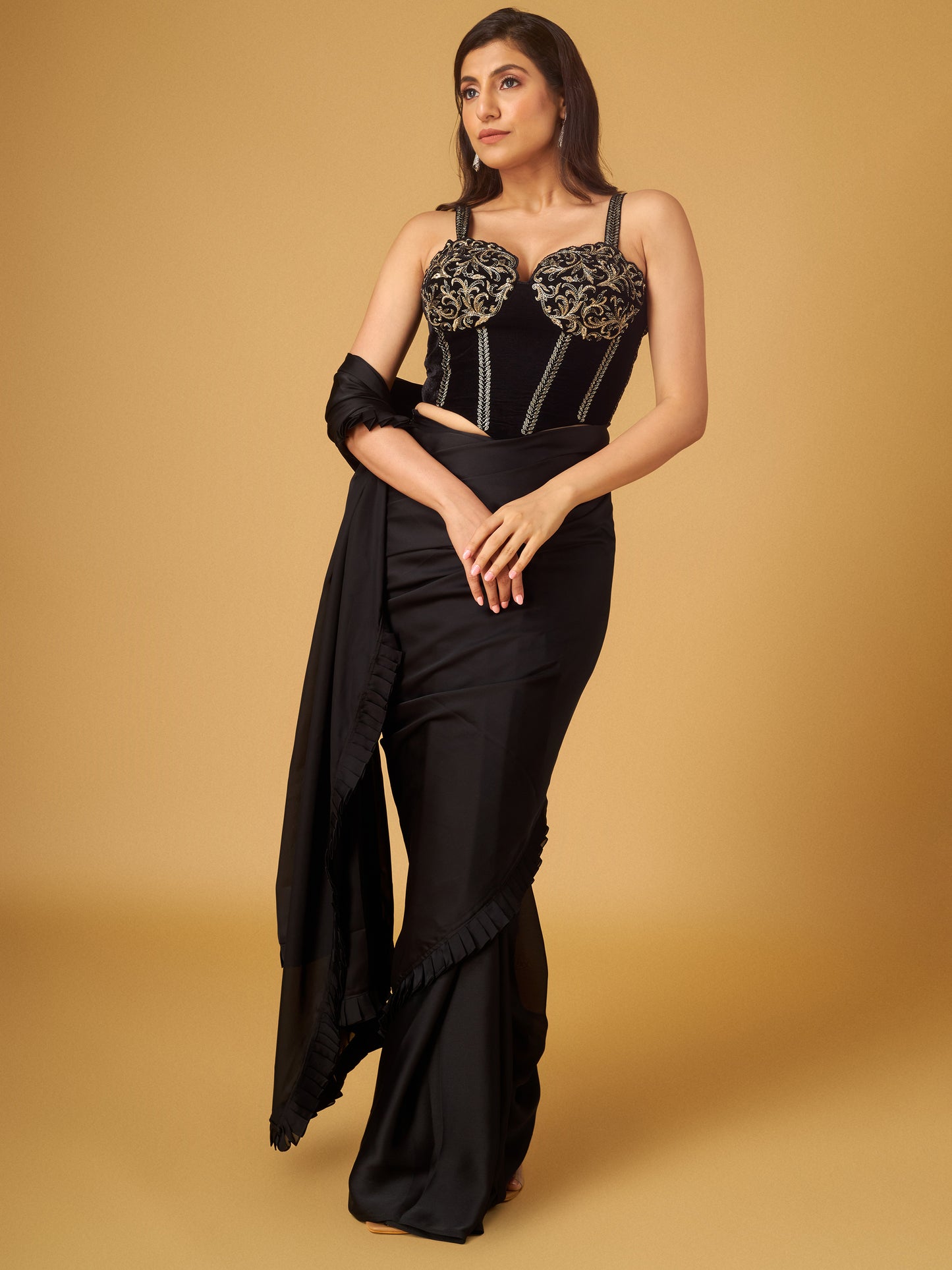 Black Pre-Stitched Saree In Satin Georgette Base With Frill Details. It Is Paired With A Black Corset In Velvet Base With Dori And Sequins Embroidery.