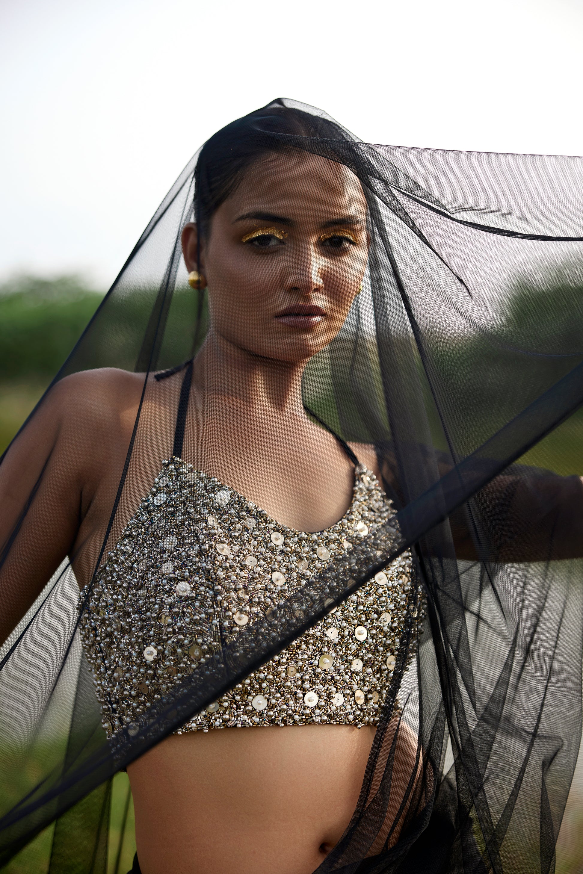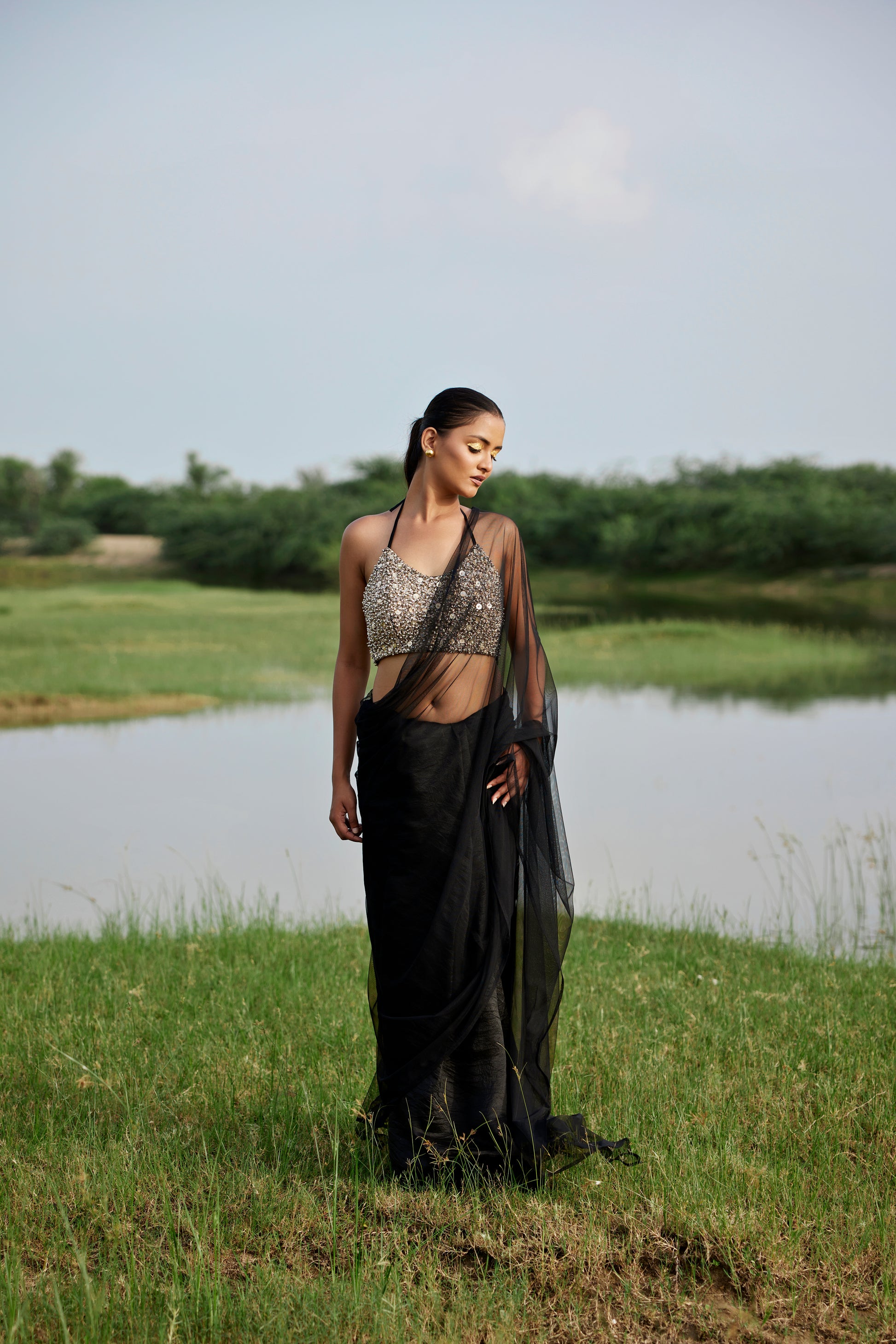 Kora Silk & Net Half & Half Black Saree Paired With A Heavily Embroidered Blouse For Women.