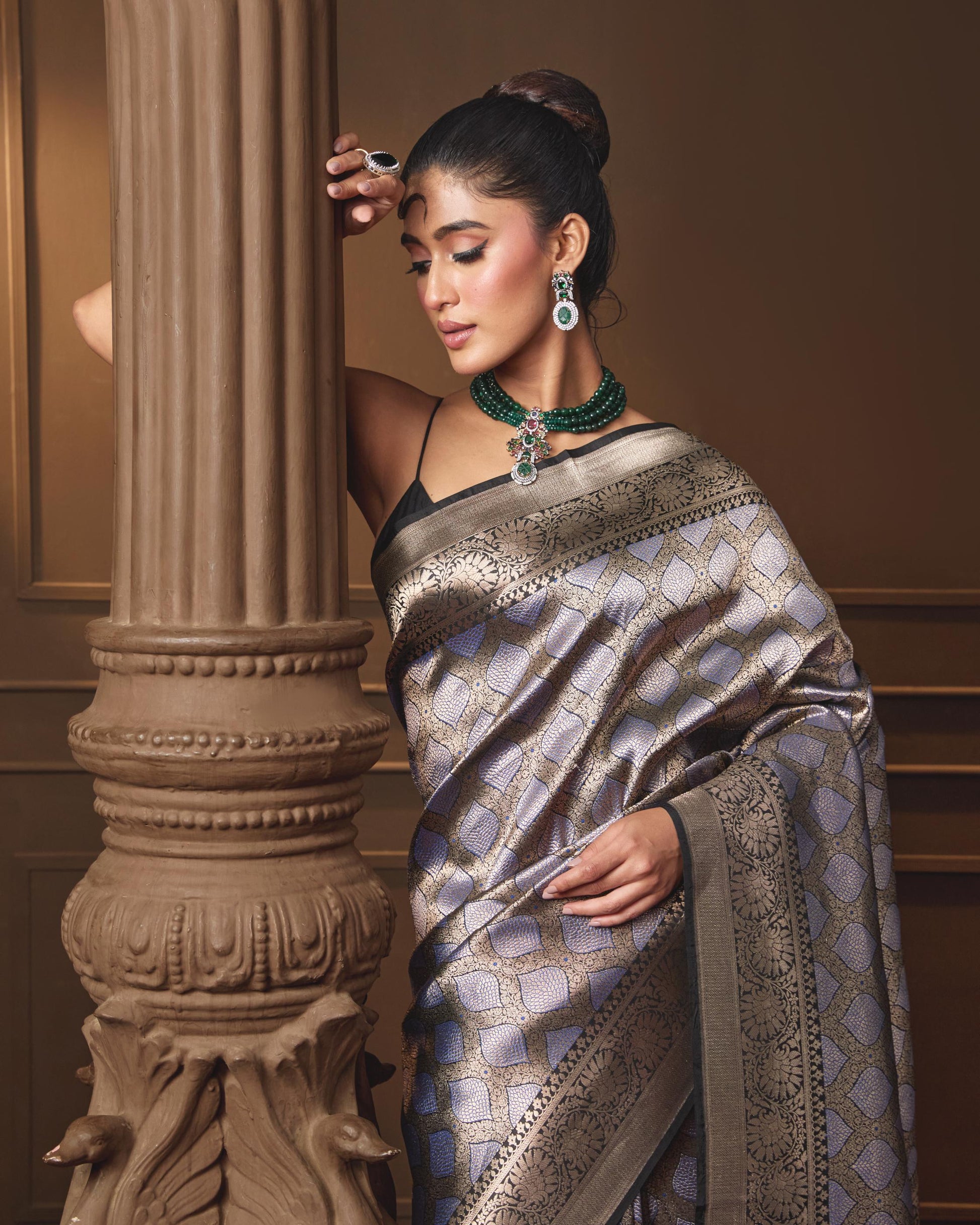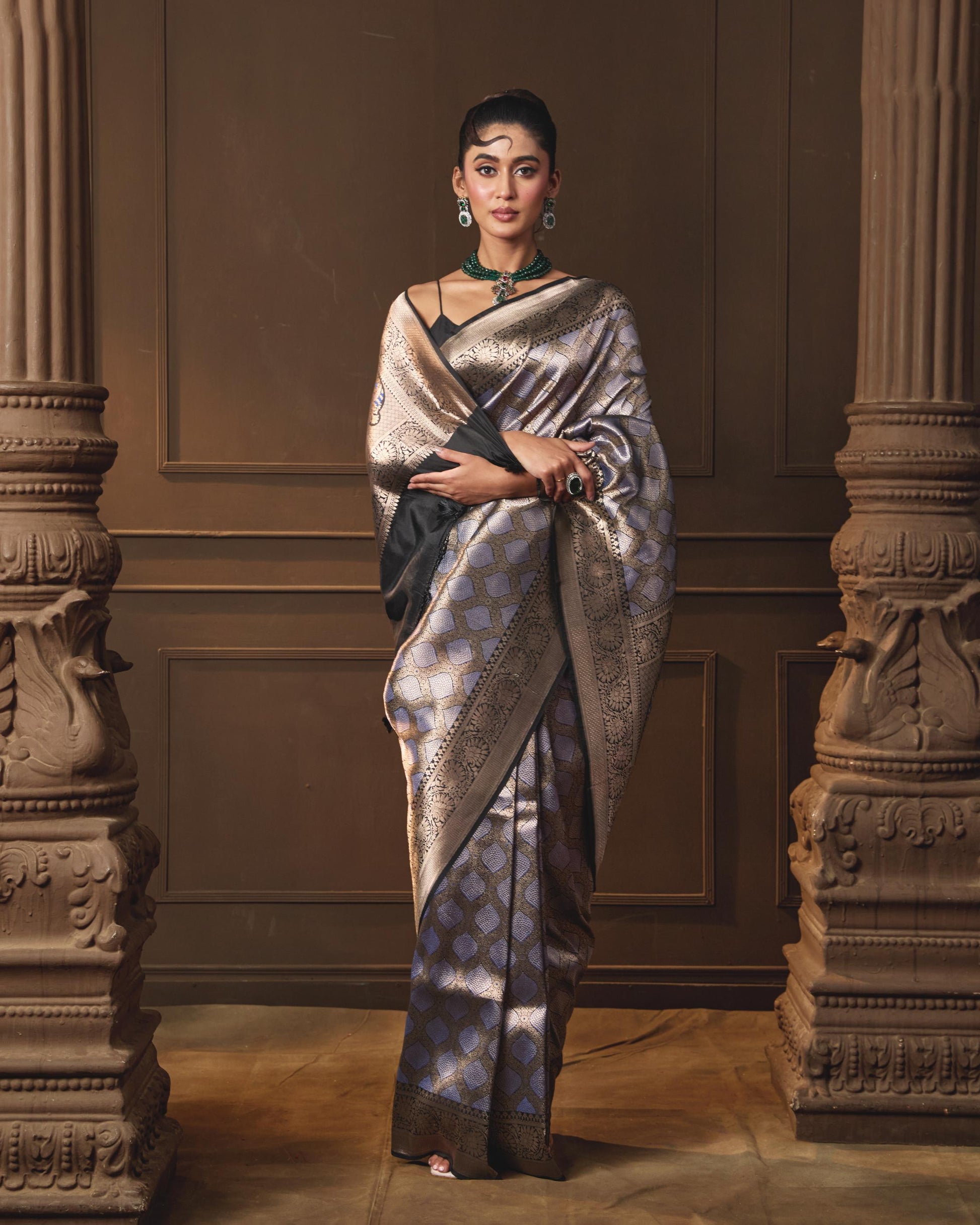 Black Brocade Saree With Blue Woven Motifs With Running Blouse.