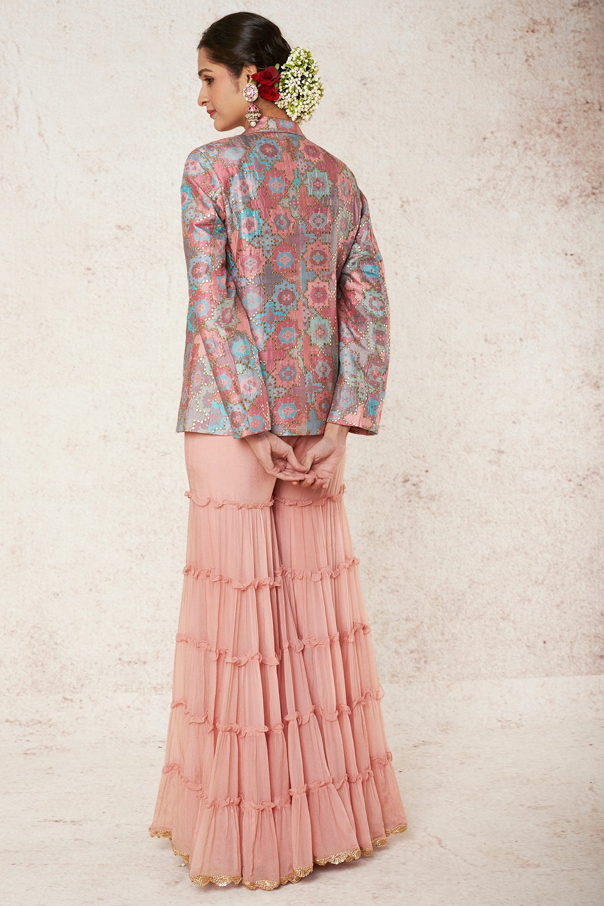 Fitted Blazer Featuring Qutub Print In The Hues Of Soft Pink, Blue And Lilac With Delicate Gold Embroidery Is Paired With Tiered Sharara Based On Georgette Emphazing Frills.