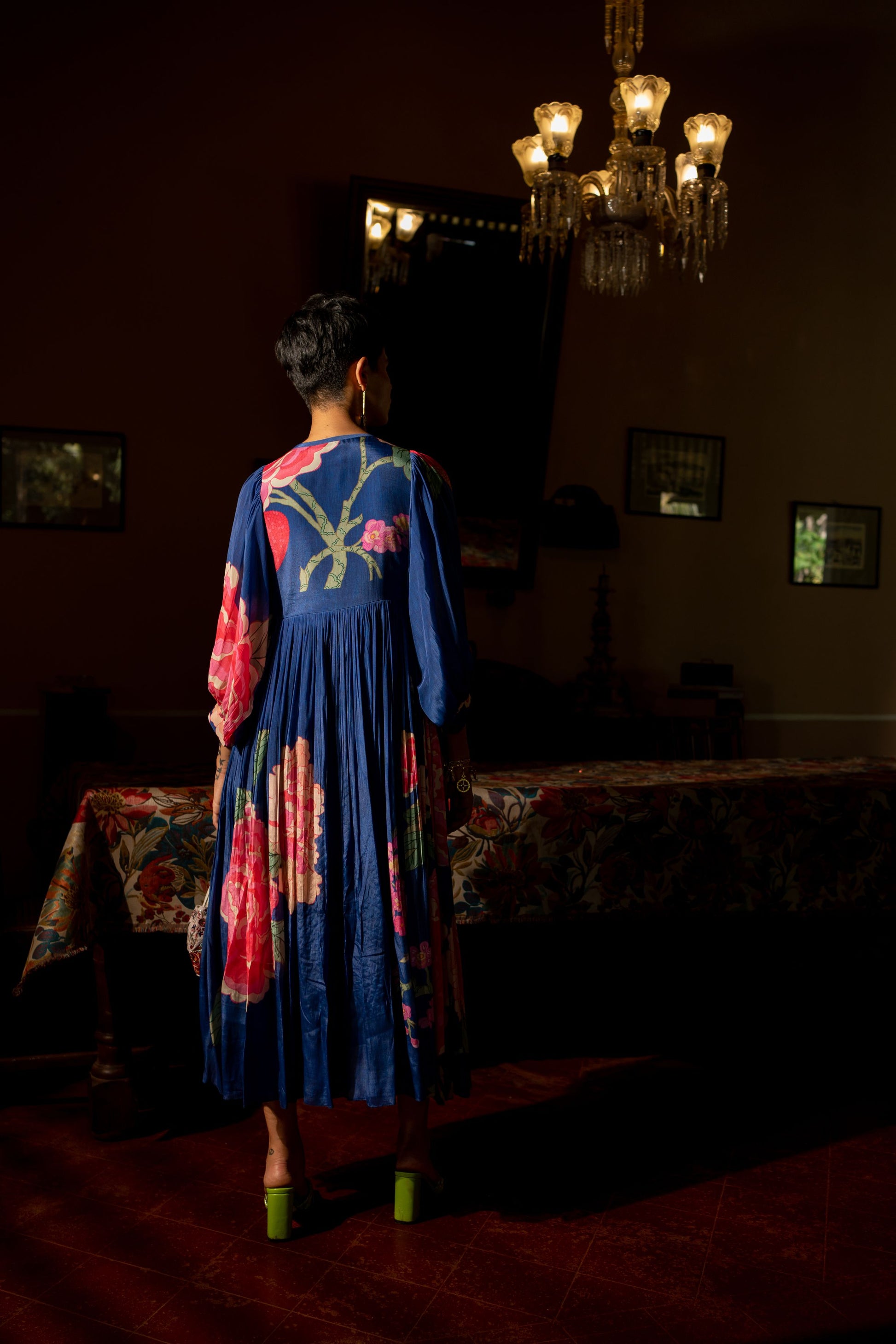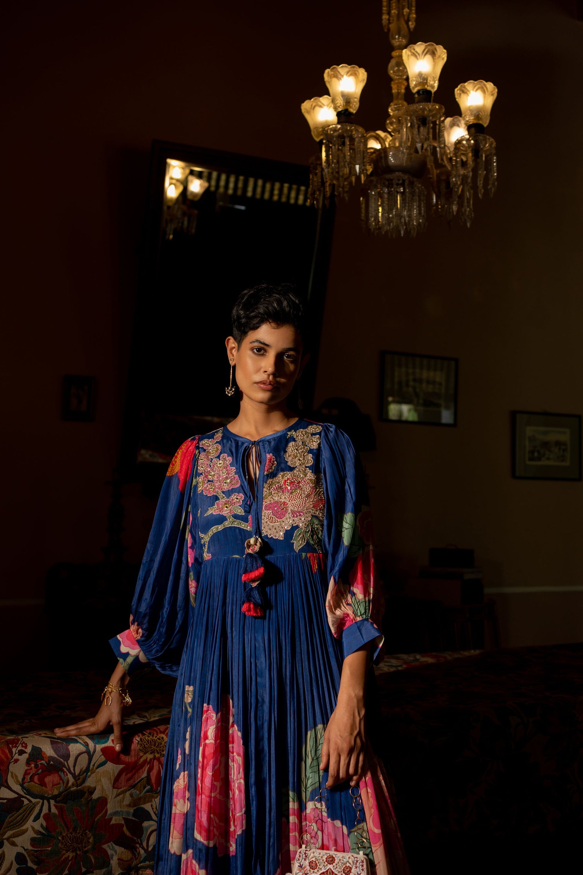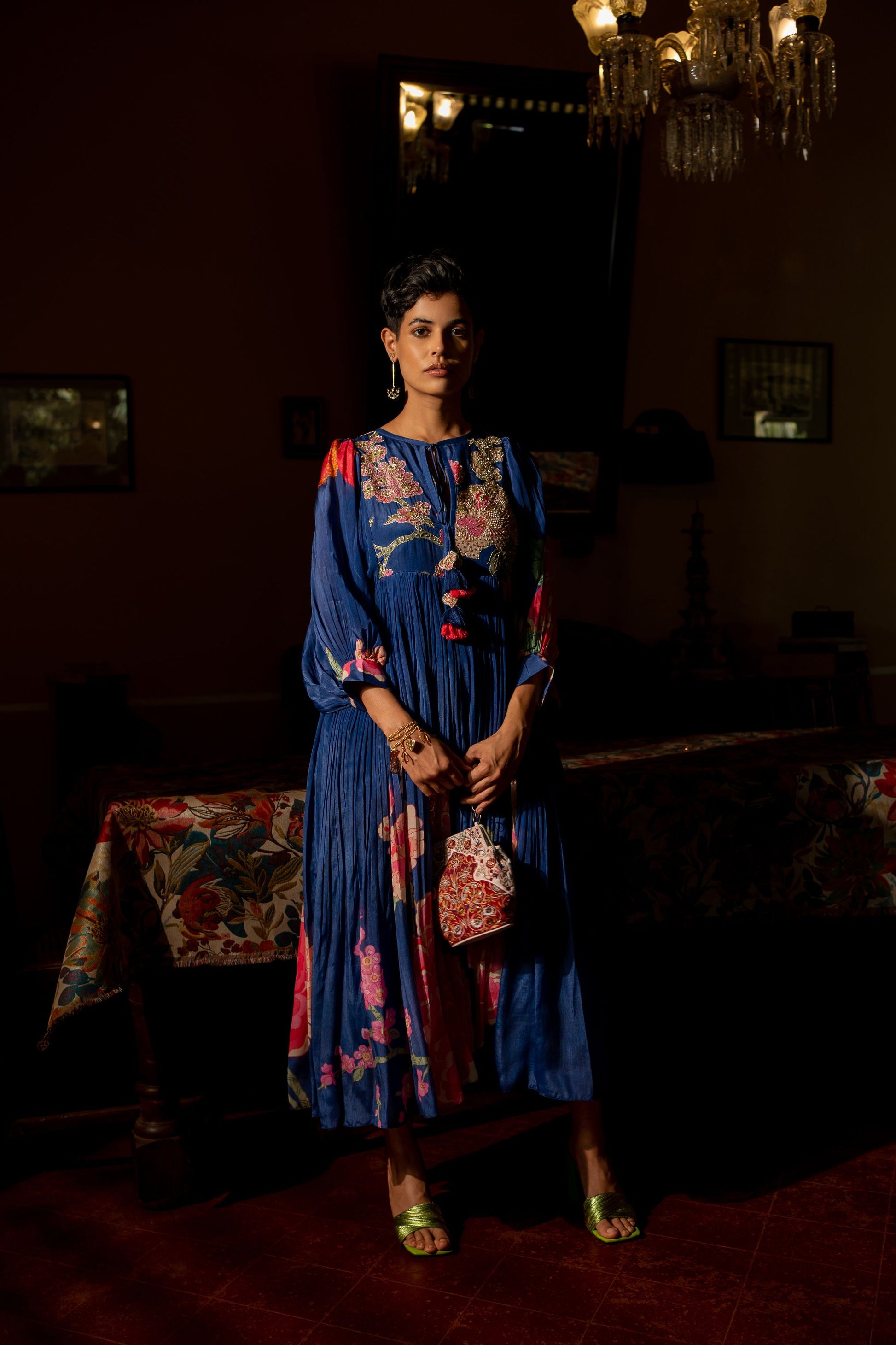 Crafted In A Beautiful Hue Of Blue, Blooming Maxi Dress Based On Crepe Features A Drawstring Tie-Up On The Neck With Tassel And Cowrie Shell Details. It Is Hand-Highlighted Using Mono-Colour Sequins And Mirror Details With Delicate Pleats.