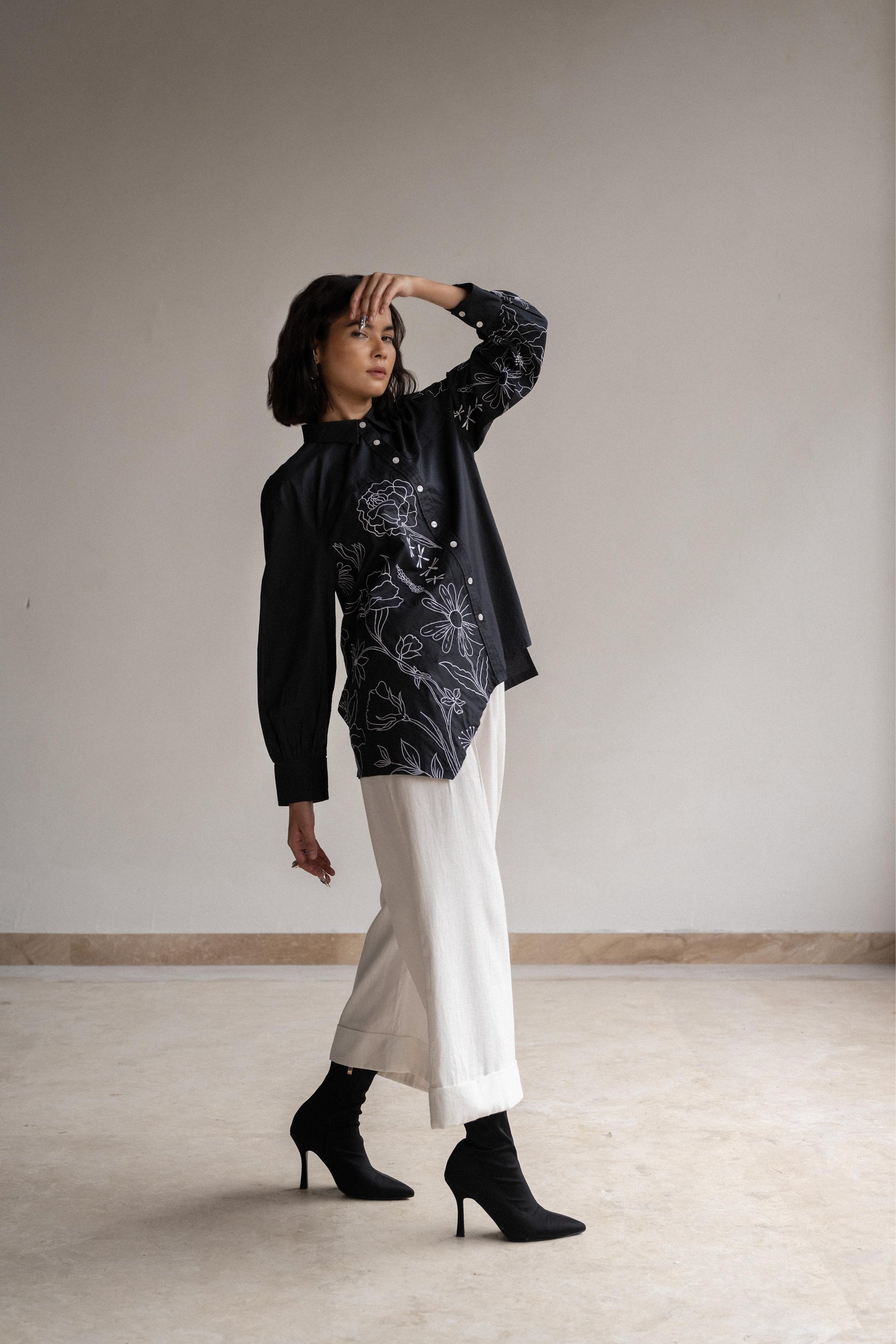 Asymmetrical Oversized Shirt- A Fusion Of Contemporary Style And Nature Inspired Artistry. The Contrasting Embroidery Of White Over Black Featuring The Flora And Fauna, Emphasize The Beauty Of Harmony In Nature. Comes In Contrast White Buttons, Front Horizontal Placket And Gathers Around Sleeves Cuff.