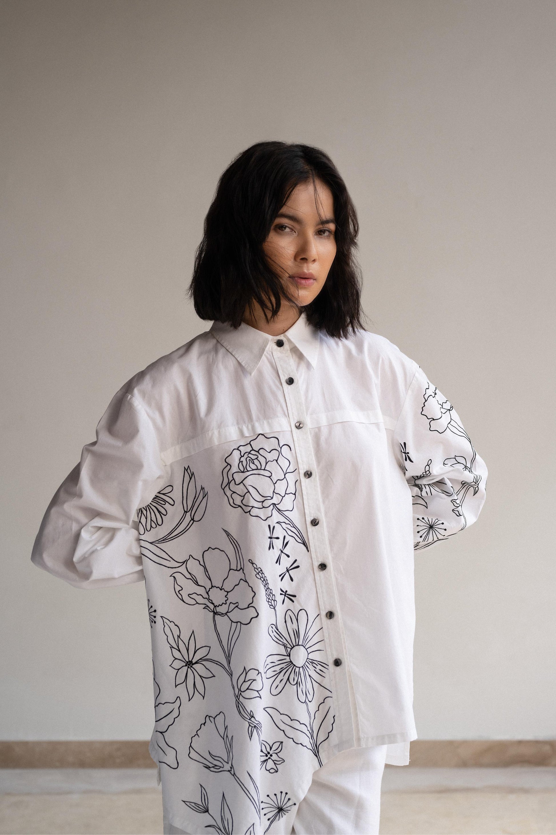 Asymmetrical Oversized Shirt- A Fusion Of Contemporary Style And Nature Inspired Artistry. The Contrasting Embroidery Of Black Over White Featuring The Flora And Fauna, Emphasise The Beauty Of Harmony In Nature. Comes In Contrast Black Buttons, Front Horizontal Placket And Gathers Around Sleeves Cuff.