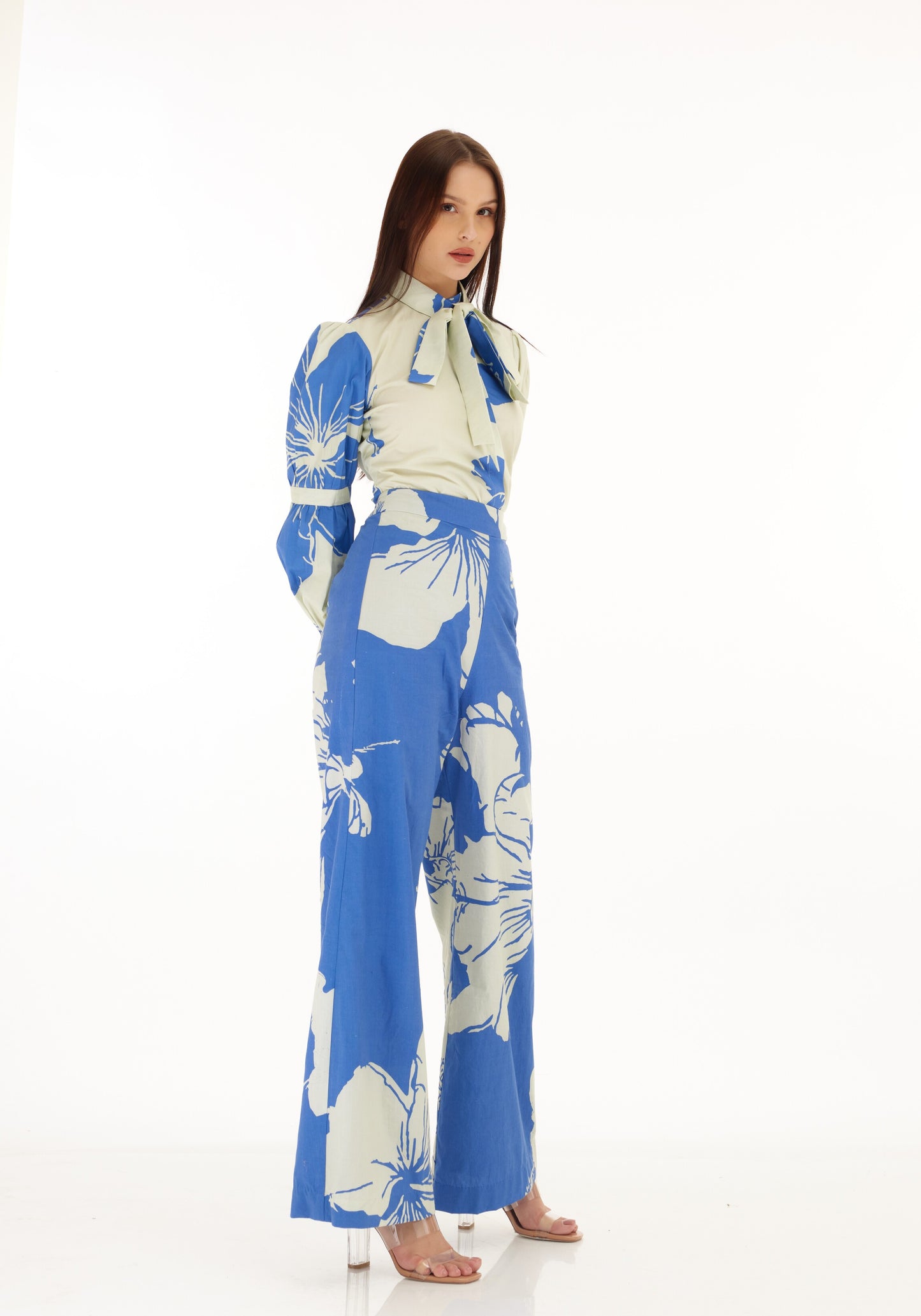 Blue And White Wide Leg Pants Based On Poplin Cotton Features Classic Floral Motifs.