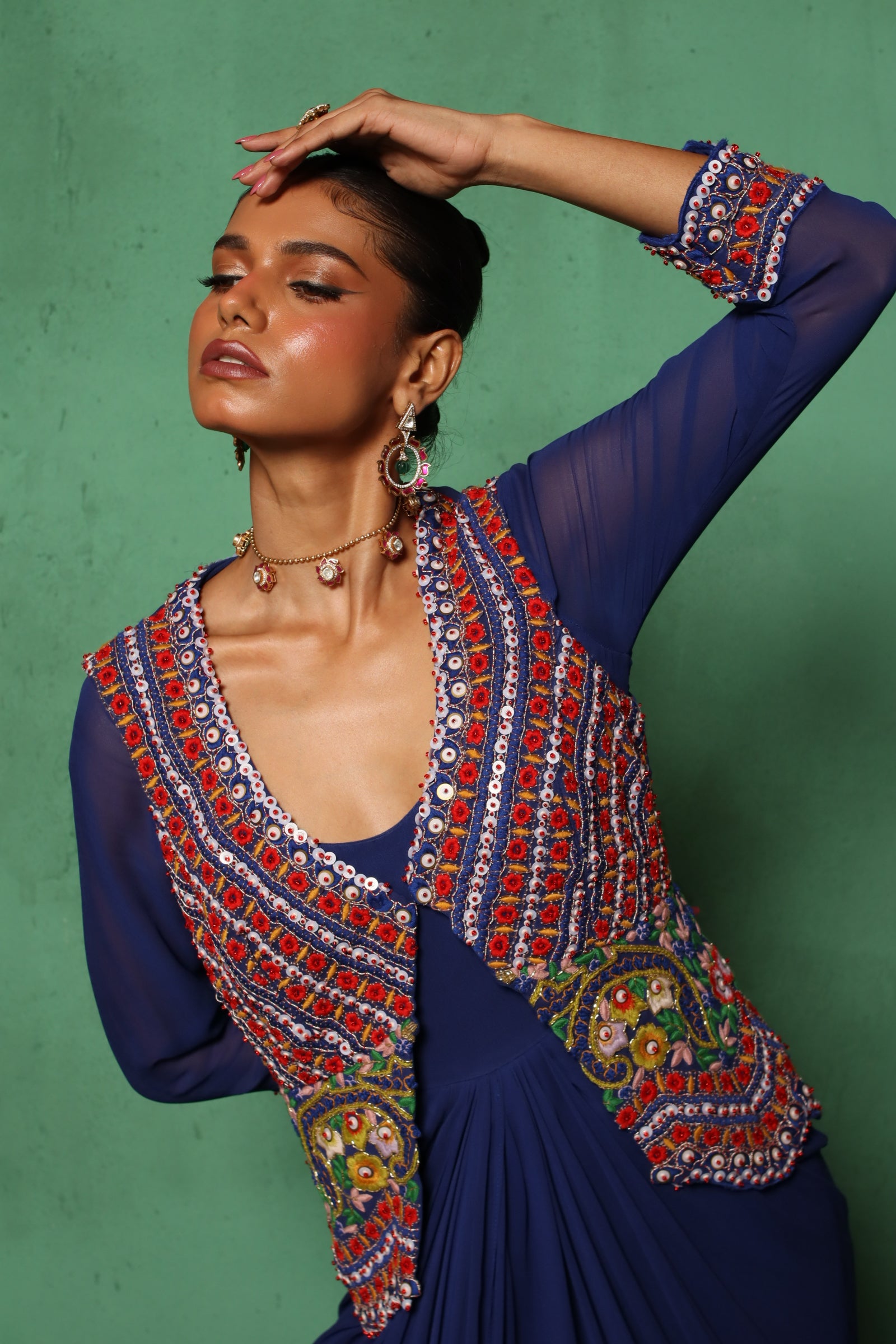Blue Is The New Black! This Layered Gown & Beaded Embroidered Jacket With Thread Work All Over Is The Ultimate Indo-Western Fusion For Your Next Special Occasion.