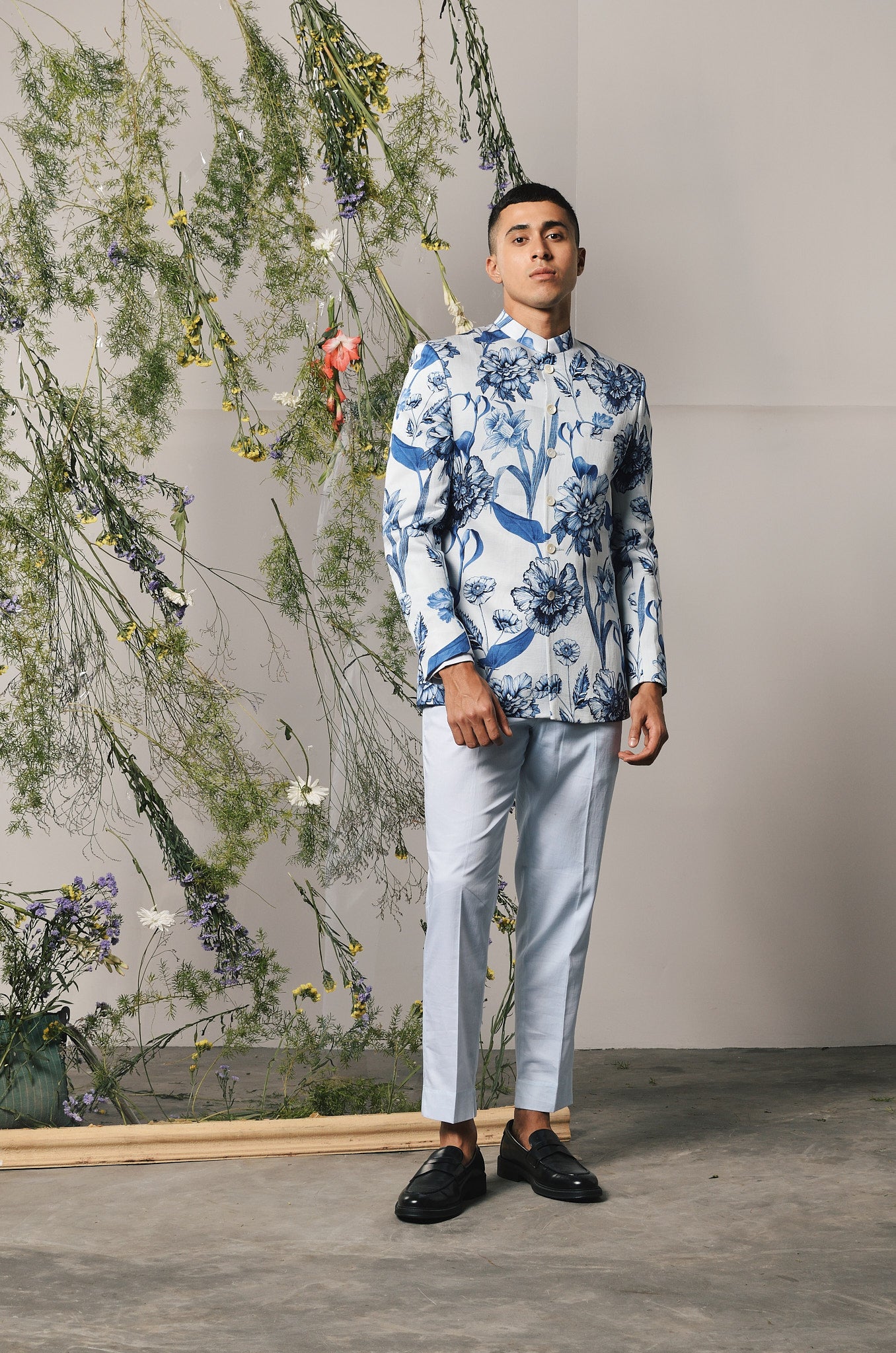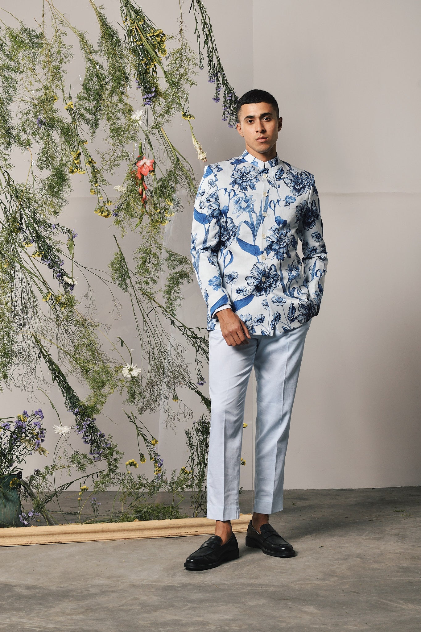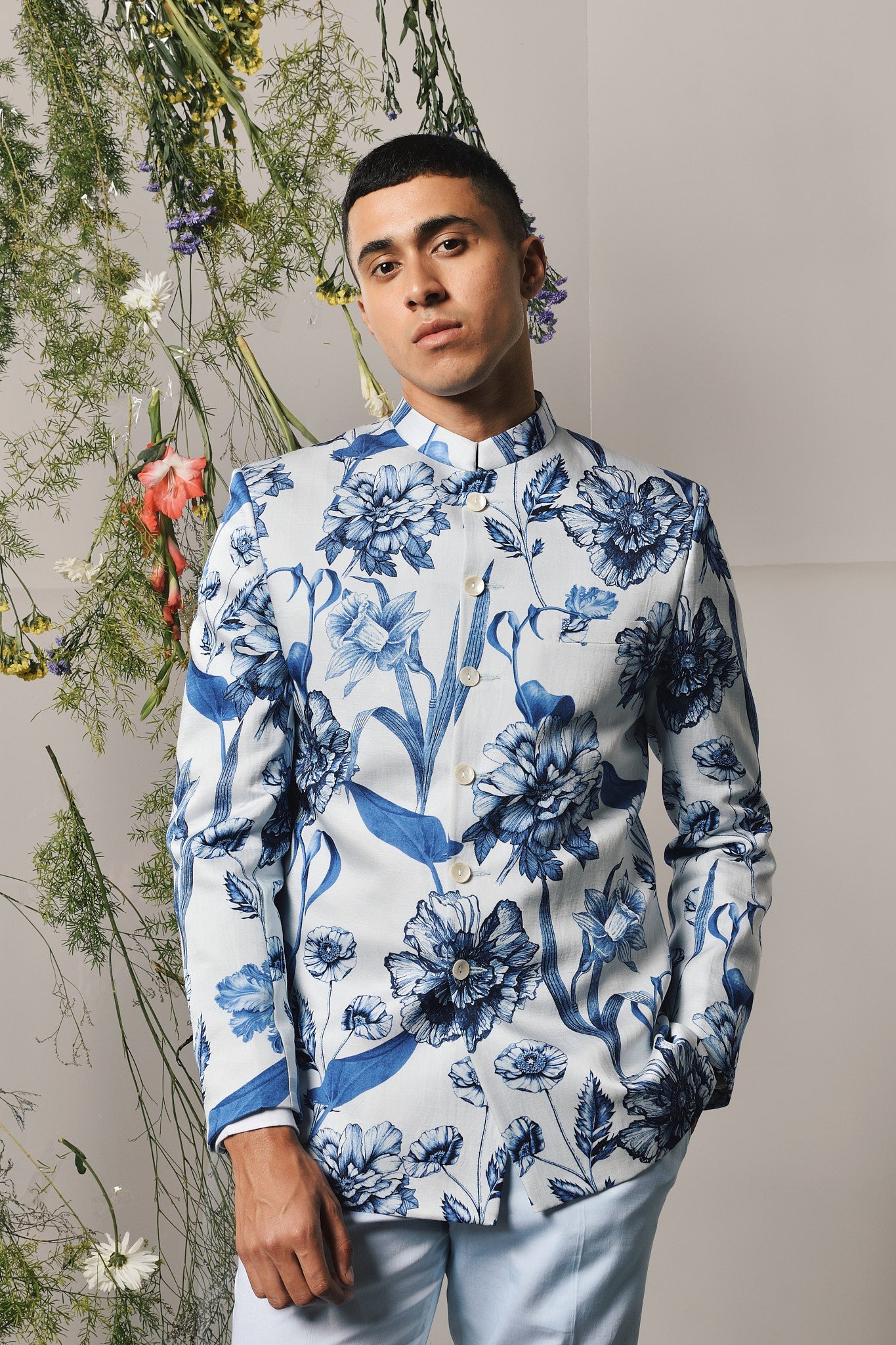 Floral Print Bandhgala Constructed With A Rich Linen Satin Fabric. The Bandhgala Features Laser Cut Mother Of Pearl Shell Buttons, A Mandarin Collar And One Chest Pocket.
