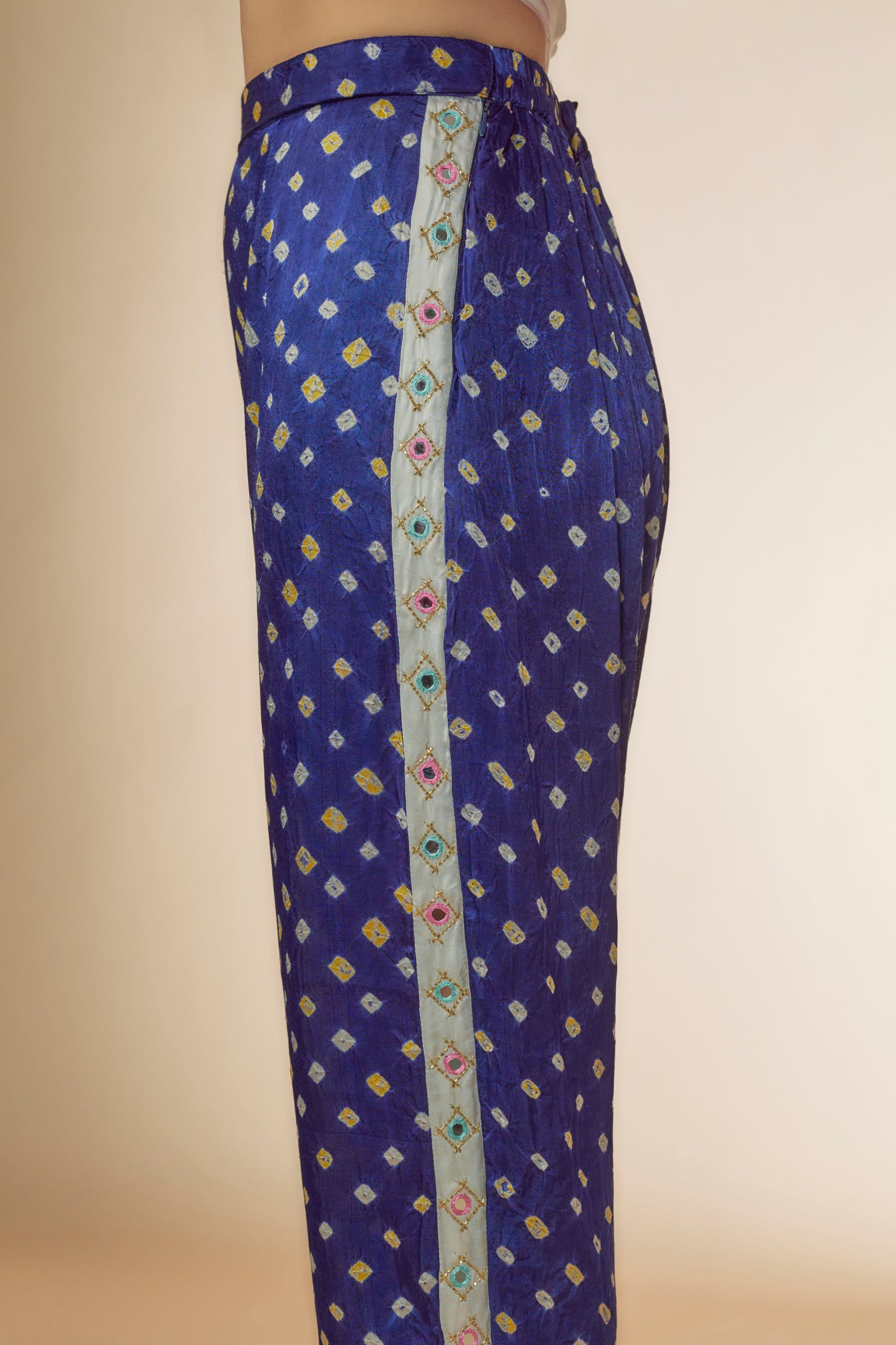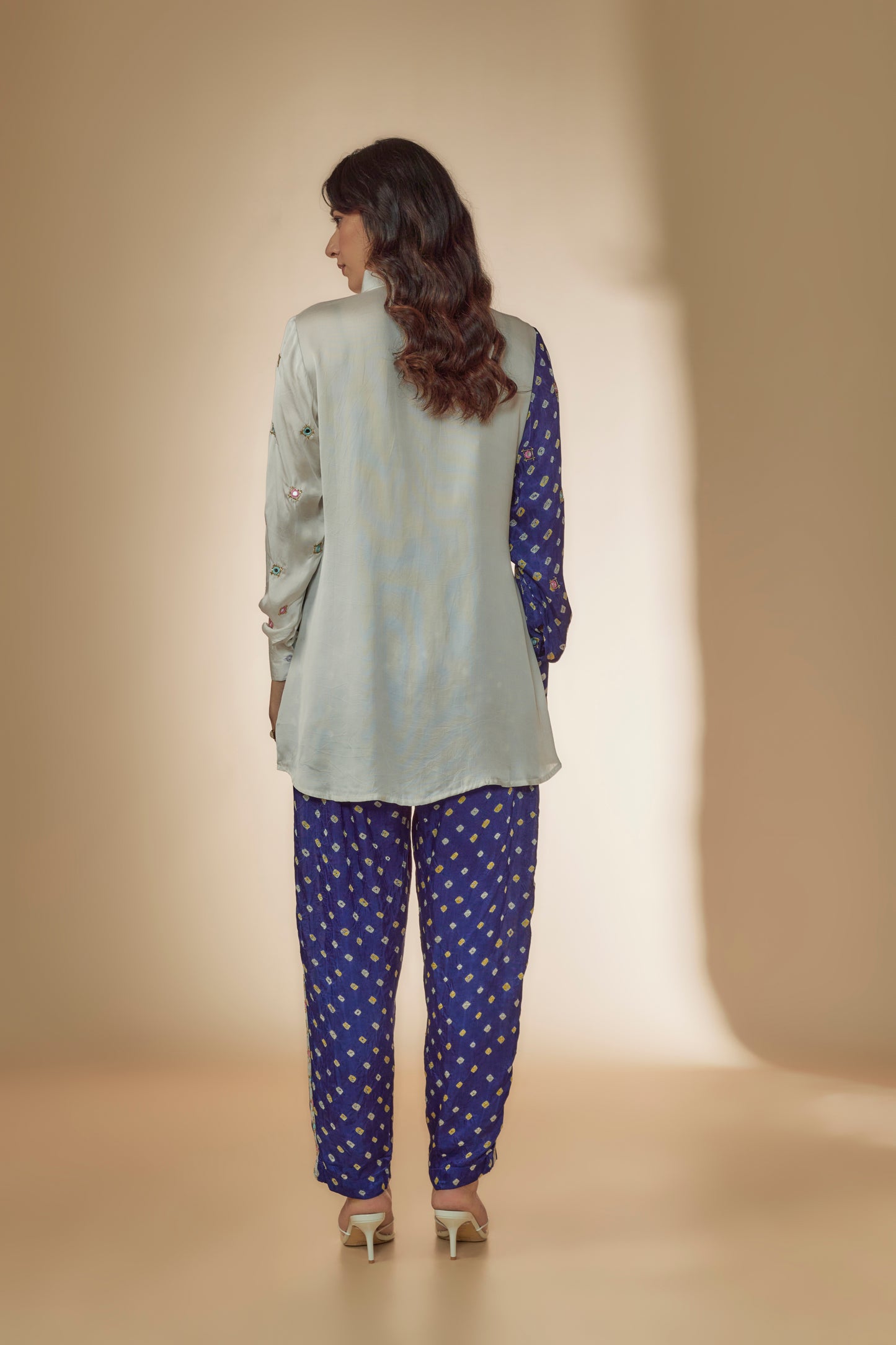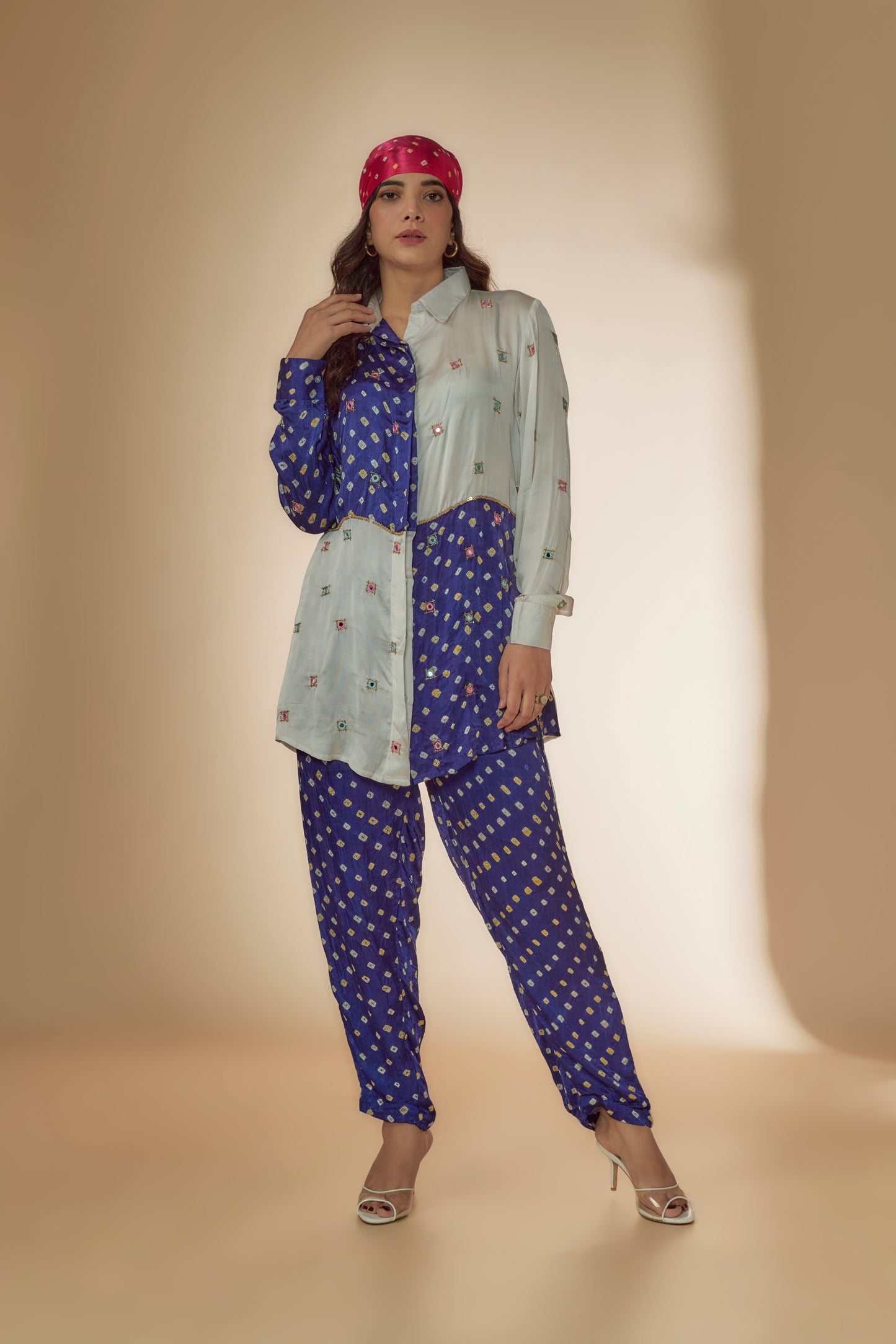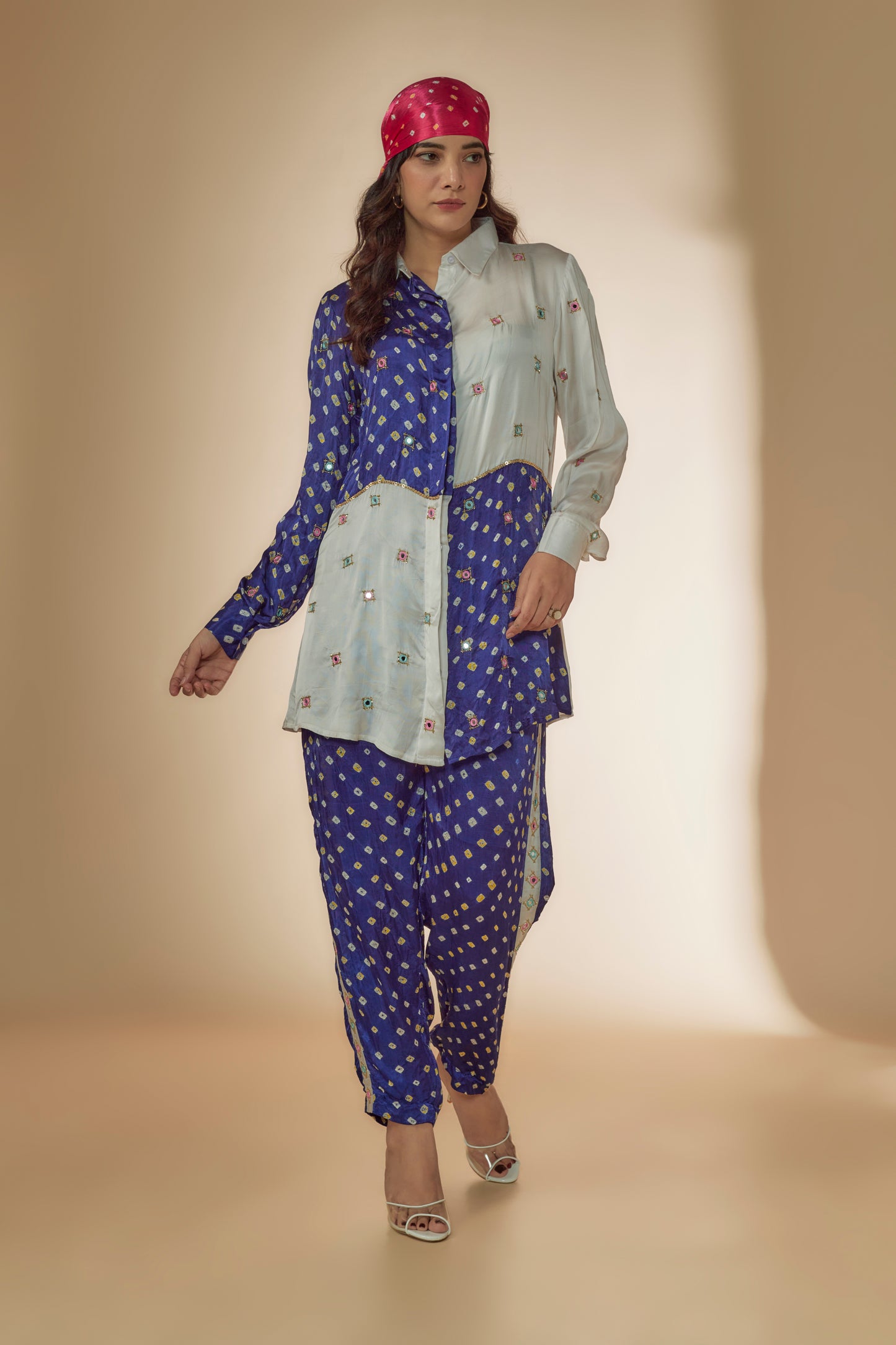Blue And White Shirt Co-Ord Set In Bandhni Fabric. The Shirt Feature Contrasting Patches . The Shirt Is Ornately Hand Embroidered With Mirror Work, Resham And Beads. The Blue Bandhani Pants Feature A Contrasting Hand Embroidered White Panel.