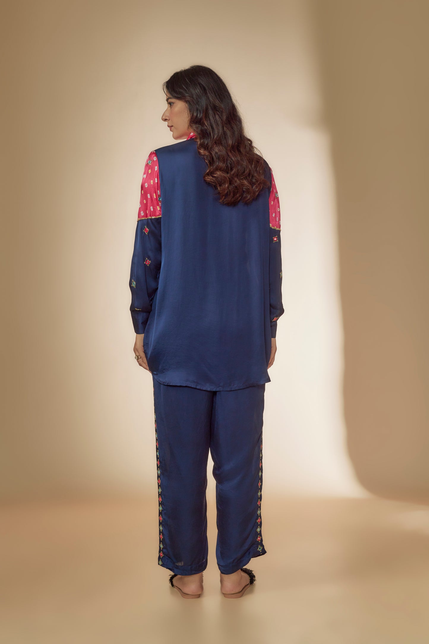 Blue Shirt Co-Ord Set With A V Point Yoke. The Luxurious Bandhani Silk Fabric Is Hand Embroidered With Mirror Work And Bead Work. The Pants Feature A Embroidered Side Panel.