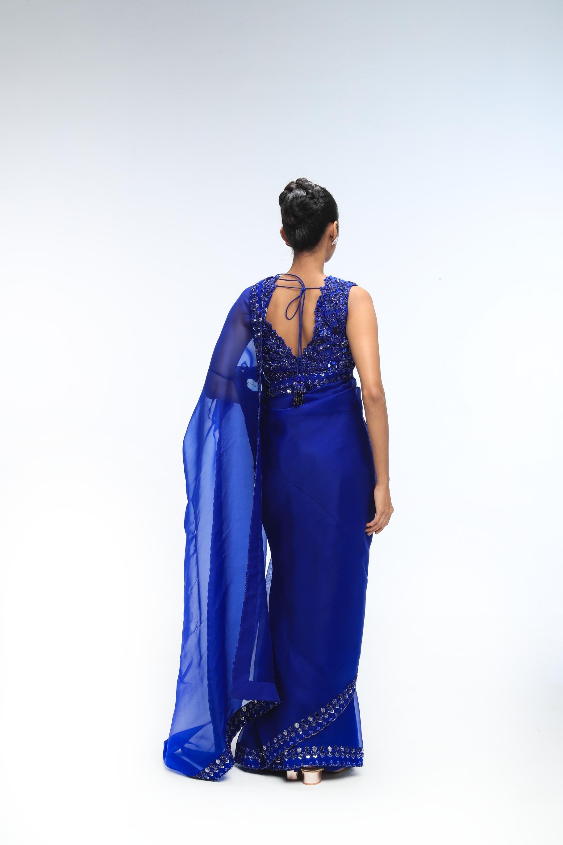 Sapphire Blue Embroidered Saree With Deep Neck Blouse And Inskirt.