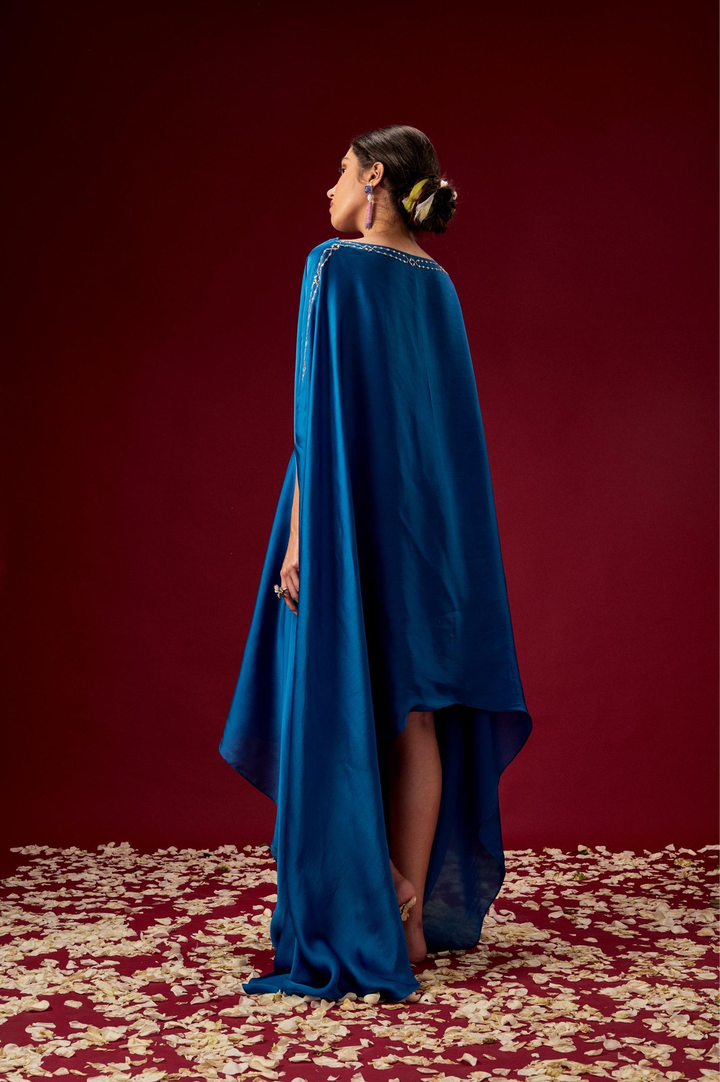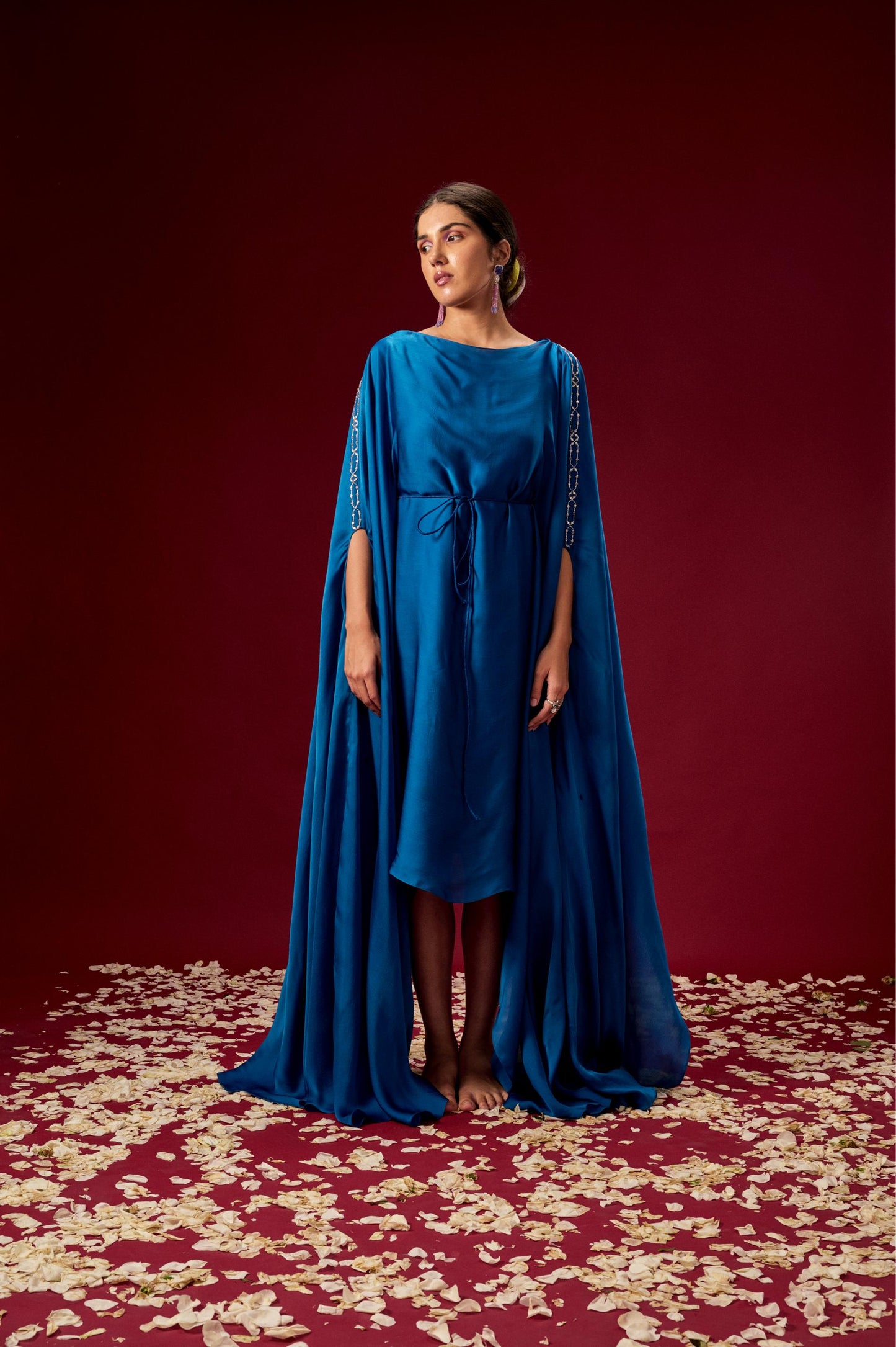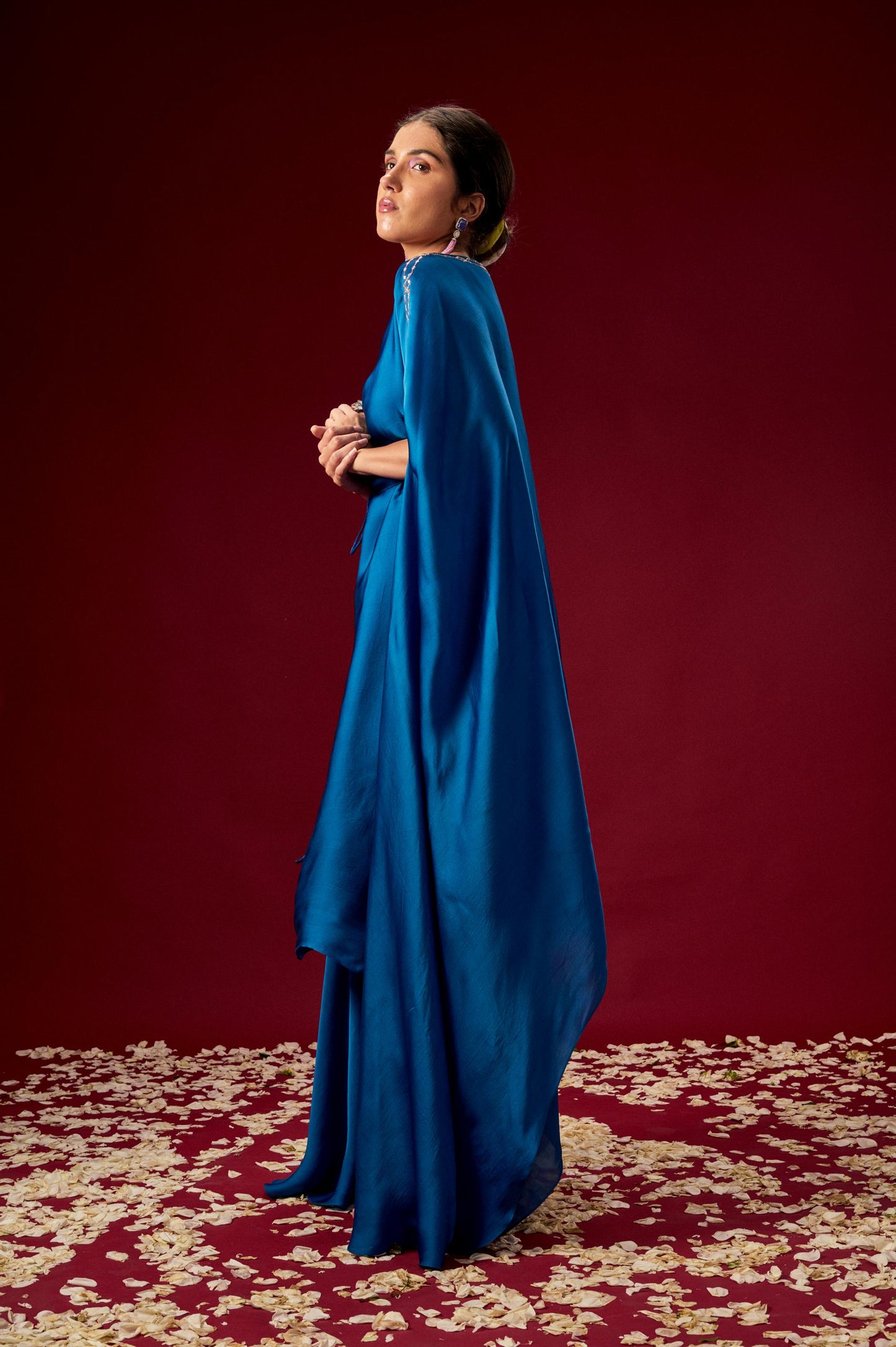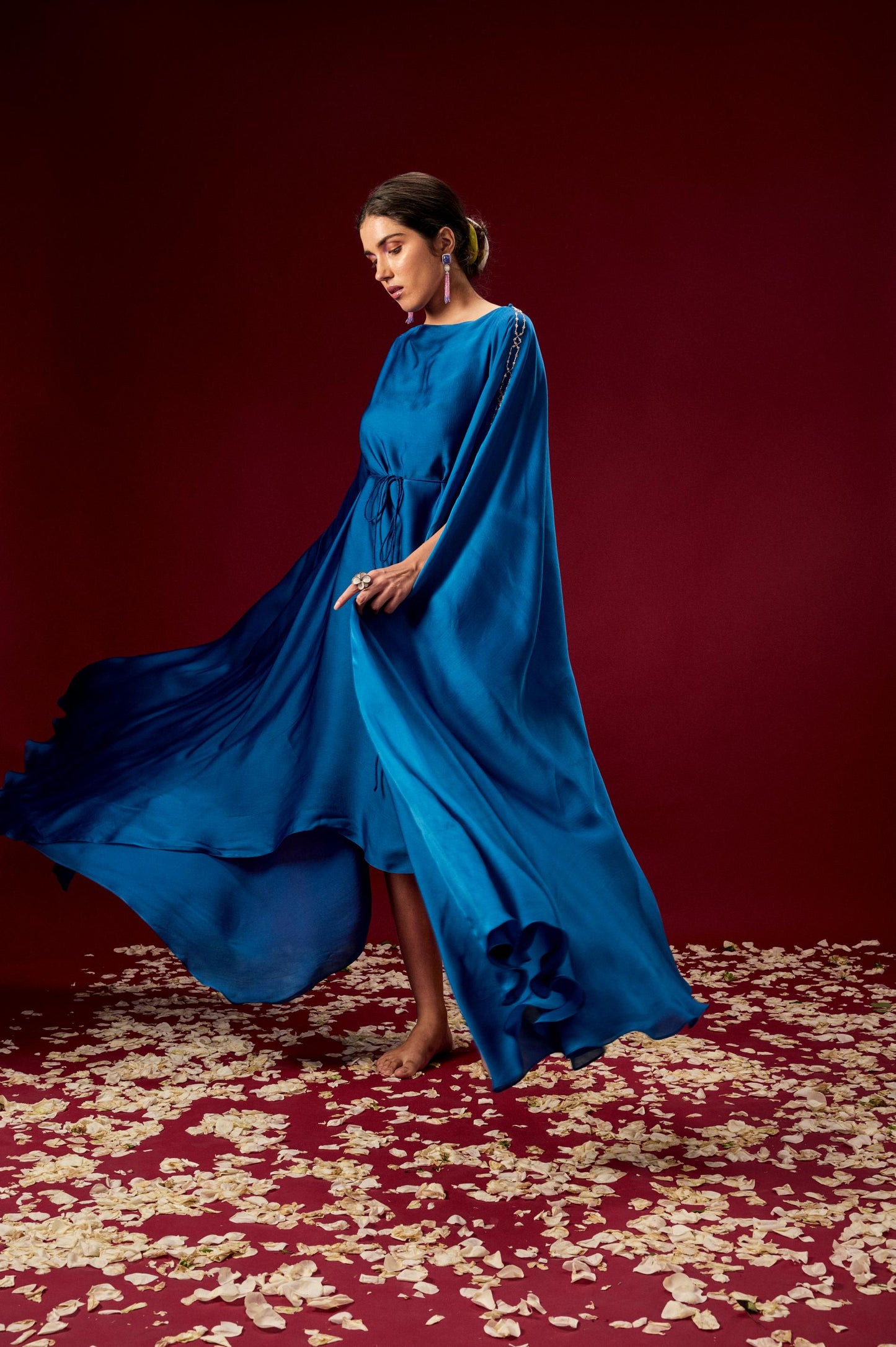 Presenting a Dark Midnight Blue Kaftan Dress in Satin Organza Base with Hand Embroidery. Immerse Yourself in the Opulence of This Dress, Adorned with Intricate Hand Embroidery on a Satin Organza Canvas. This Creation Embodies a Perfect Synthesis of Style and Sophistication. Elevate Your Wardrobe with This Distinctive Piece, Where Every Stitch Tells a Story of Elegance.