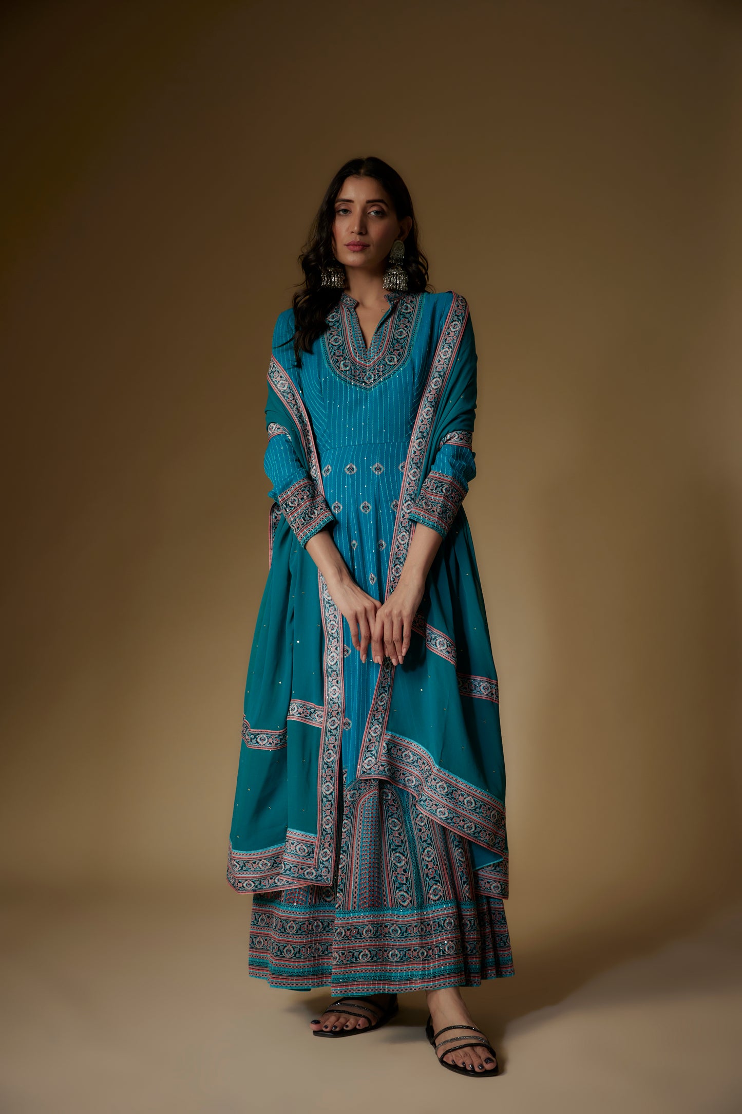 Blue Printed Anarkali In Georgette Base With Sequins Detail. It Is Paired With Matching Printed Pants And Dupatta.