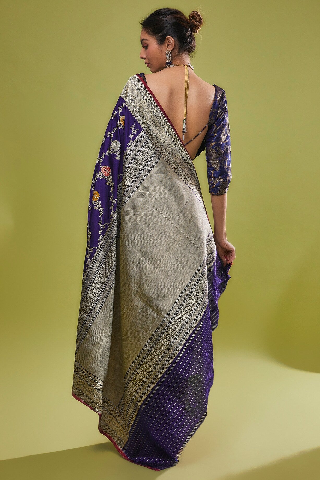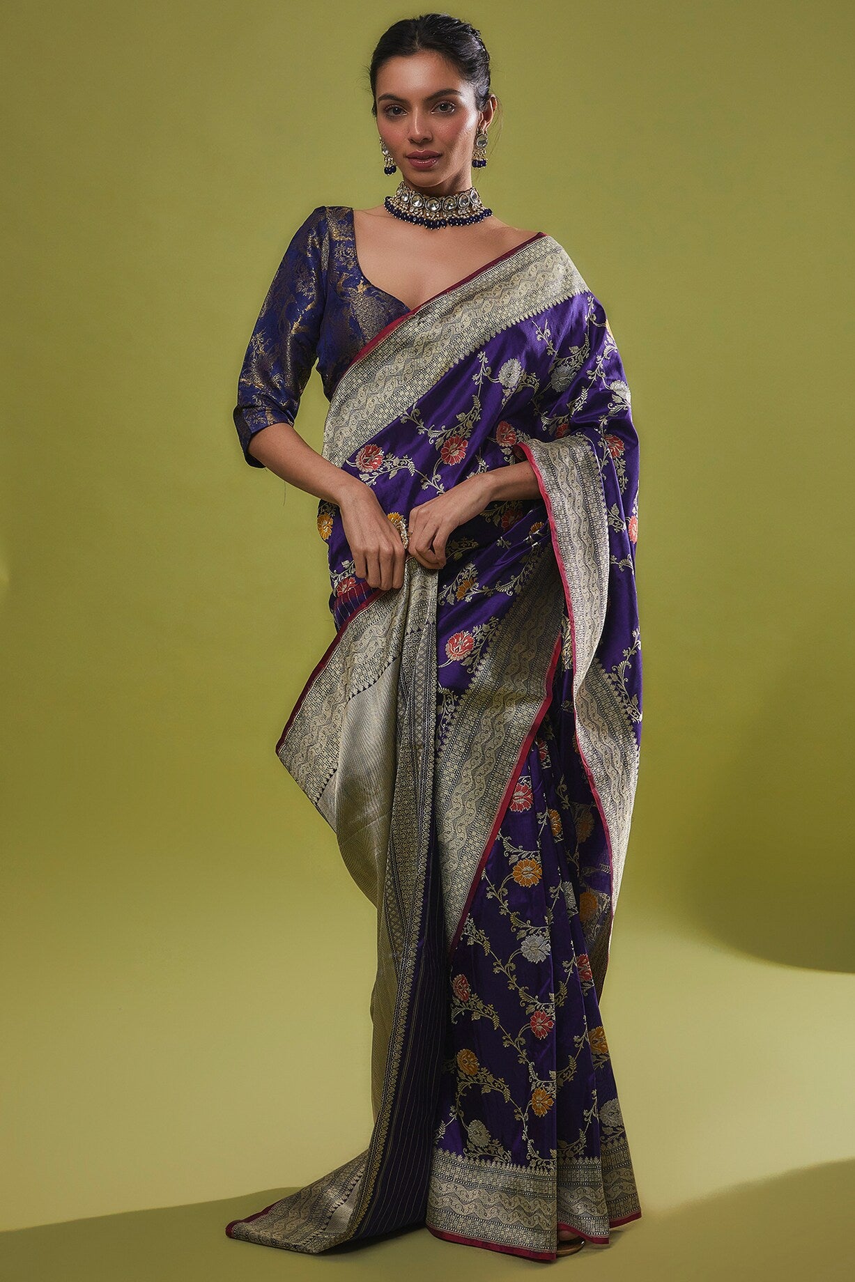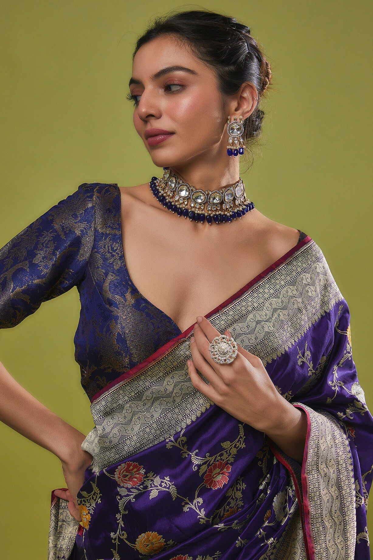 Handwoven Blue Katan Silk Floral Jaal Saree With Hints Of Meenakari. It Is Paired With An Unstitched Blouse.