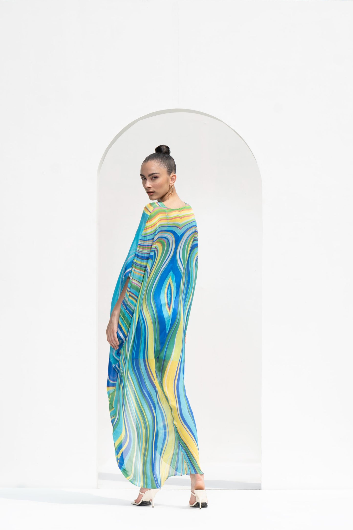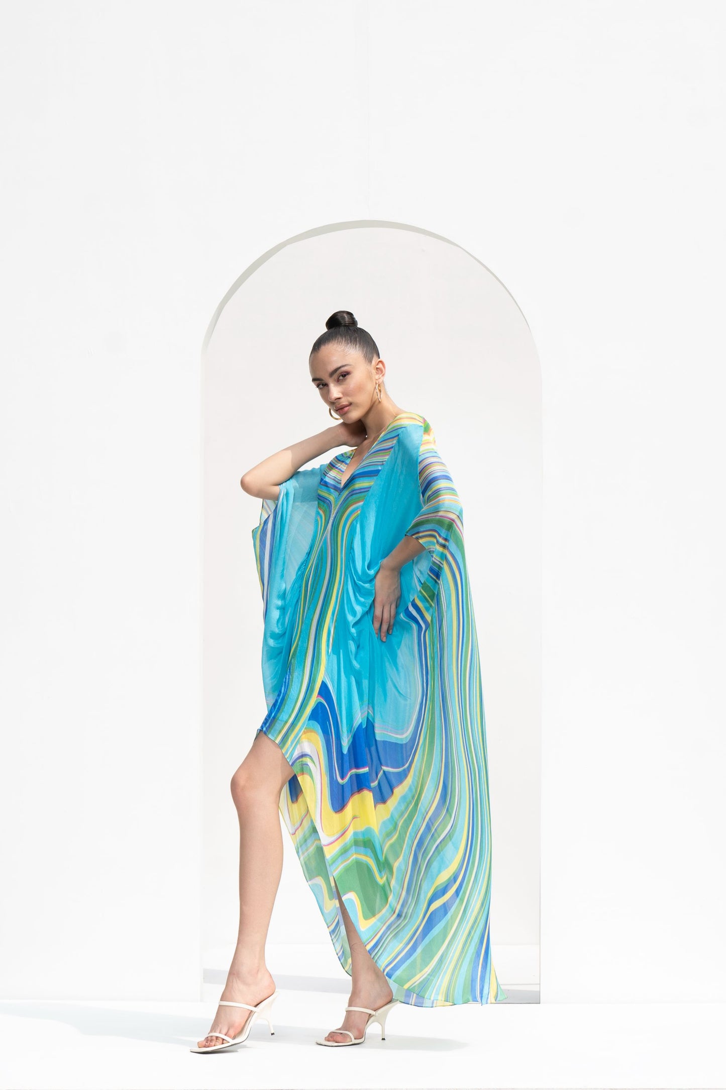 BLUE MARBLE PRINTED KAFTAN DRESS