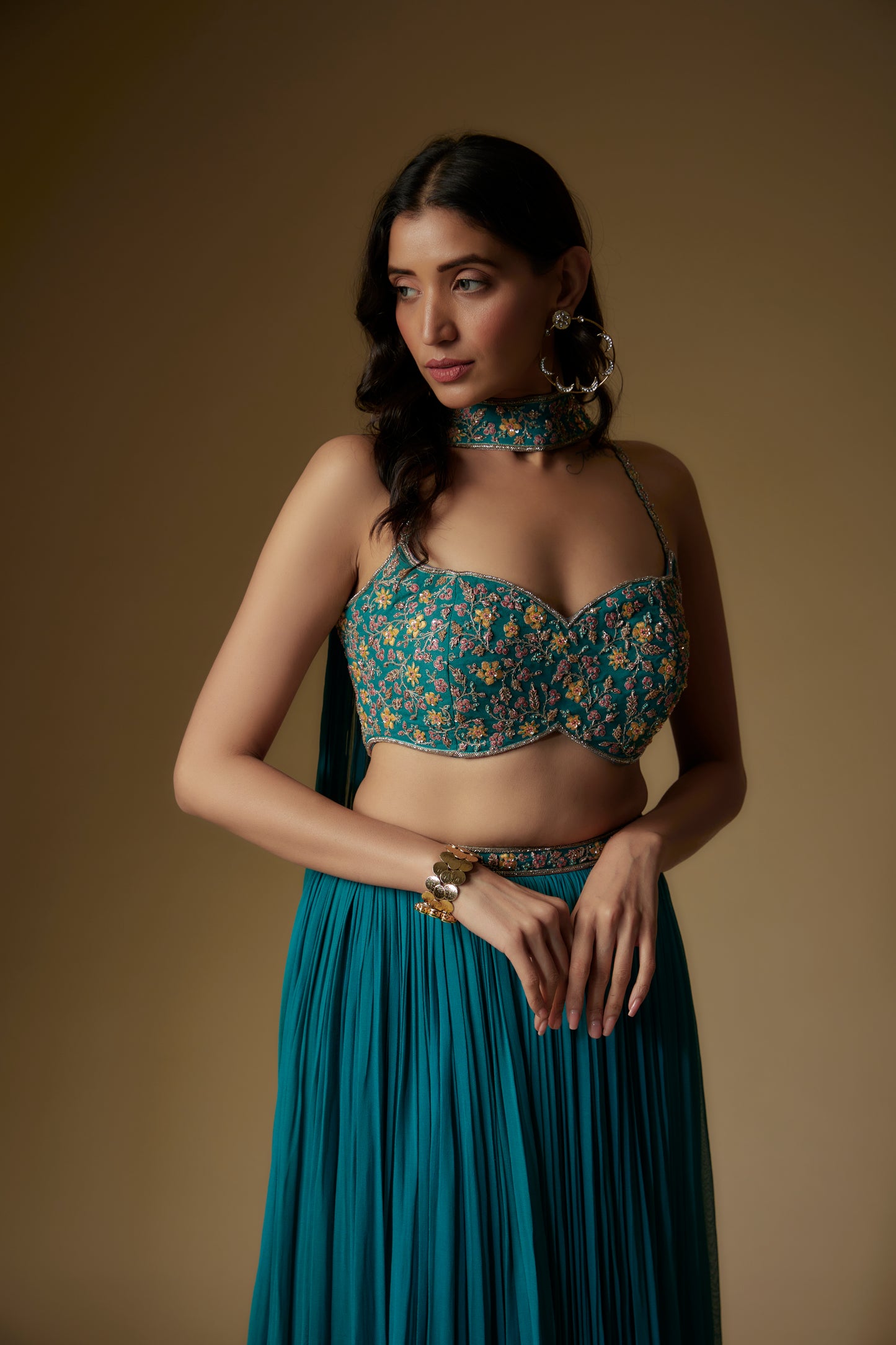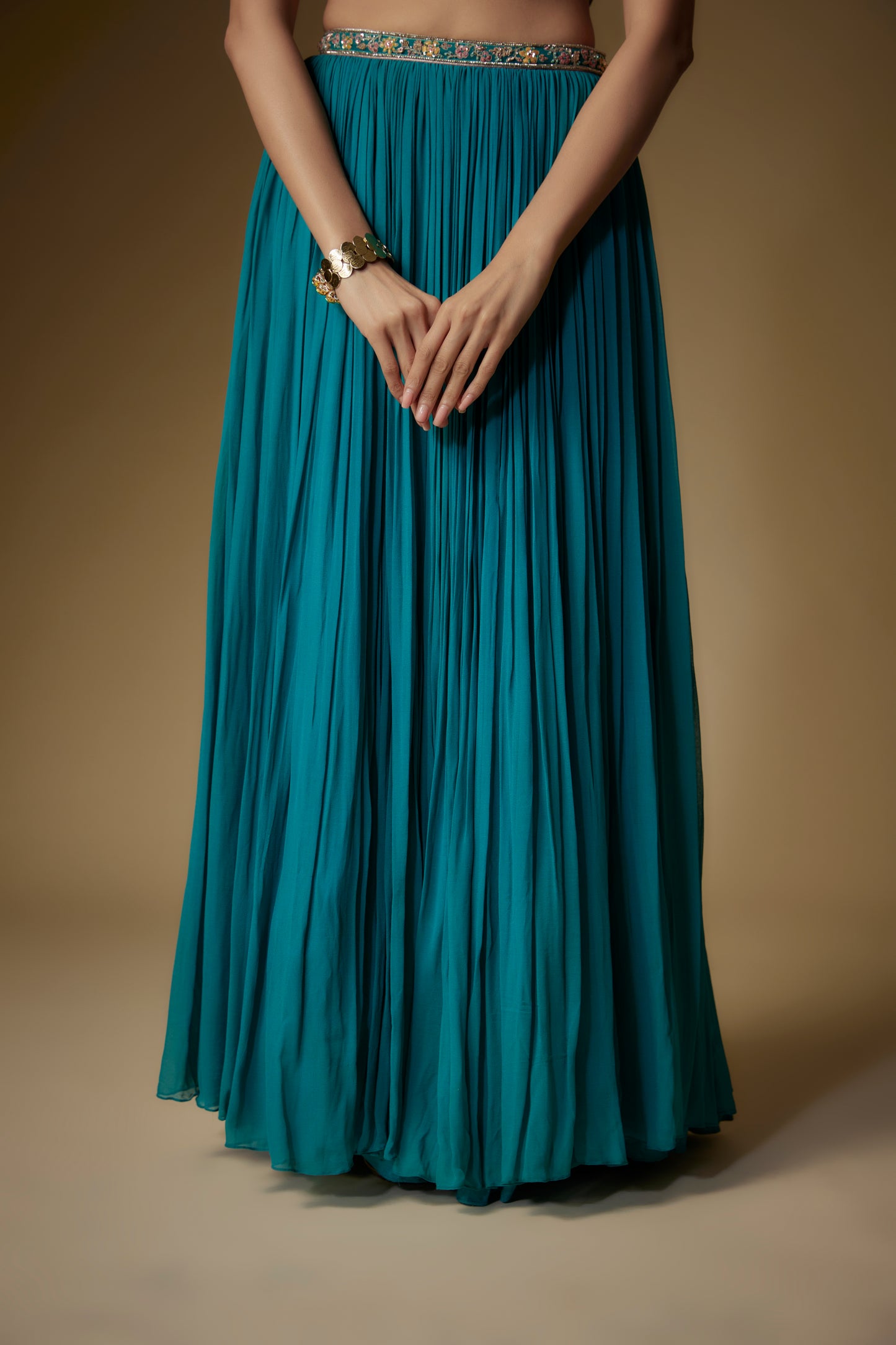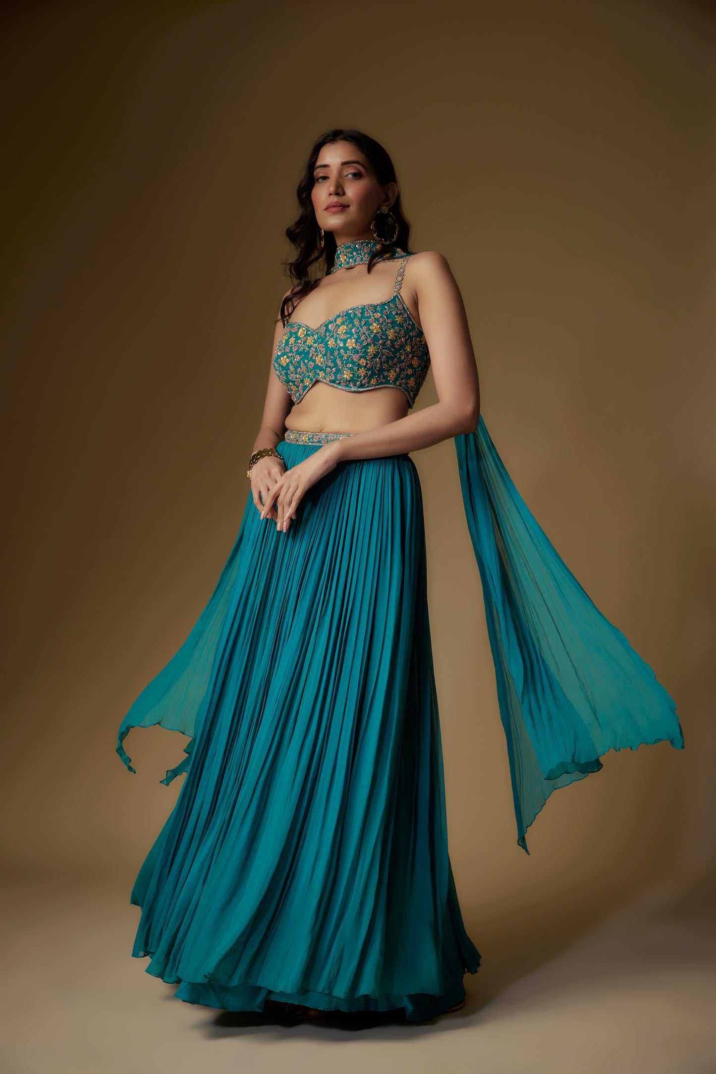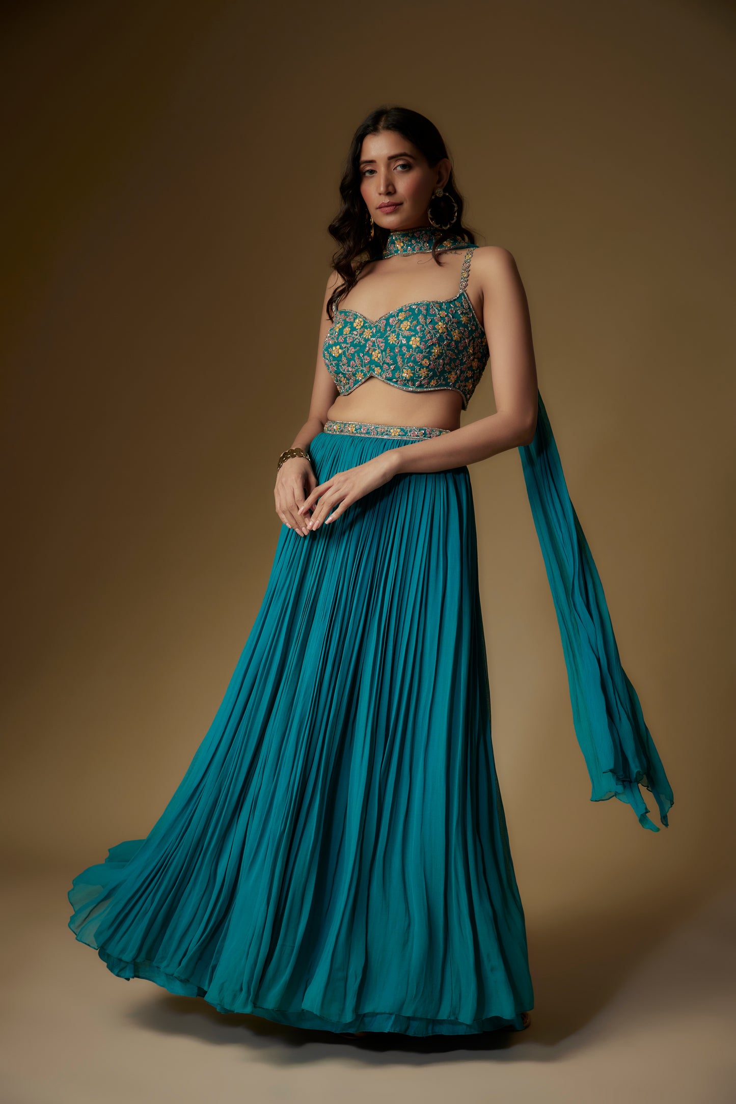 Teal Blouse In Georgette Base With Thread Embroidery. It Is Paired With Matching Skirt And Dupatta.