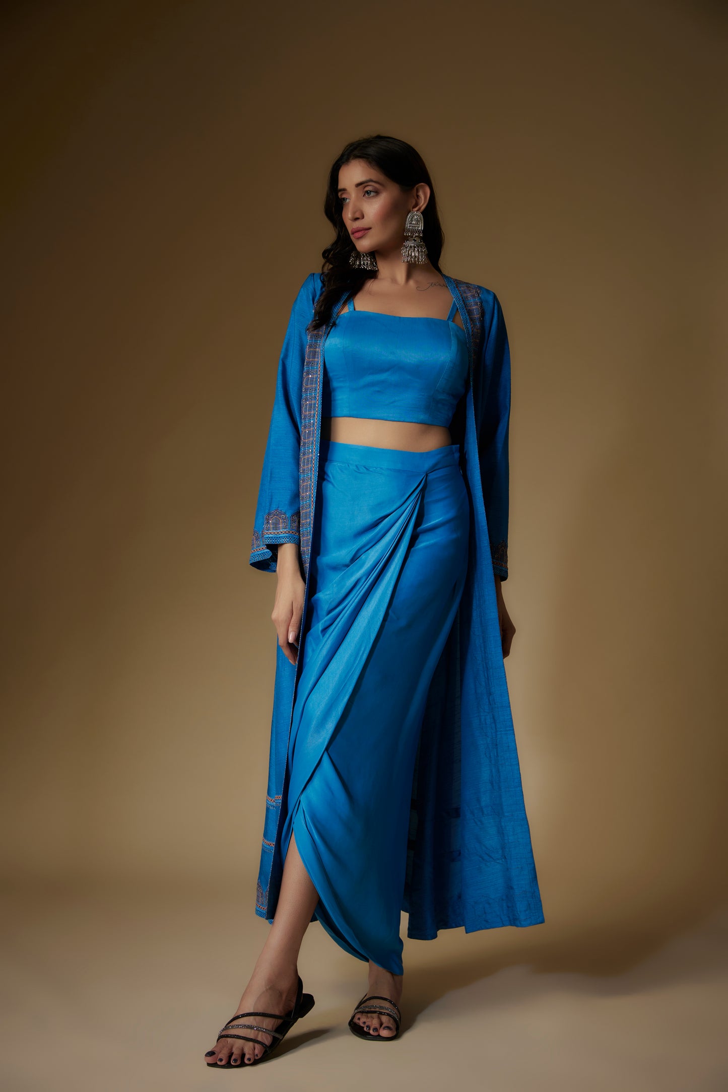 Blue Printed Jacket In Rawsilk Base. It Is Paired With Matching Crepe Drape Skirt And Bustier.