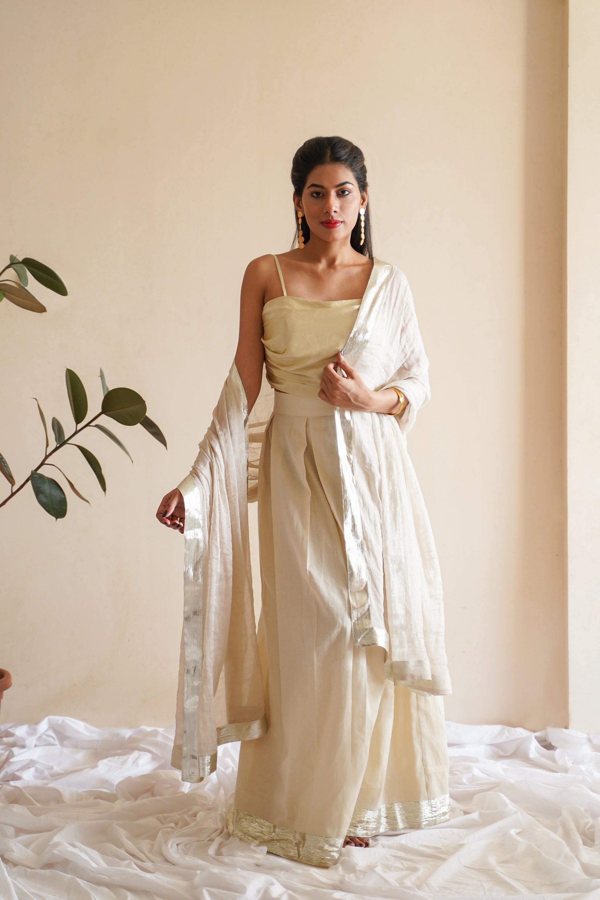 Beige Gathered Satin Bustier With Cream Muslin Cotton Box Pleated Long Skirt And Silver Tissue Dupatta.