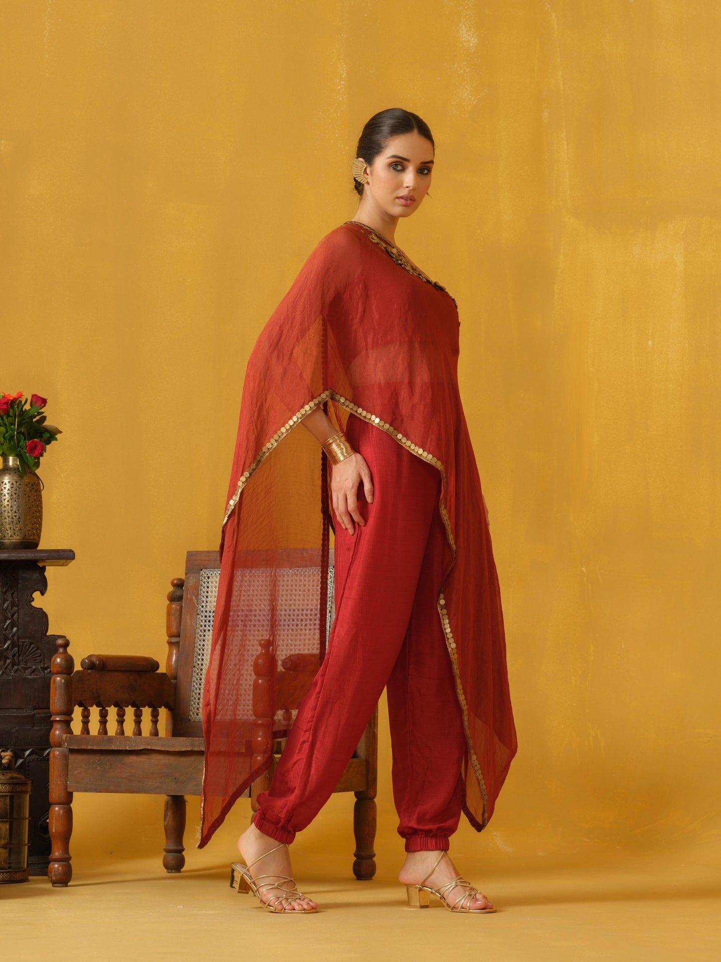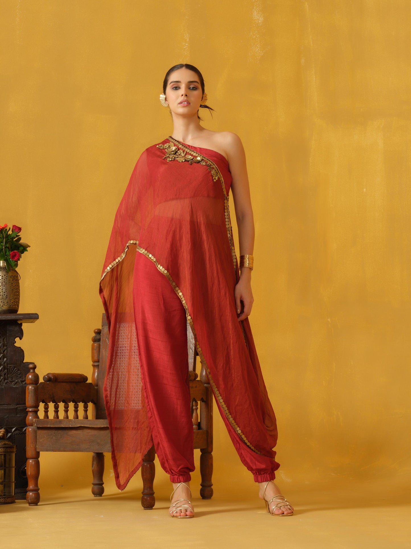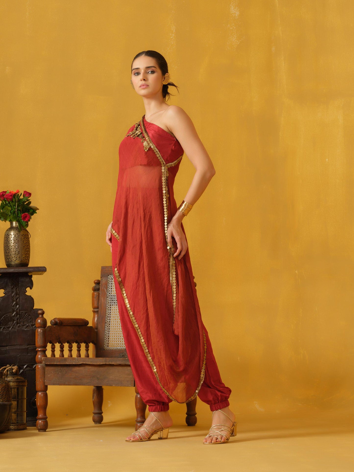 Featuring A One Shoulder Crop Top With A Drape Over It Having Metallic Floral Embellishment Across The Bust And Coin And Leaf Sequin On The Borders Paired With Jogger Pant.