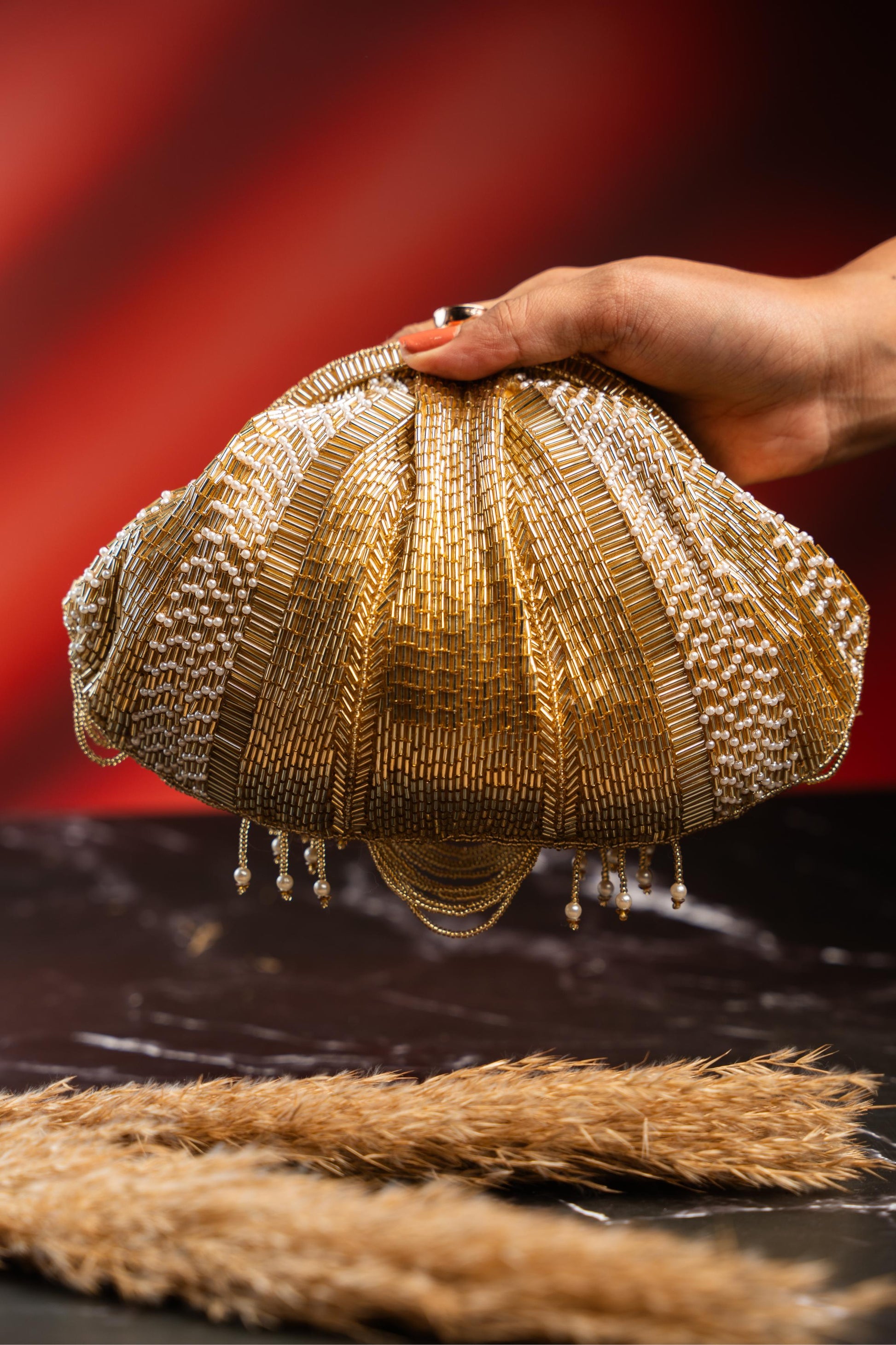 Elevate Your Evening Look With This Stunning Gold Scallop Clutch, Designed In Elegant Shades Of Gold And Light Gold. The Scalloped Detailing Is Beautifully Accented With Subtle Beaded Tassels And Pearls, Creating A Refined, Luminous Finish. A Pearly Beaded Handle Adds A Striking Contrast While Complementing The Rich Tones, And Its Removable Design Allows You To Carry It As Either A Potli Or A Clutch. Finished With Intricate Sequin And Beadwork, This Versatile Piece Is Perfect For Adding Timeless Sparkle To Any Special Occasion.