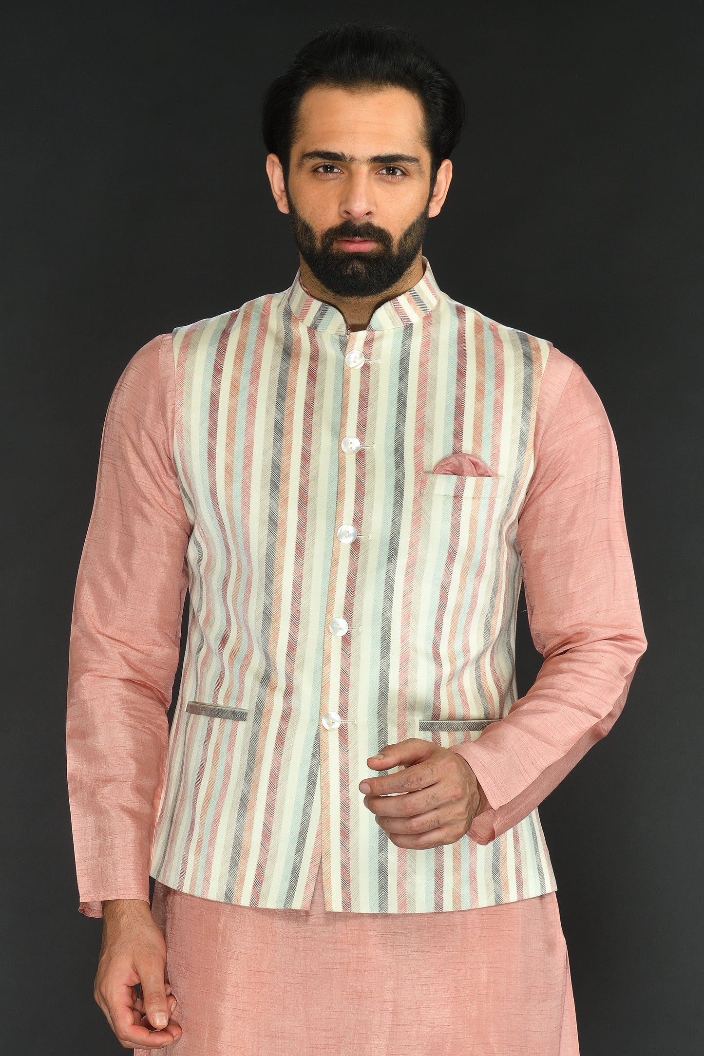 Off-White Imported Russian Printed Bundi Is Paired With A Viscose Silk Plain Peach Kurta And Off White Churidar Pant Based On Spun Silk.