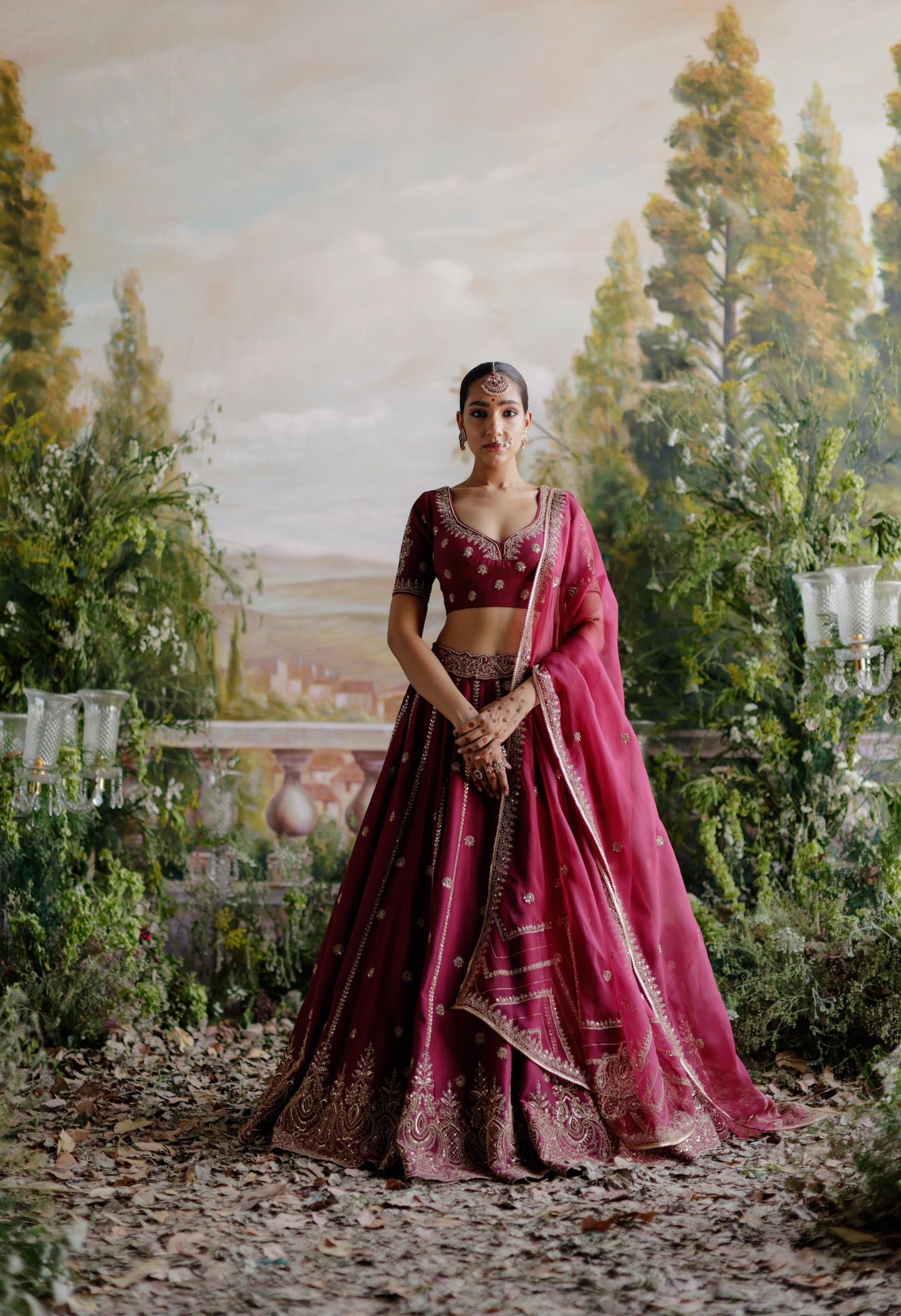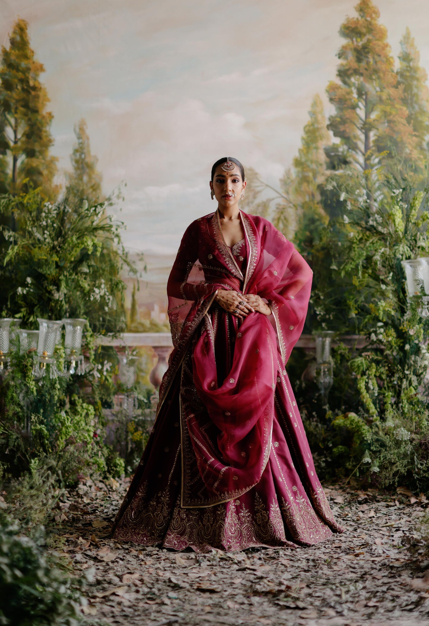 His Ensemble Is A Testament To Regal Elegance And Traditional Charm, Ideal For Making A Grand Statement On Special Occasions. Embellished With Delicate Hand Embroidery And Antique Gold Dori, The Raw Silk Lehenga And Organza Dupatta Pay Homage To The Rich Heritage Of Indian Craftsmanship. The Deep Burgundy Hue Exudes An Air Of Regal Splendour, Making It A Perfect Choice For A Variety Of Celebrations. Whether You'Re Attending A Wedding, A Cultural Event, Or A Special Celebration, The Burgundy Lehenga Set Will Ensure You Shine With Timeless Elegance And Regal Charm.