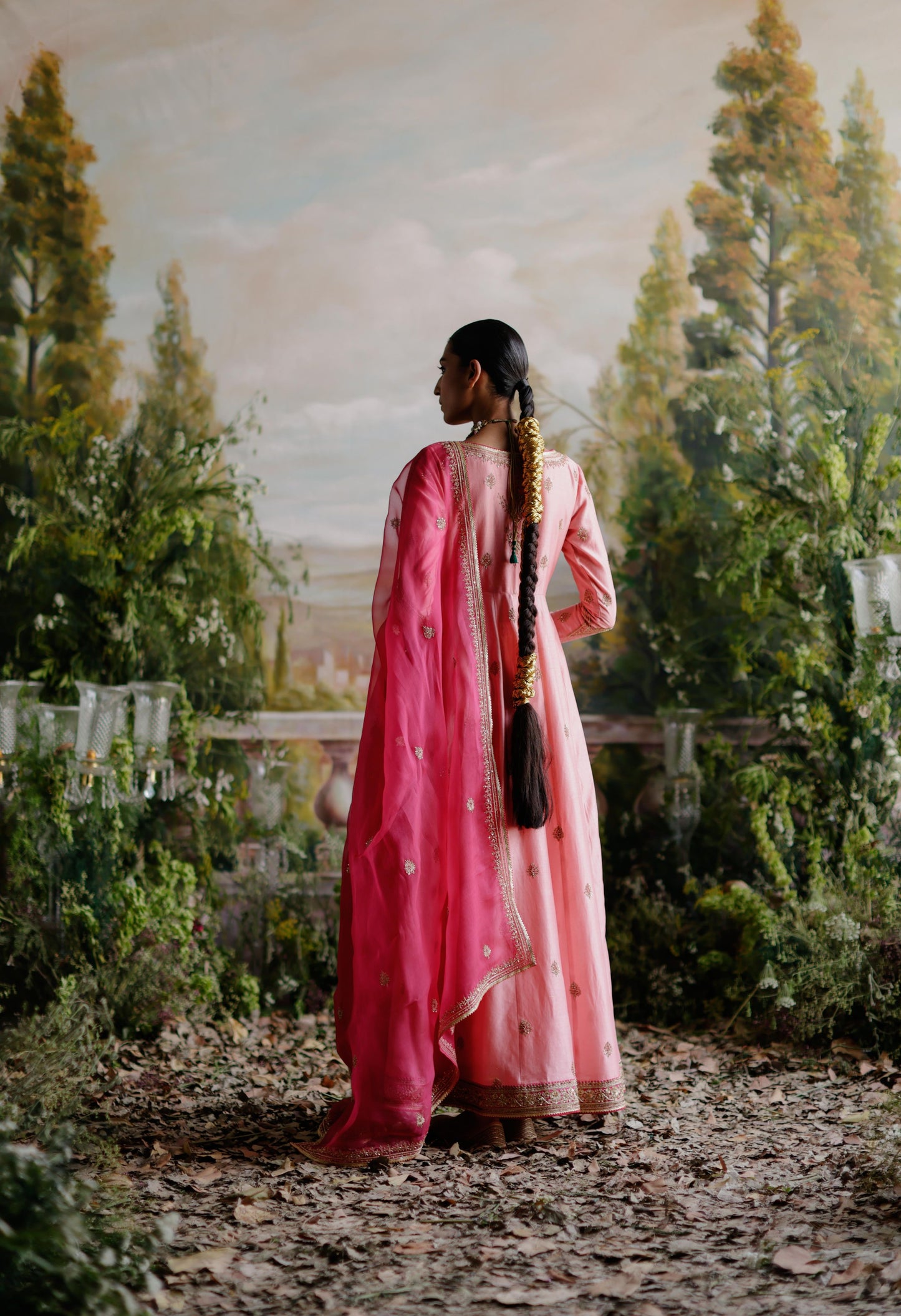 Meticulously Designed, The Jacket Features Intricate Aari Embroidery And Delicate Patterns That Pay Homage To The Timeless Artistry Of Indian Craftsmanship. The Candy Pink Hue Radiates Softness And Femininity, Making It A Versatile Piece That Exudes Grace. Paired With The Jacket Is An Organza Base Dupatta, Adorned With Antique Gold Dori That Adds A Touch Of Vintage Charm. This Ensemble Beautifully Harmonizes Tradition With Contemporary Aesthetics, Appealing To Those Who Appreciate The Delicate Balance Of Heritage And Modern Sensibilities. Whether You'Re Attending A Wedding, A Cultural Event, Or A Celebratory Gathering, The Candy Pink Jacket Set Will Ensure You Stand Out With A Sense Of Quiet Elegance.