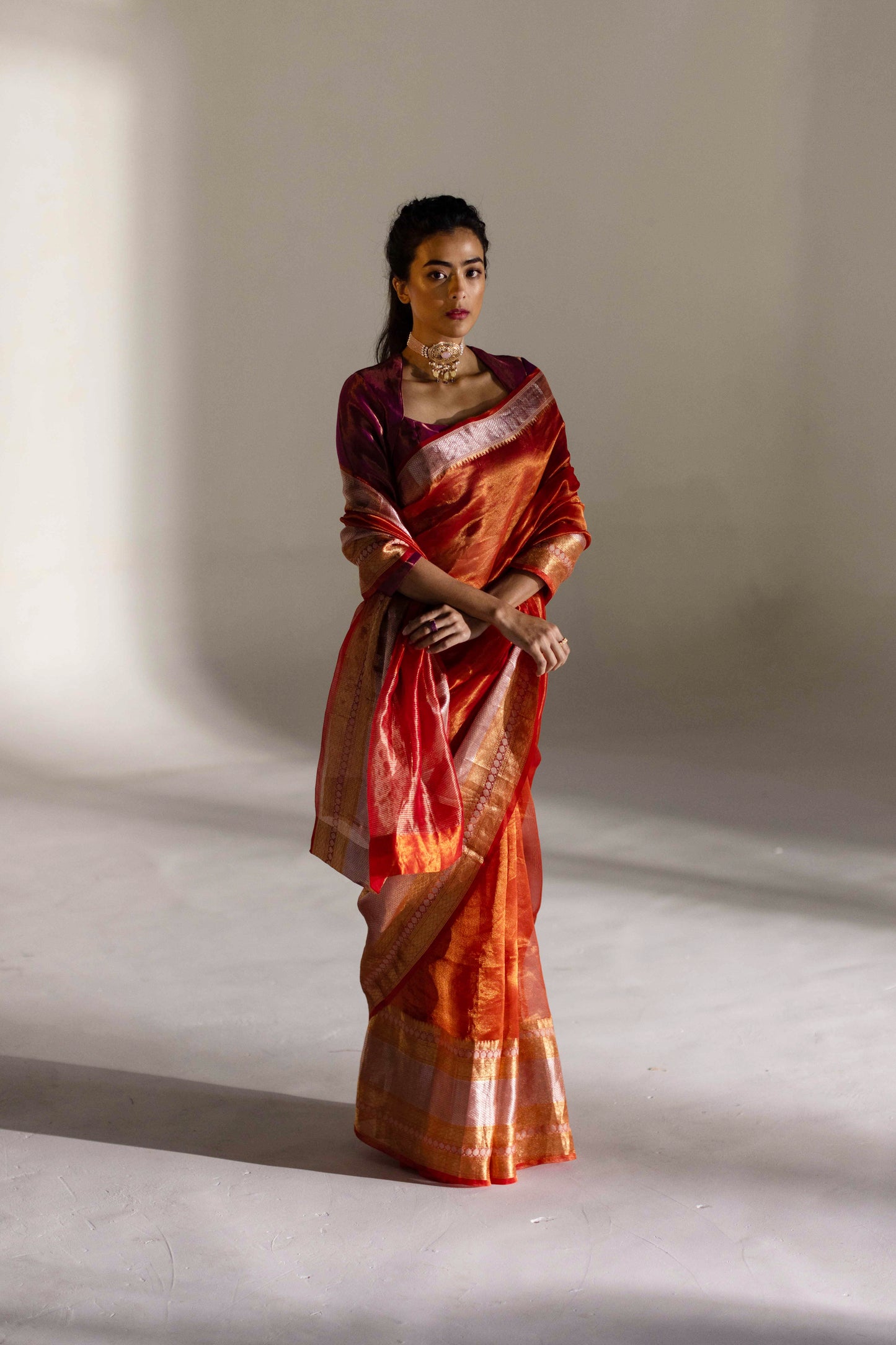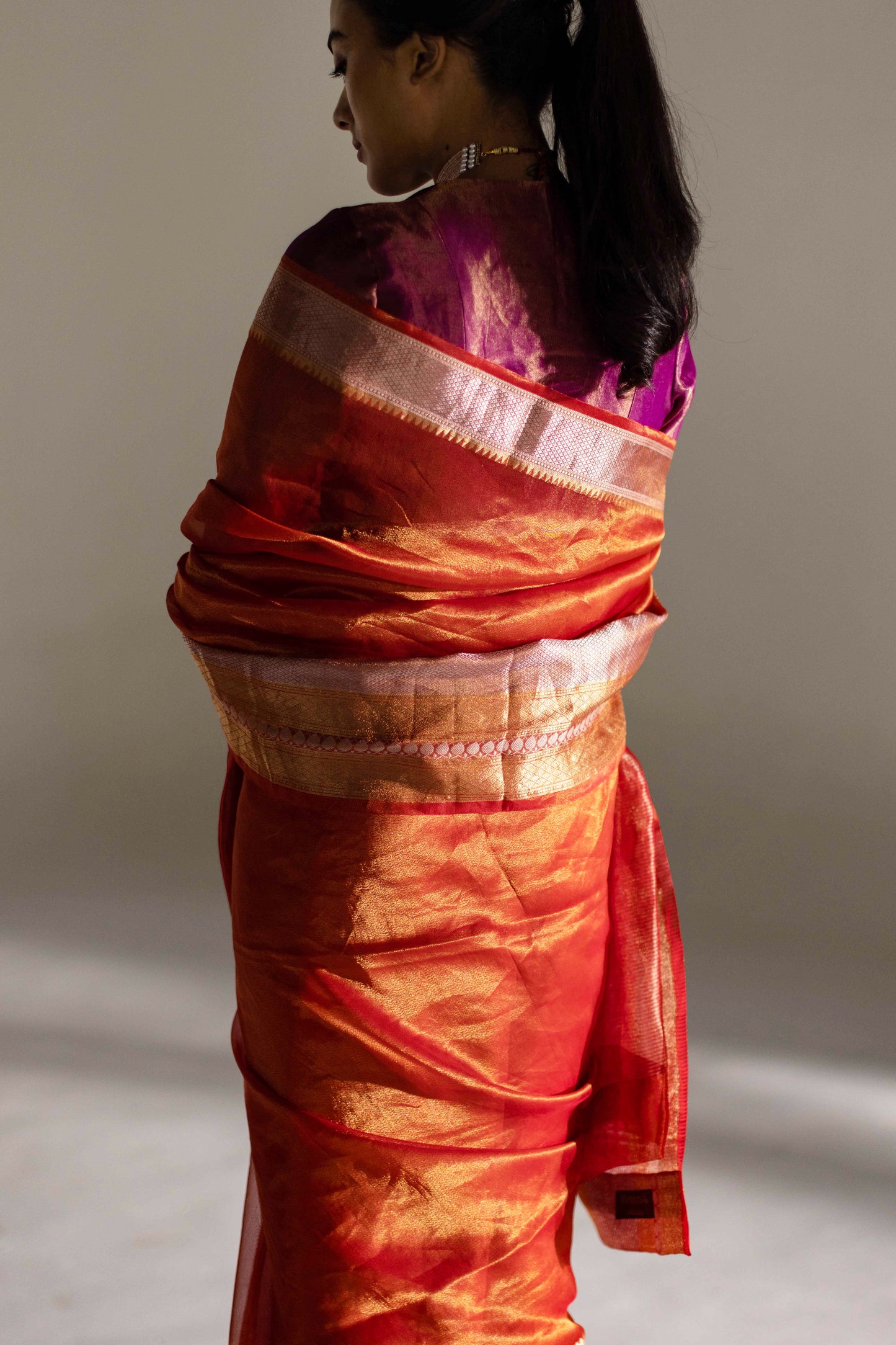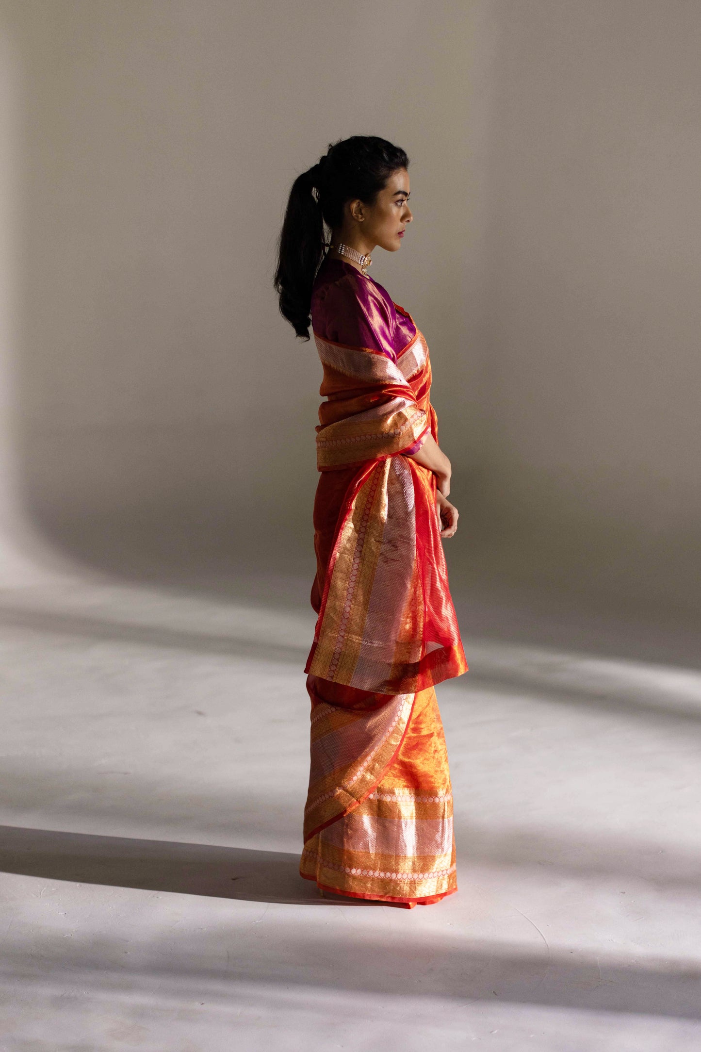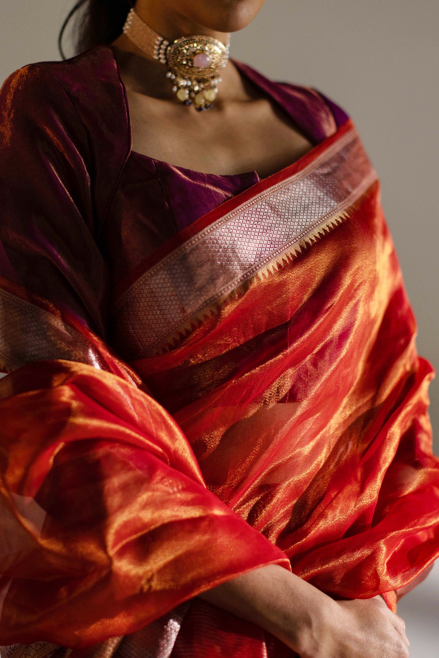 Woven In Tissue Silk, A Crimson Saree Paired With A Contrasting Purple Unstitched Blouse Epitomizes Intricate Embroidery On A Broad Border.