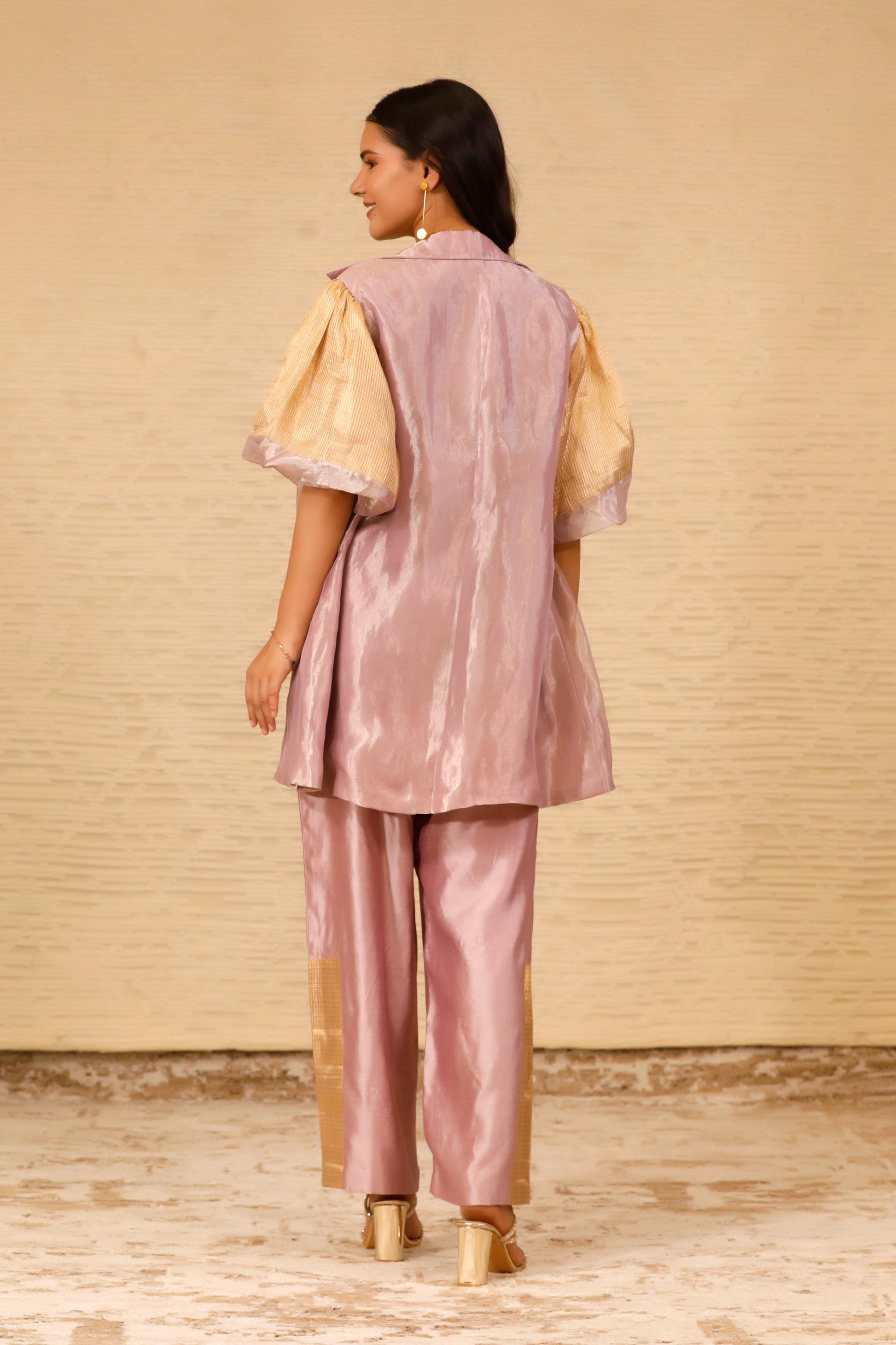 The Ensemble Showcases A Front-Open Tissue Jacket With Full-Length Sleeves, Extended Cuffs, And A Puffed Top Adorned With Gold Patchwork.