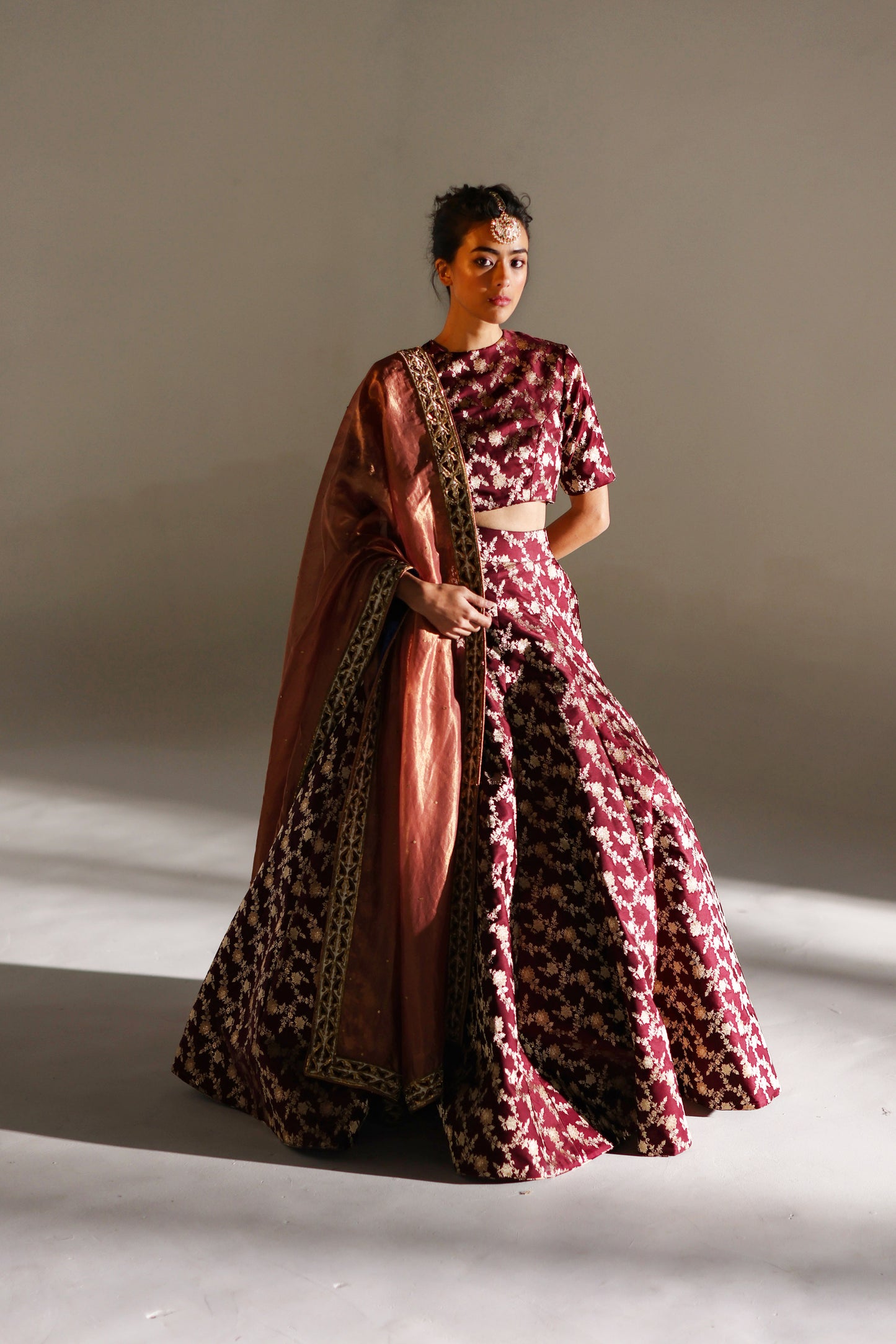 Woven In Satin Silk Brocade, The Garnet Lehenga And Blouse Feature Finely Detailed Embroidery Paired With A Pale Dupatta Epitomizing Broad Border Detailing.