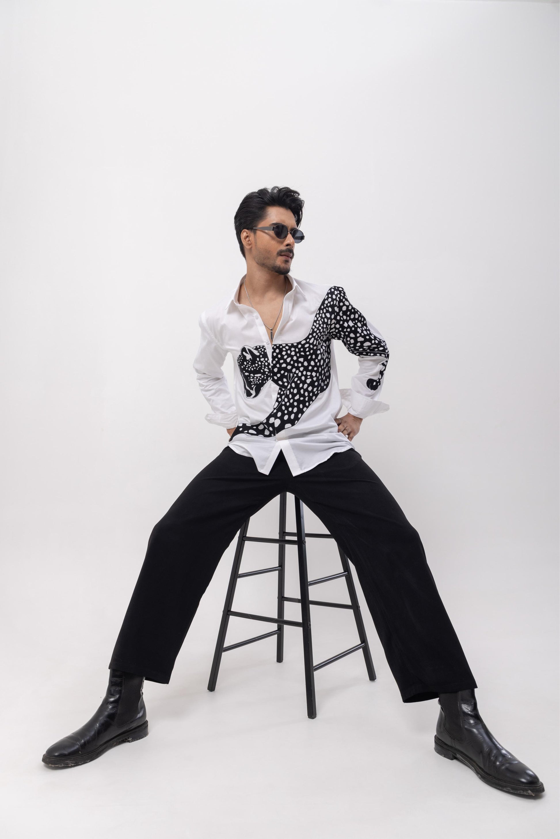 White English Cotton With A Fierce Black Leopard, Hand-Embroidered To Prowl In Elegance. Subtle Danger Never Looked This Refined.