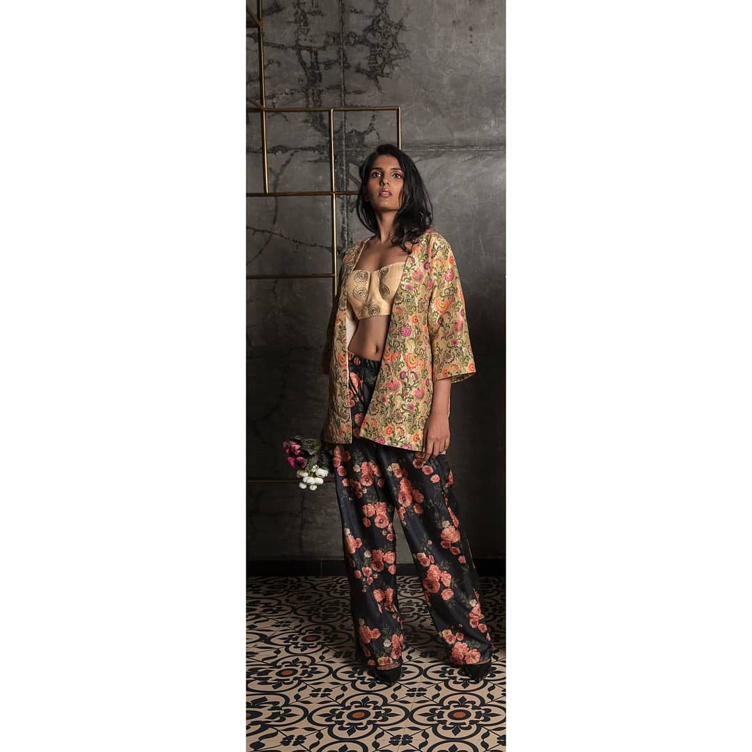 Look 10: Ecru Yellow Multicolor Floral Crinkled Brocade Jacket, With Beige Yellow Circle Embroidered Net Bustier And Dark Navy Blue Floral Printed Khadi Silk Palazzo Pants.