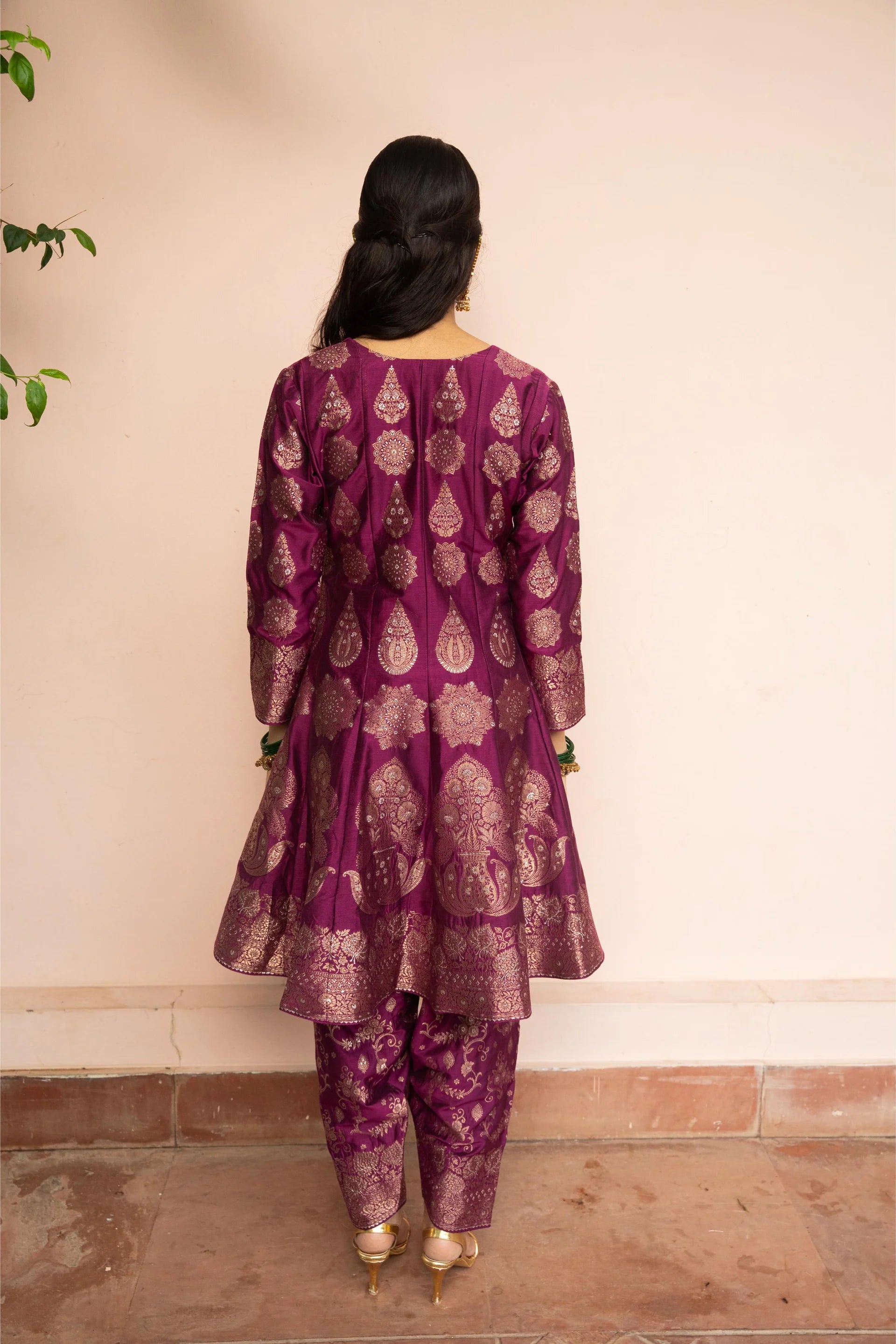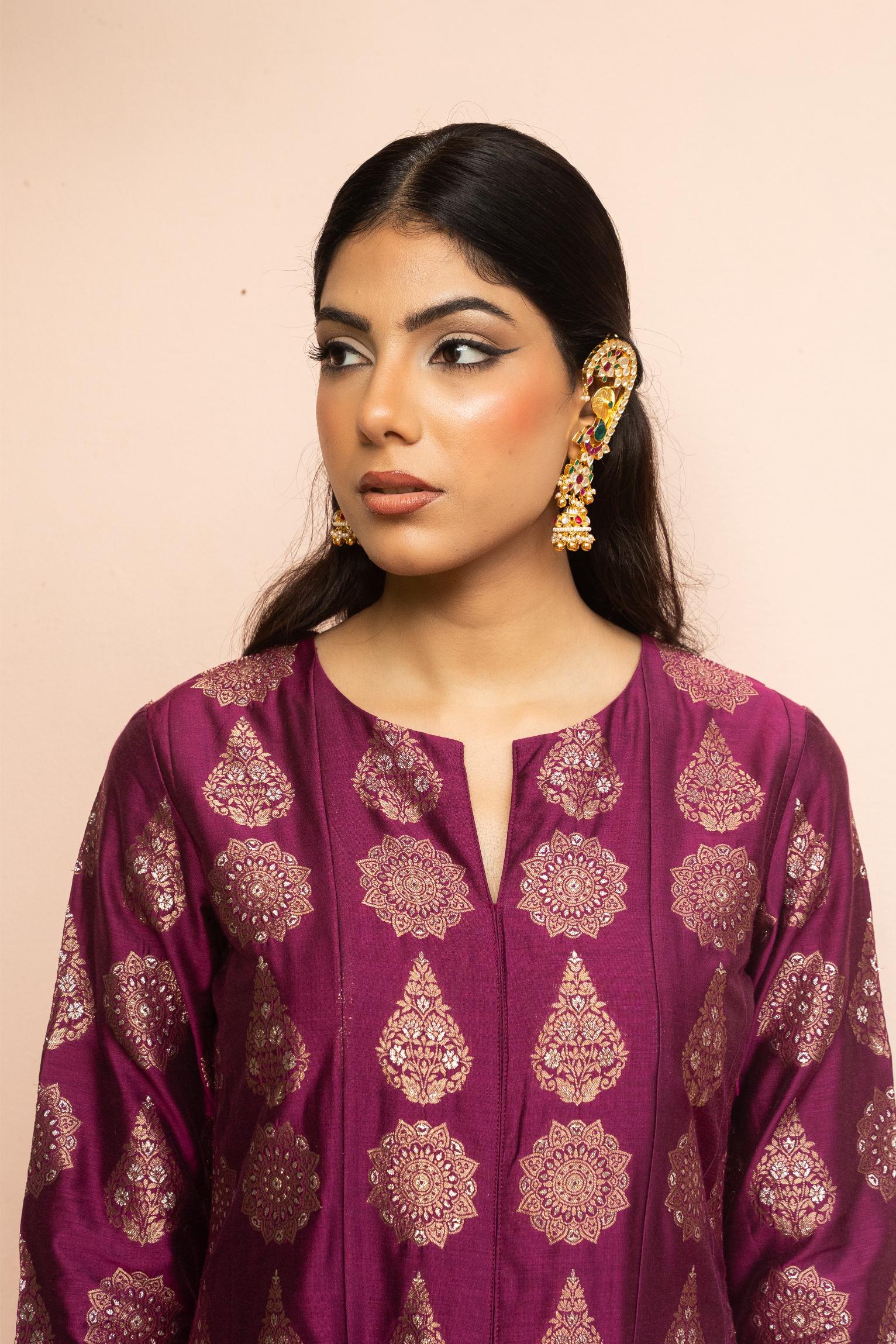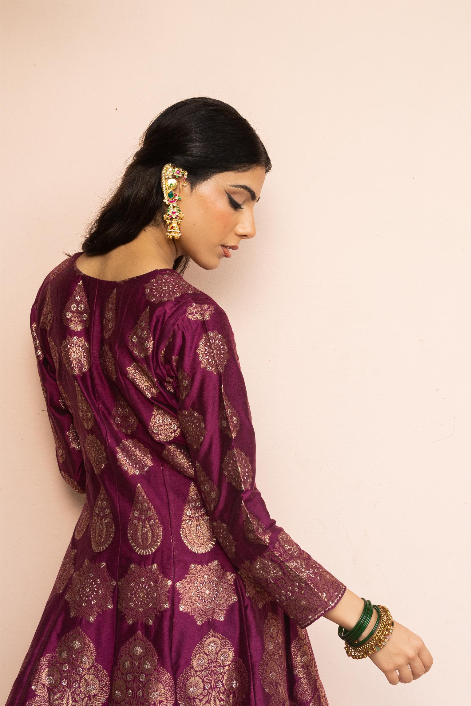 Chup Chup Ke Berry Anarkali In Vegan Silk Subtle Yet Striking, The Chup Chup Ke Anarkali Is Designed In A Deep Berry / Dark Magenta Hue, Crafted From Luxurious Vegan Silk. Enhanced With Zari Gota Weaving, This Ensemble Carries An Understated Elegance That Speaks Through Its Artistry. The Silhouette Features A Short Anarkali Paired With A Classic Salwaar, Blending Traditional Charm With Modern Ease. Perfect For Festive Gatherings, Intimate Weddings, Or Cultural Soirées, This Piece Is As Versatile As It Is Graceful.