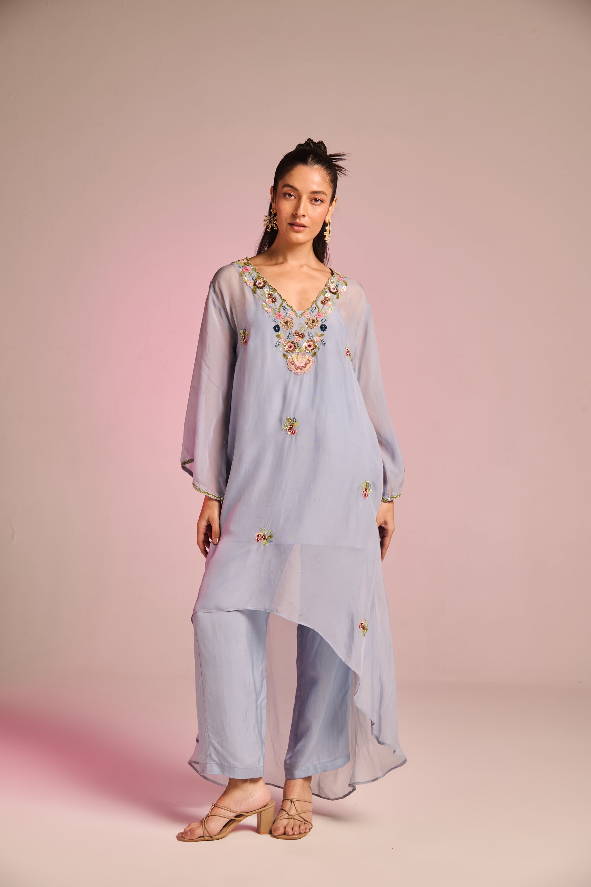 Step Into Style And Comfort This Summer. Featuring Delicate Multicolour Floral Embroidery On Neckline , Bringing Depth And Grace To The Design. The Trimmed Silhouette Adds A Soft Touch, While The Loose Sleeves With Intricate Detailing On Cuffs, Lending A Statement Appeal. Paired in Classic Combination With Pant , Making It A Wardrobe Essential For Any Season.